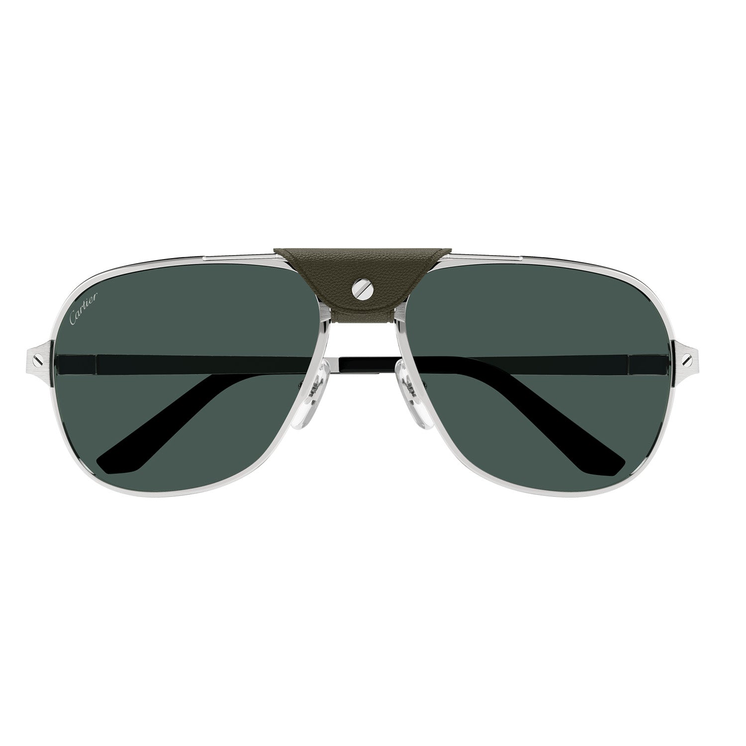 Masculine navigator shape in full rim construction embellished with the leather sweat band for a bold and masculine look. Iconic Santos screws on the Santos Classic temples. Cartier logo engraved on the temples and Double C Décor signature on the nose pads. Precious finish in gold or platinum.