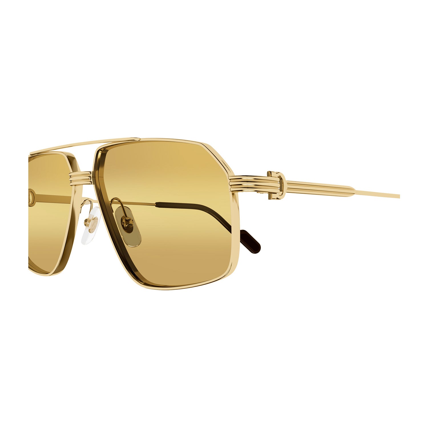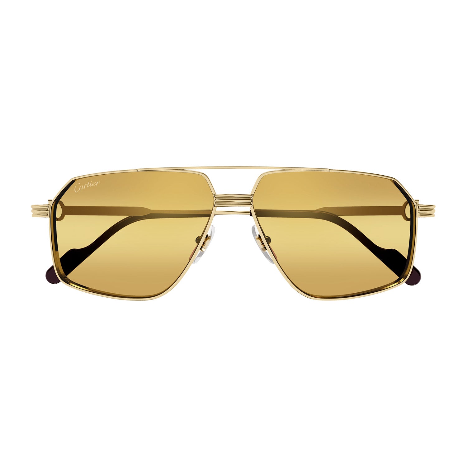 Masculine navigator shape in a new bolder construction for a vintage appeal. Iconic combination of the Godron and the C de Cartier as aesthetical and functional element of the hinge. Prèmiere dedicated Zaiss colourful lenses with light gold flash effect and red anti-reflective coating. Cartier logo lasered on metal temple tips and Double C Décor signature on the nose pads.