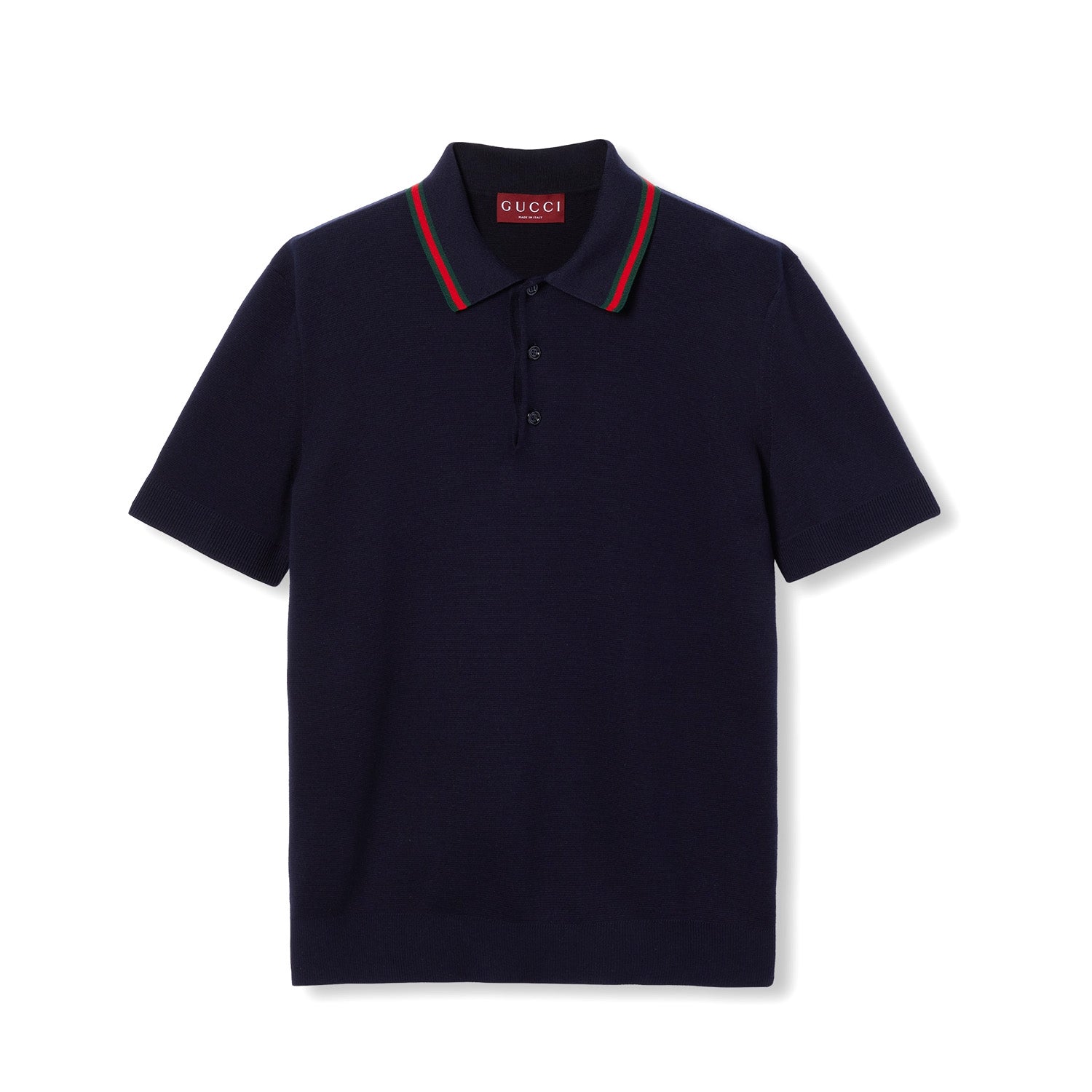 Gucci's House codes continue to evolve for the new season across jersey pieces. This polo shirt is presented in a silk cotton knit and enriched with a green and red Web trim and Gucci intarsia.