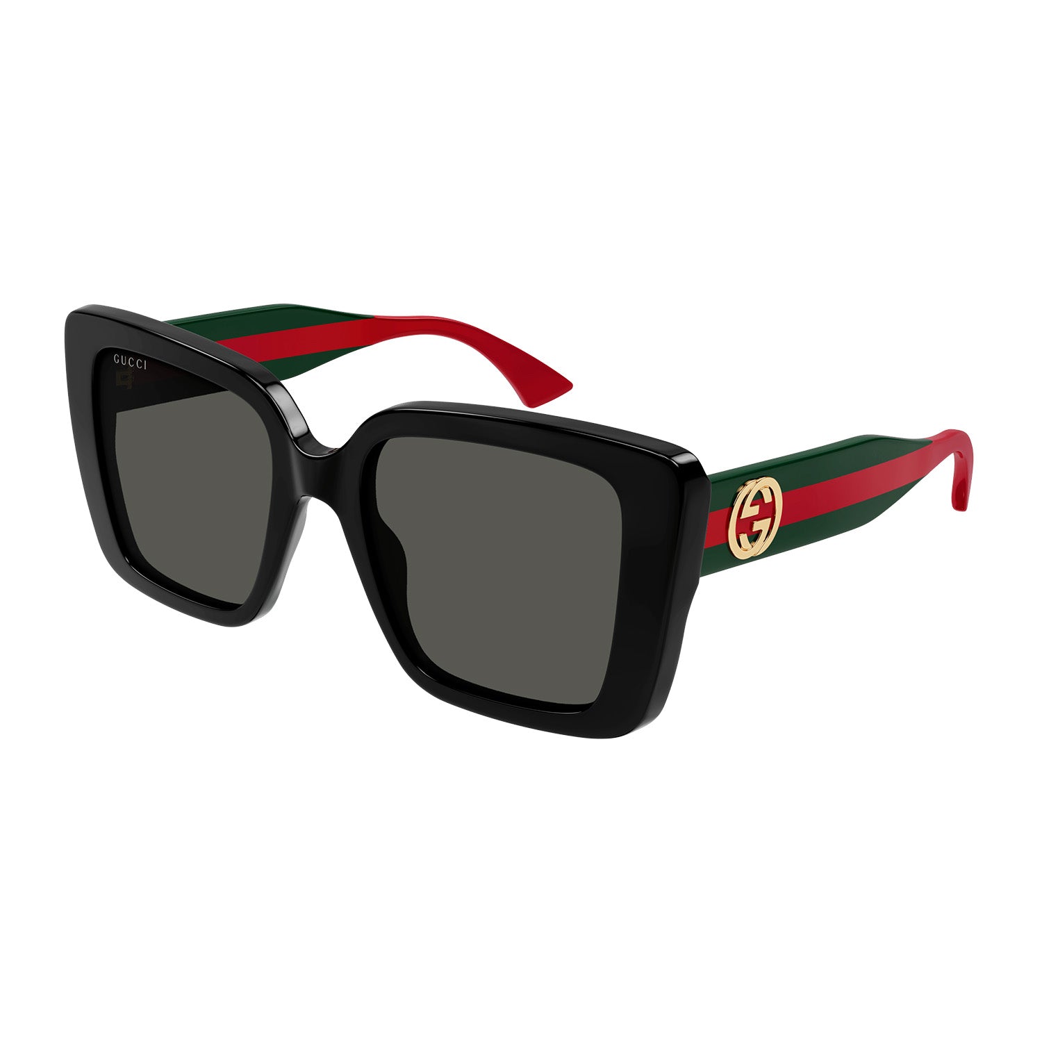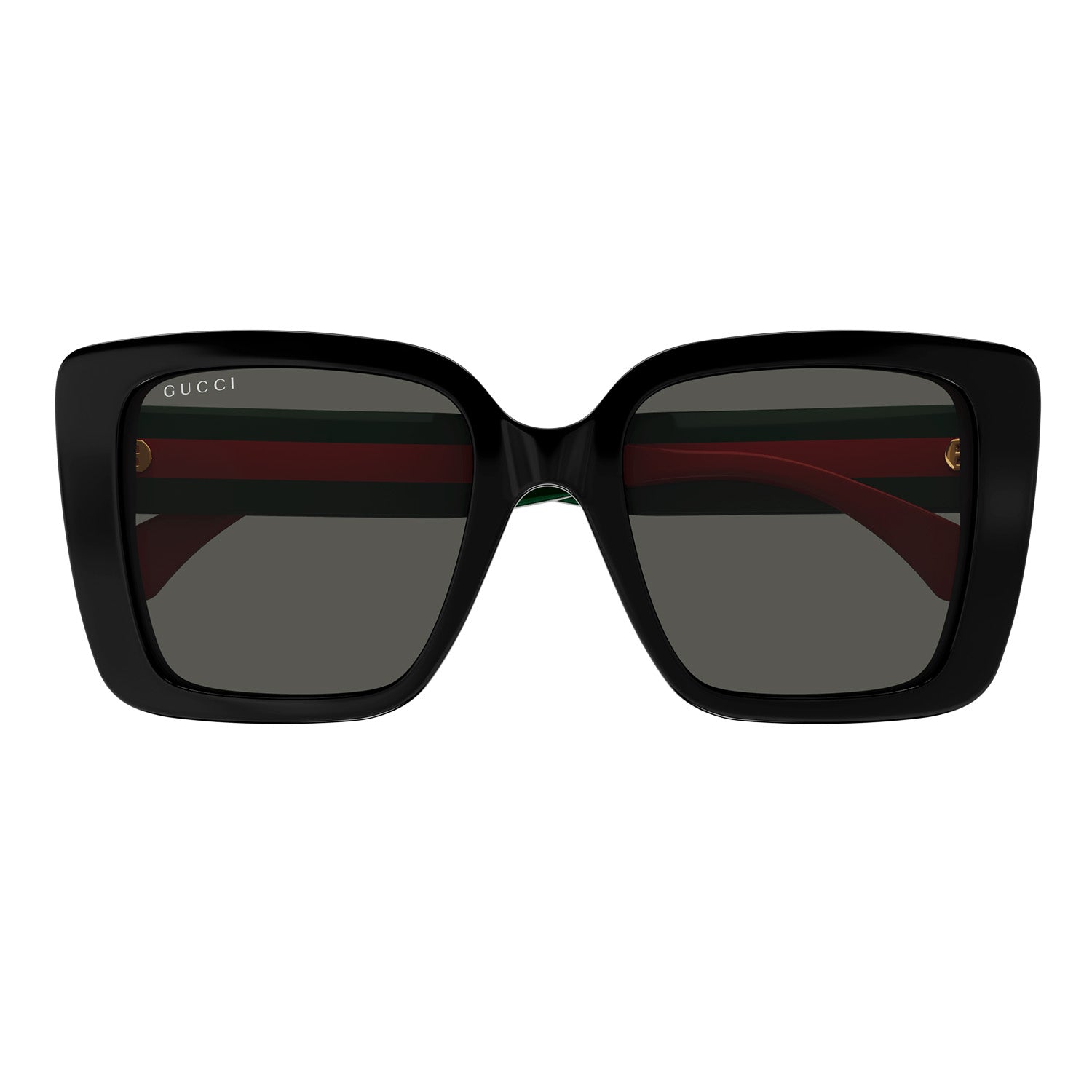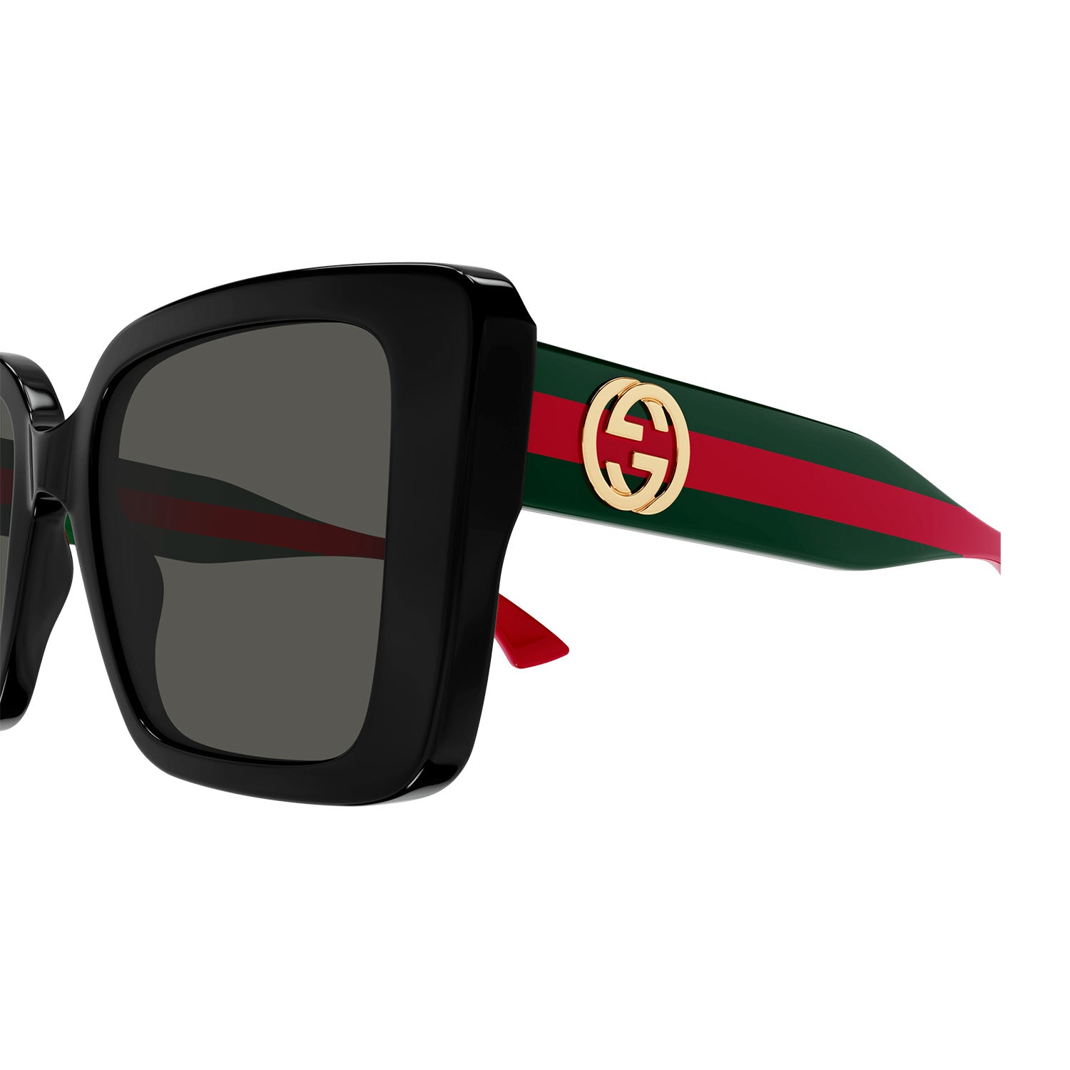 Commercial shape with the web detail on a medium temple. Butterfly oversize shape. Sabato De Sarno's new lettering logo extremely visible on the side view in gold and silver. Commercial yet cool color palette featuring institutional Green-Red-Green and Blue-Red-Blue web temples.