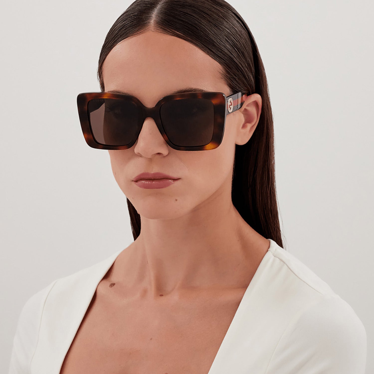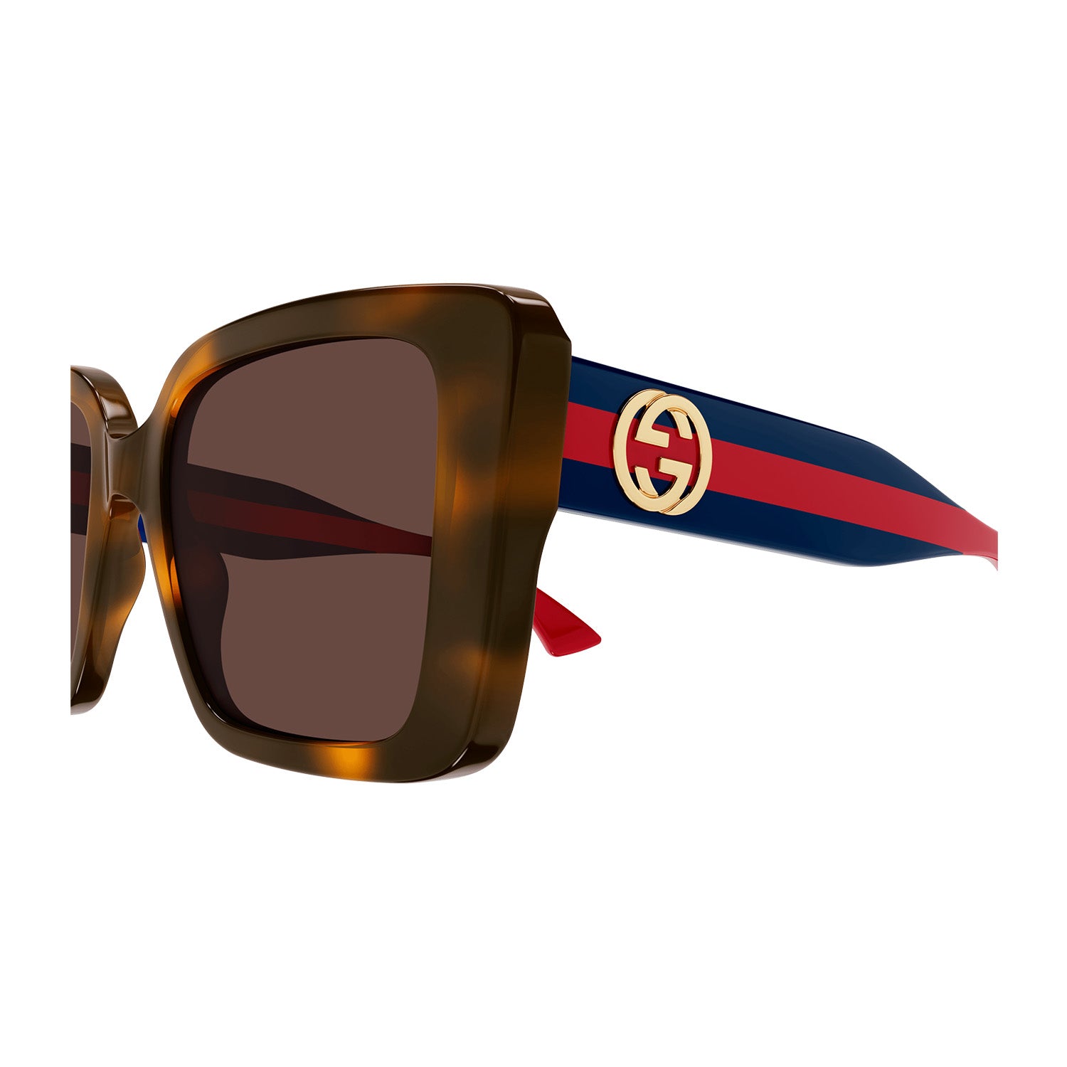 Commercial shape with the web detail on a medium temple. Butterfly oversize shape. Sabato De Sarno's new lettering logo extremely visible on the side view in gold and silver. Commercial yet cool color palette featuring institutional Green-Red-Green and Blue-Red-Blue web temples.