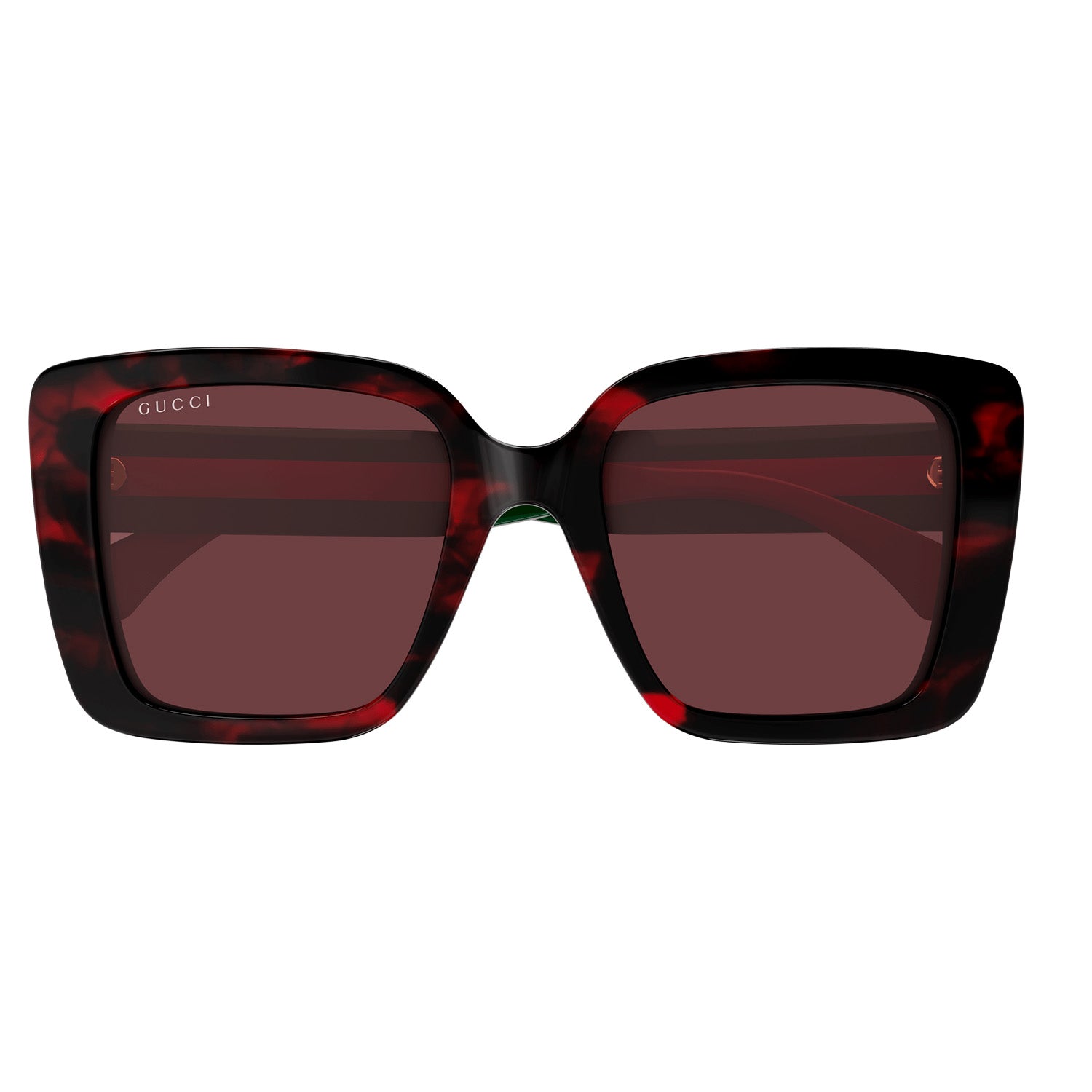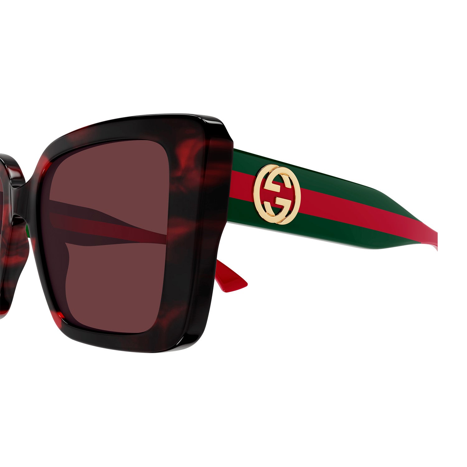 Commercial shape with the web detail on a medium temple. Butterfly oversize shape. Sabato De Sarno's new lettering logo extremely visible on the side view in gold and silver. Commercial yet cool color palette featuring institutional Green-Red-Green and Blue-Red-Blue web temples.