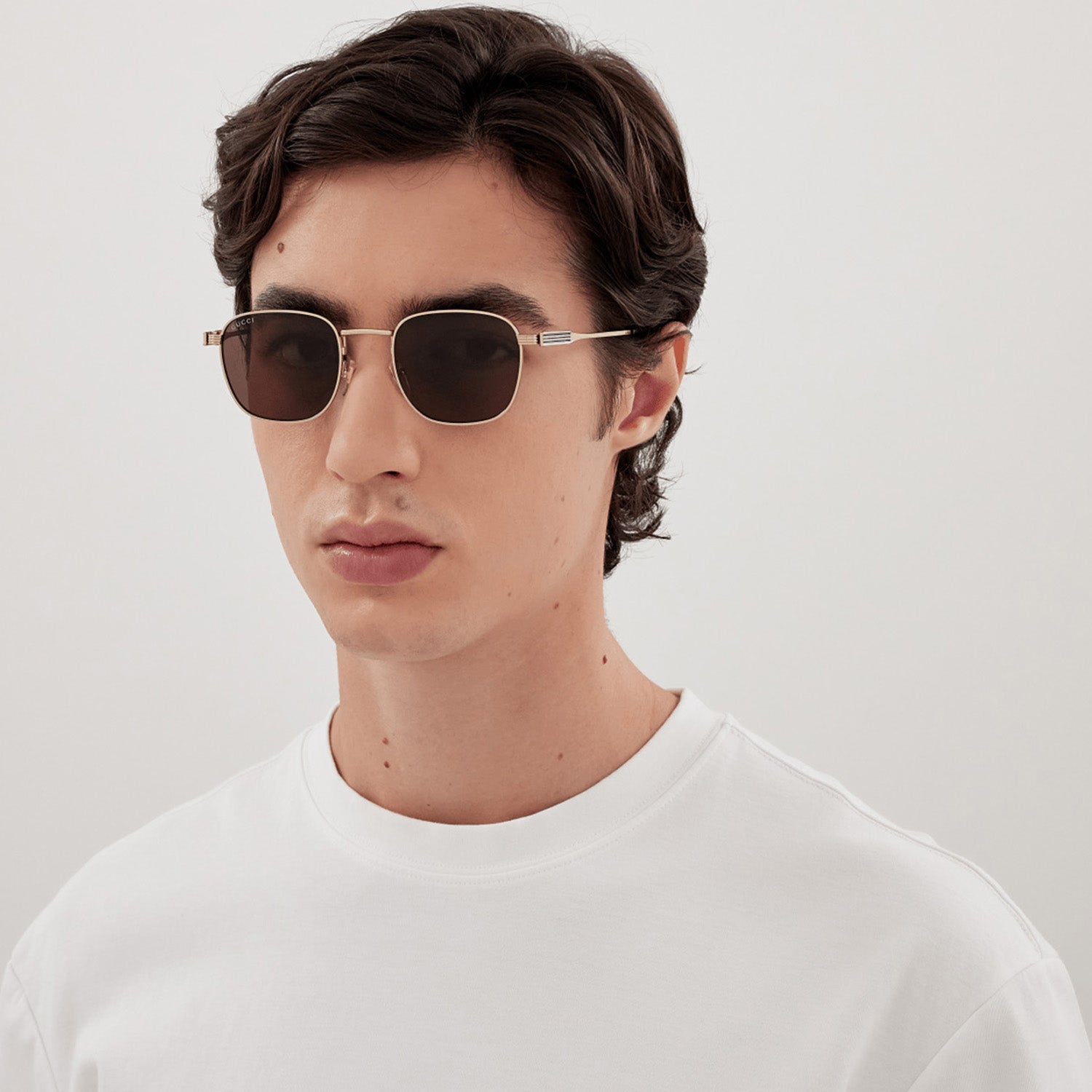 Commercial light metal styles with a sporty feel and web detail on temple. Squared shape. Gucci lettering logo - enameled web detail on the engraved lines on temple. Masculine yet cool and sporty colors.