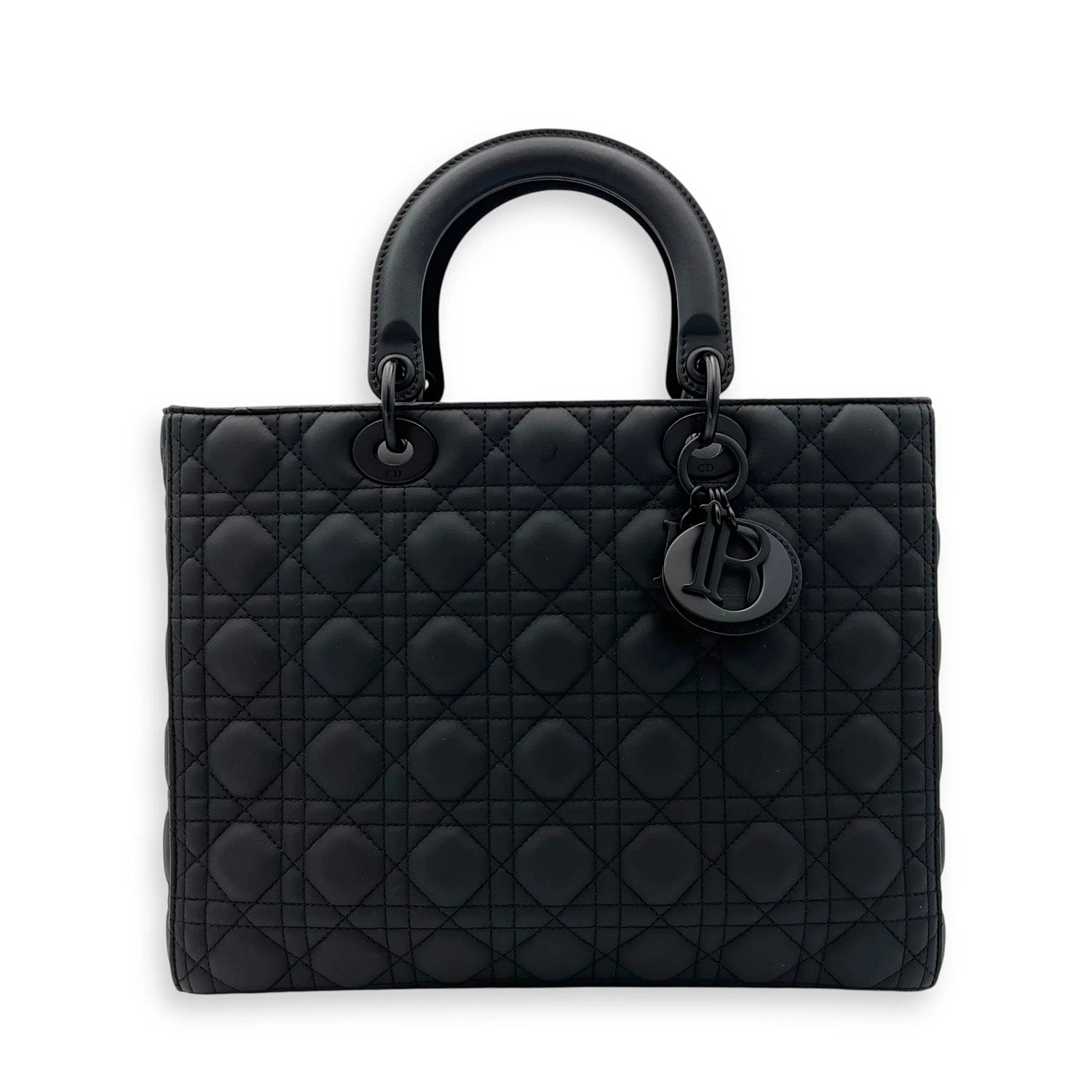 The Lady Dior handbag epitomizes the House's vision of elegance and beauty. Sleek and refined, the timeless yet relevant style is crafted in black ultramatte calfskin with Cannage stitching, creating the instantly recognizable quilted texture. The tonal metal D.I.O.R. charms offer an elegant allure. Featuring a thin, removable leather shoulder strap, the large Lady Dior bag can be carried by hand, worn over the shoulder or crossbody. Thin, removable and adjustable shoulder strap Interior zip pocket Large patch pocket The bag may be paired with different embroidered straps Dust bag included Made in Italy
