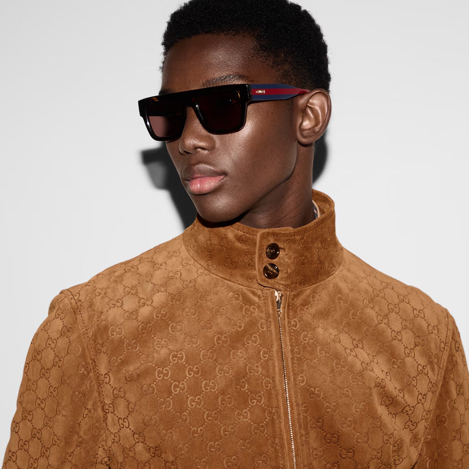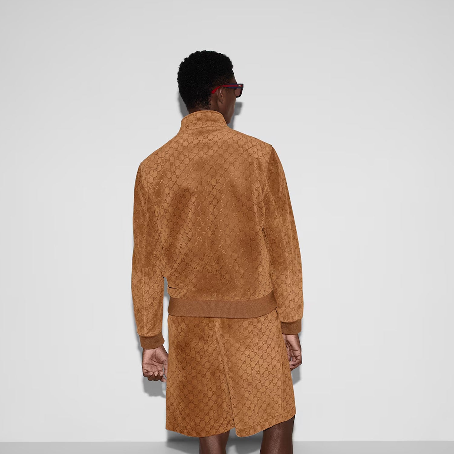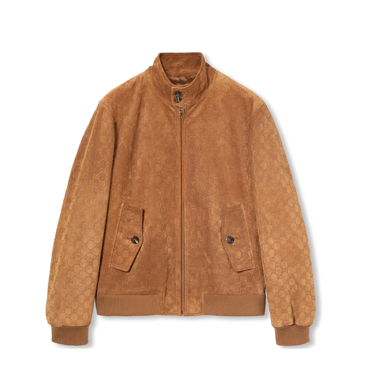 Cruise 2025 introduces jackets and statement pieces in shades of brown and camel. Paired with delicate pastel shades and light fabrics, the mix of textures and colors creates a dynamic look. This bomber jacket is presented in an embossed GG suede and completed with a stand collar with snap button closure.