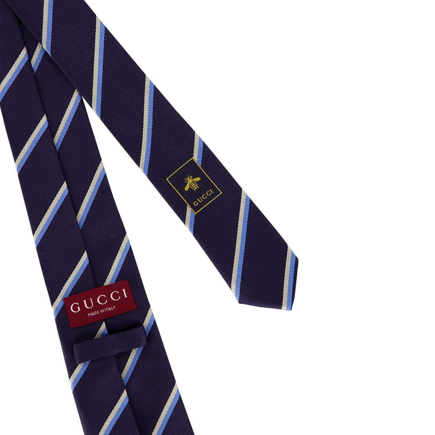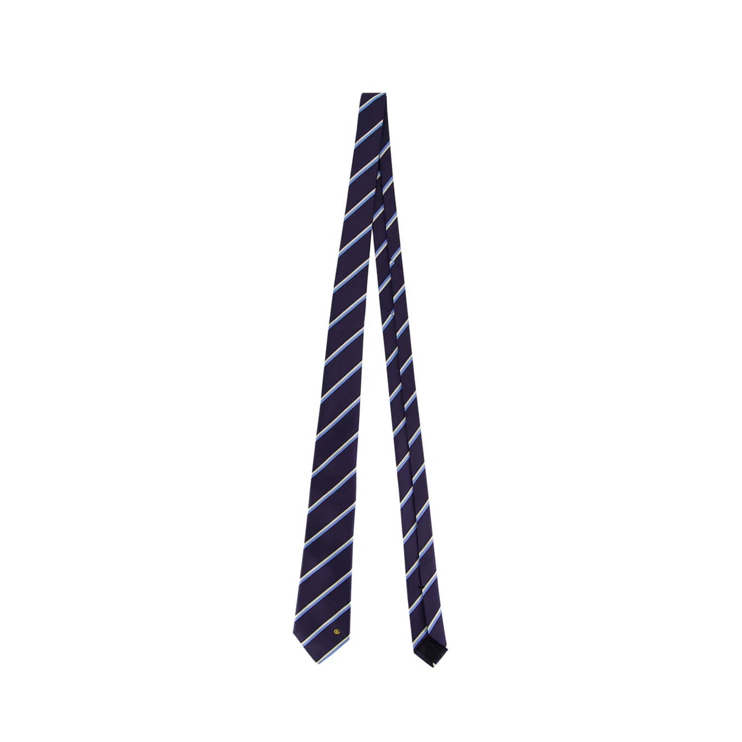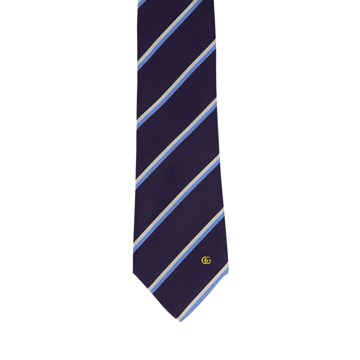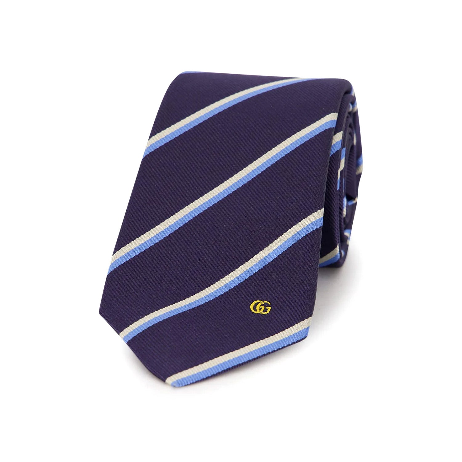 We present a silk tie by Gucci, which epitomizes refined style and sophistication. The dominant navy color harmonizes with diagonal stripes in light blue and beige shades, creating a subtle and classic pattern.