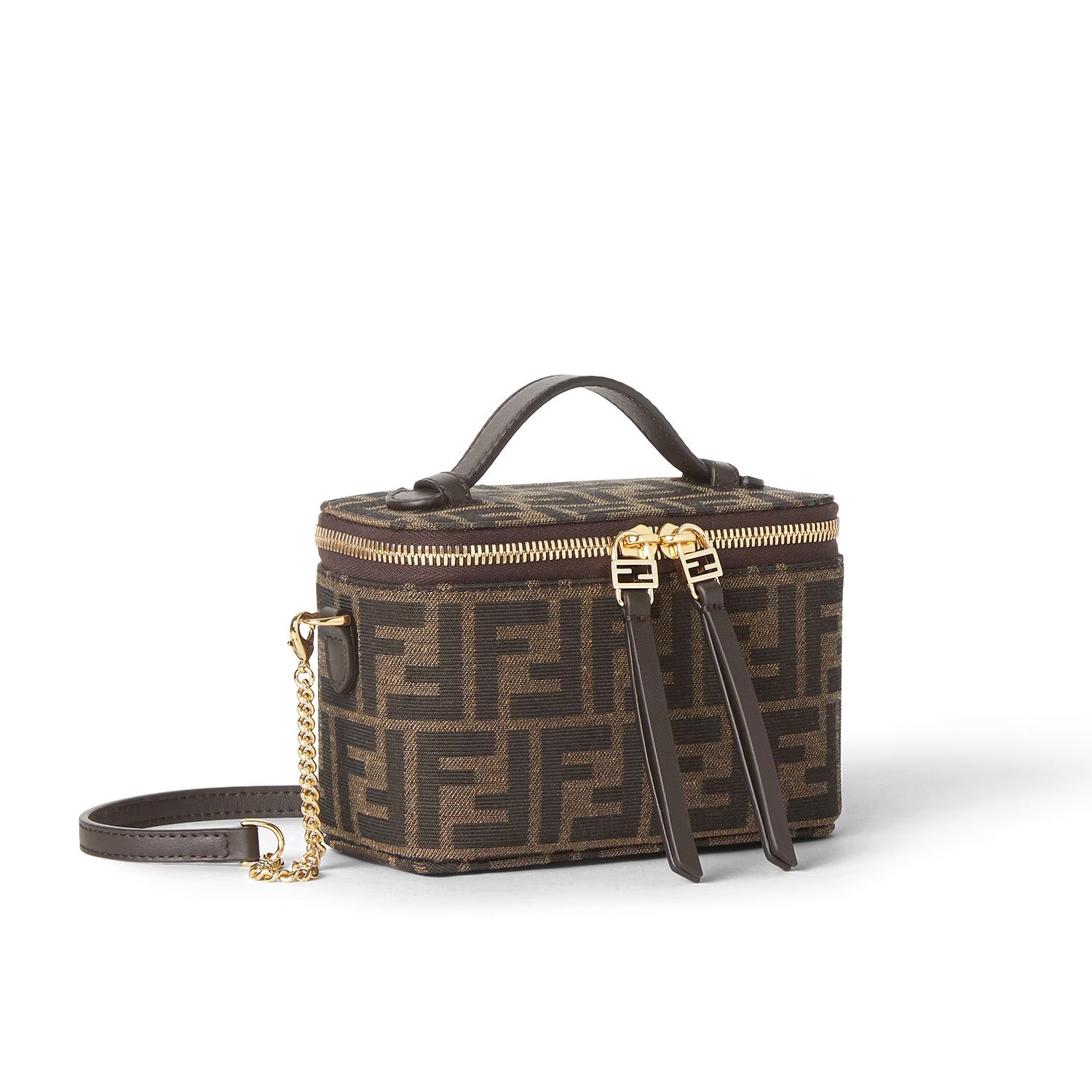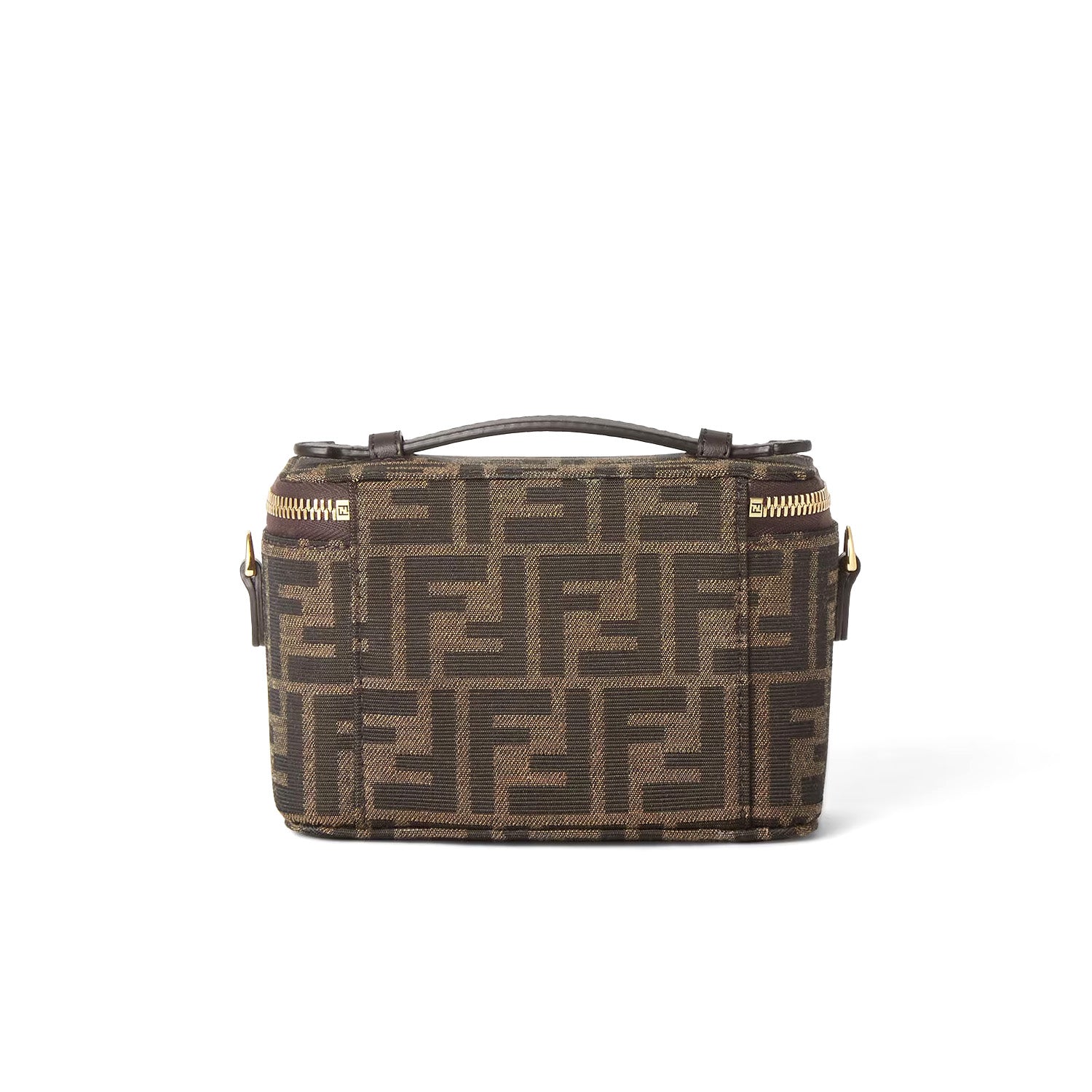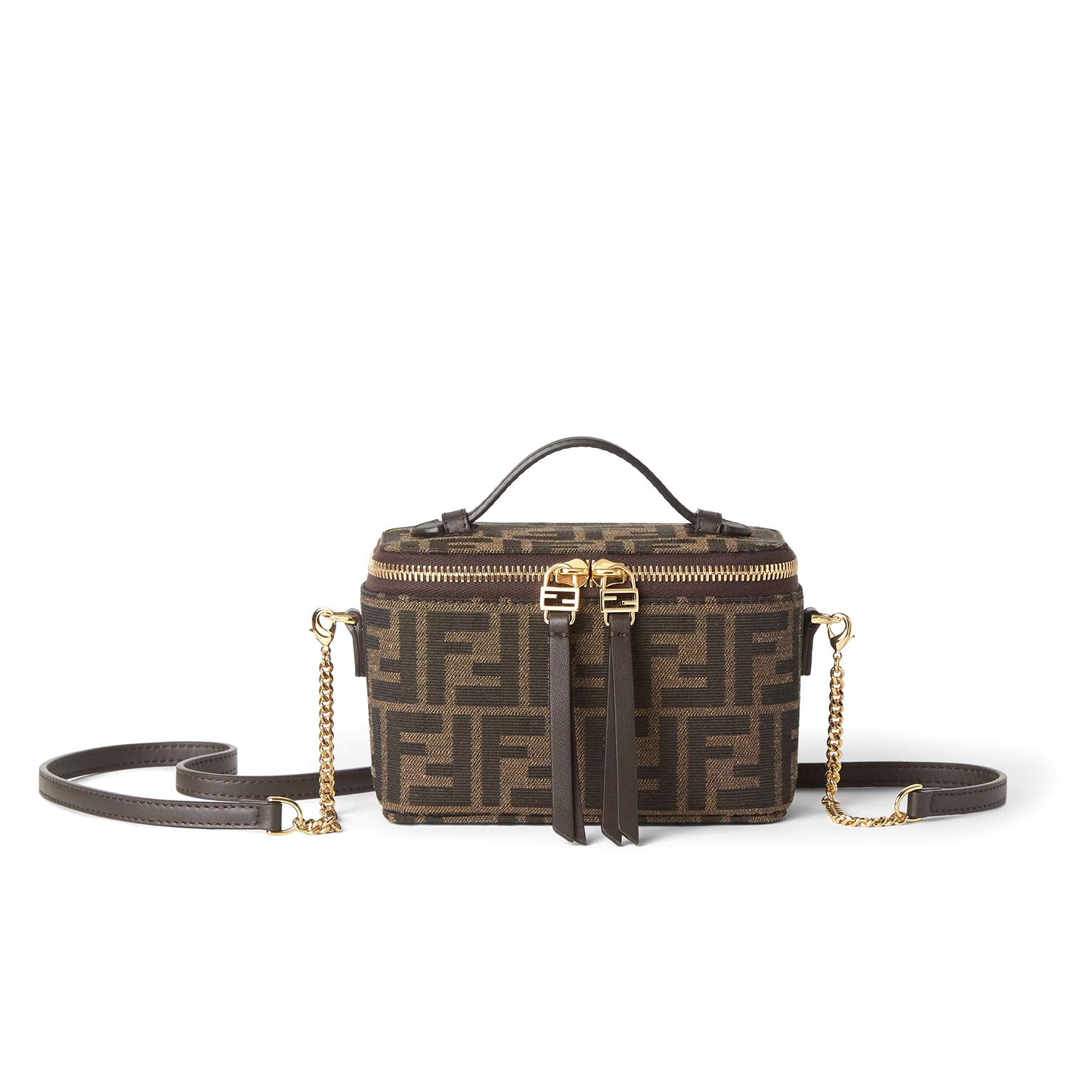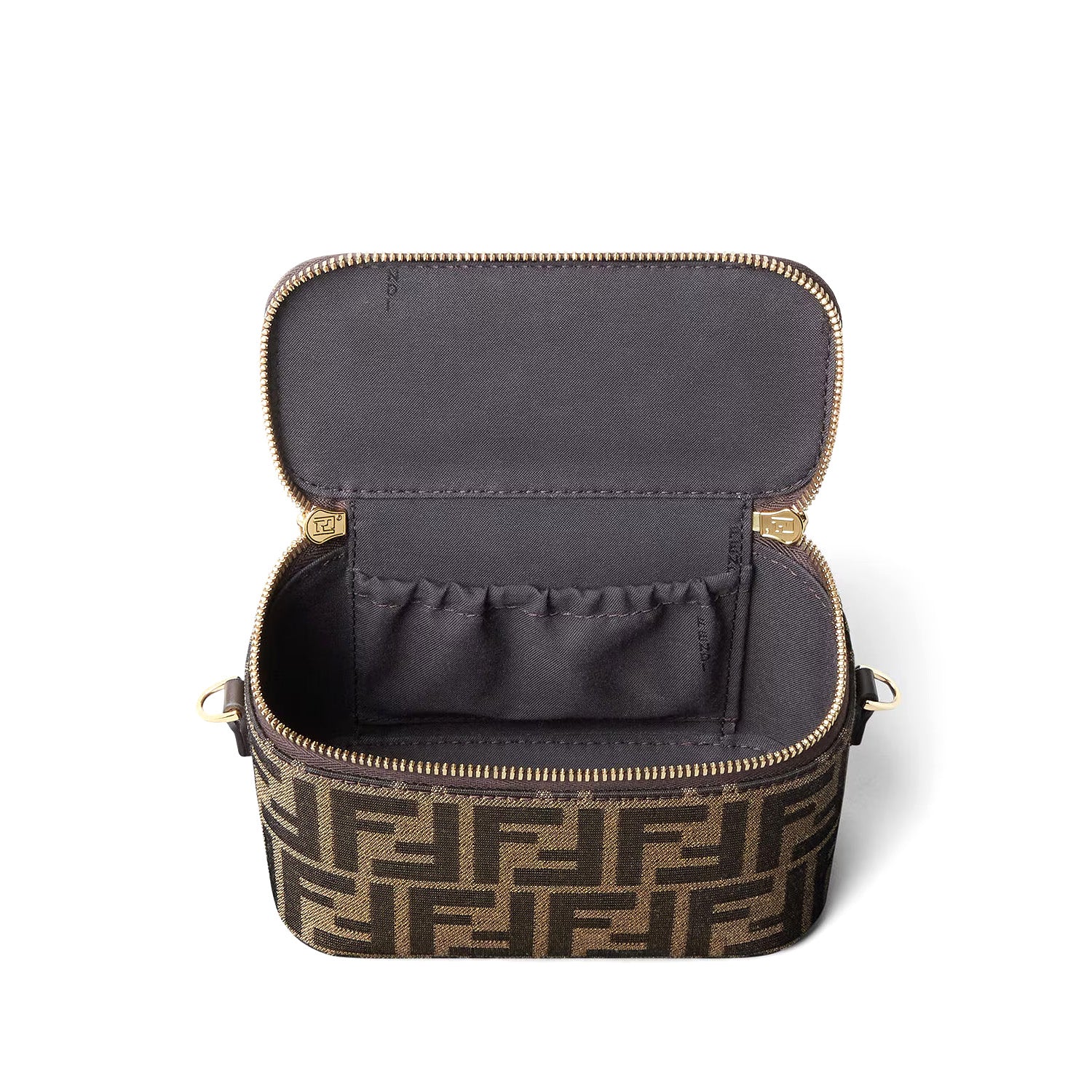 Compact and structured Fendi Vanity bag, featuring a double-slider zipper closure embellished with FF details and a leather zip pull.