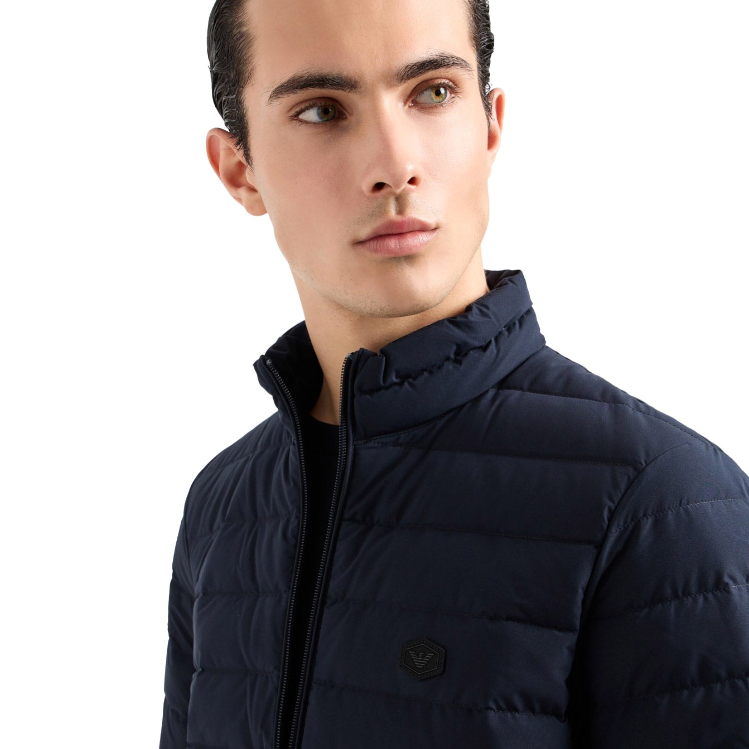 Nylon down jacket with full-zip fastening and eagle patch on the chest. The simple, modern nature of this men’s down jacket is enhanced by genuine feather padding and a matelassé effect. The perfect item for urban day wear. This item belongs to the Essentials clothing selection, the Emporio Armani capsule collection that is an evergreen statement of style: an ongoing collection with clean, well-designed shapes for a wardrobe that meets the demands of any season. These “essential”, versatile pieces are a must-have for the male wardrobe.