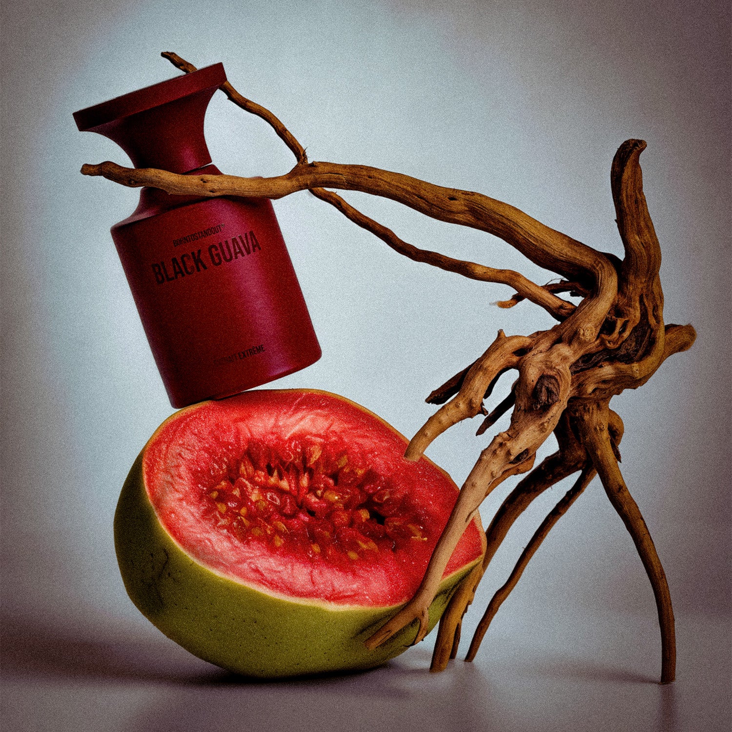 The fragrance bursts with the juicy brightness of guava, spiced with cardamom and the zesty kick of manda rin from Madagascar. As the heart unfolds, the floral elegance of rose and geranium is consumed by the dark richness of oud, creating a stunning contrast of sweet and smoky. In the base, earthy patchouli, smoky cypriol, and the animalic allure of grey amber form a brooding, resinous foundation. Together, these elements create a fragrance that feels alive—a captivating interplay of radiance and shadow
