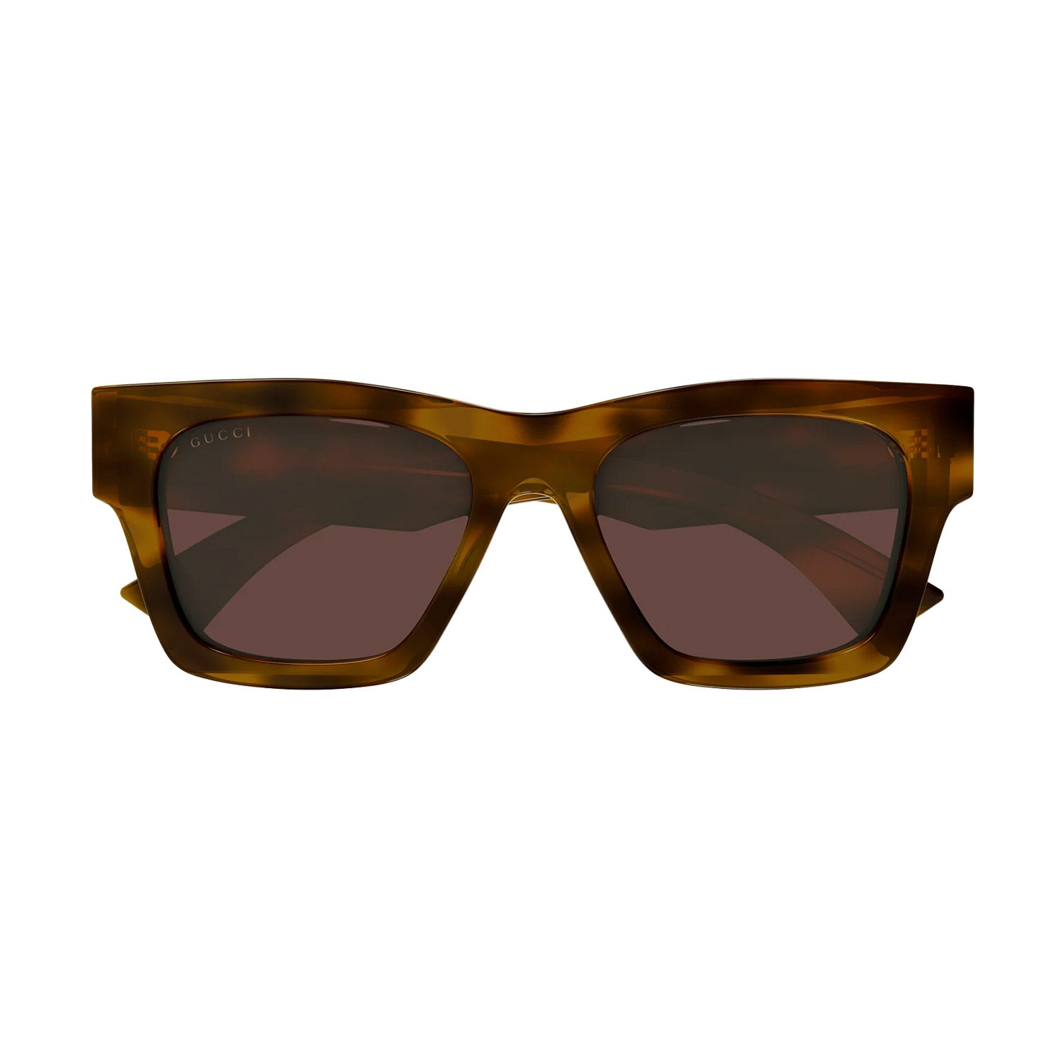 Acetate styles featuring bold lines vivid colors and a pantostopic angle. Squared cat-eye shape. Tridimensional Gucci lettering logo on the temple. Playful color palette featurimg both solid and Guccissima lenses.