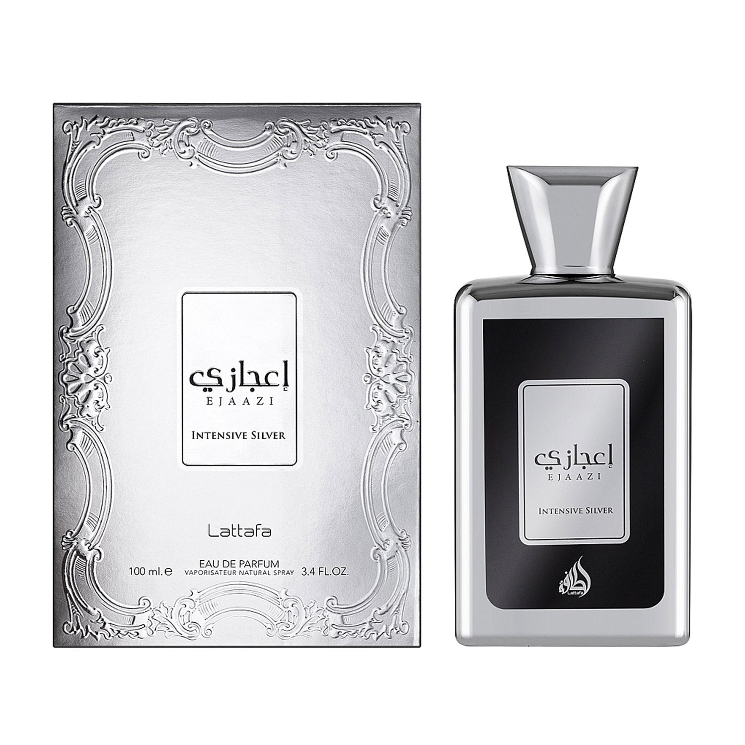 Ejaazi Intensive Silver by Lattafa Perfumes is a Aromatic Fruity fragrance for women and men. Ejaazi Intensive Silver was launched in 2021. Top notes are Mandarin Orange and Grapefruit; middle notes are Sea Notes and Cedar; base notes are Amber and Moss.