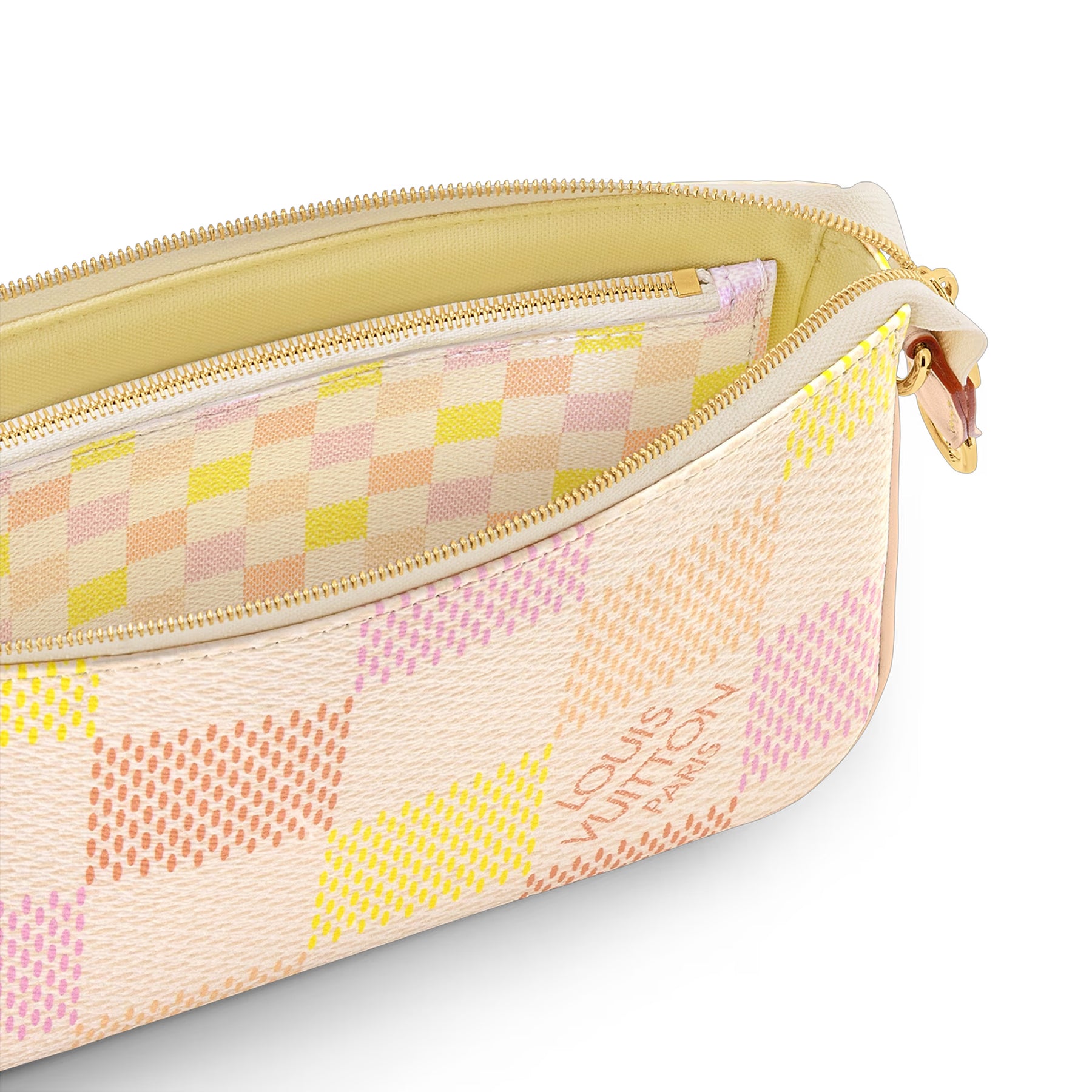 For the Damierlicious collection, the Pochette Accessoires comes in Damier canvas, which is reinterpreted in soft pastel shades and trimmed with Louis Vuitton's emblematic natural leather. This chic, feminine pouch unzips to reveal a large compartment with three pockets and two card slots. Its removable leather strap and gold-tone chain offer different looks and carry options.