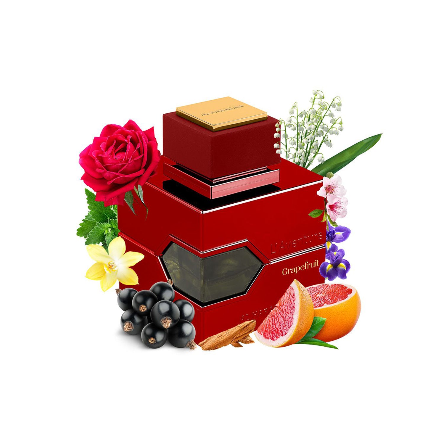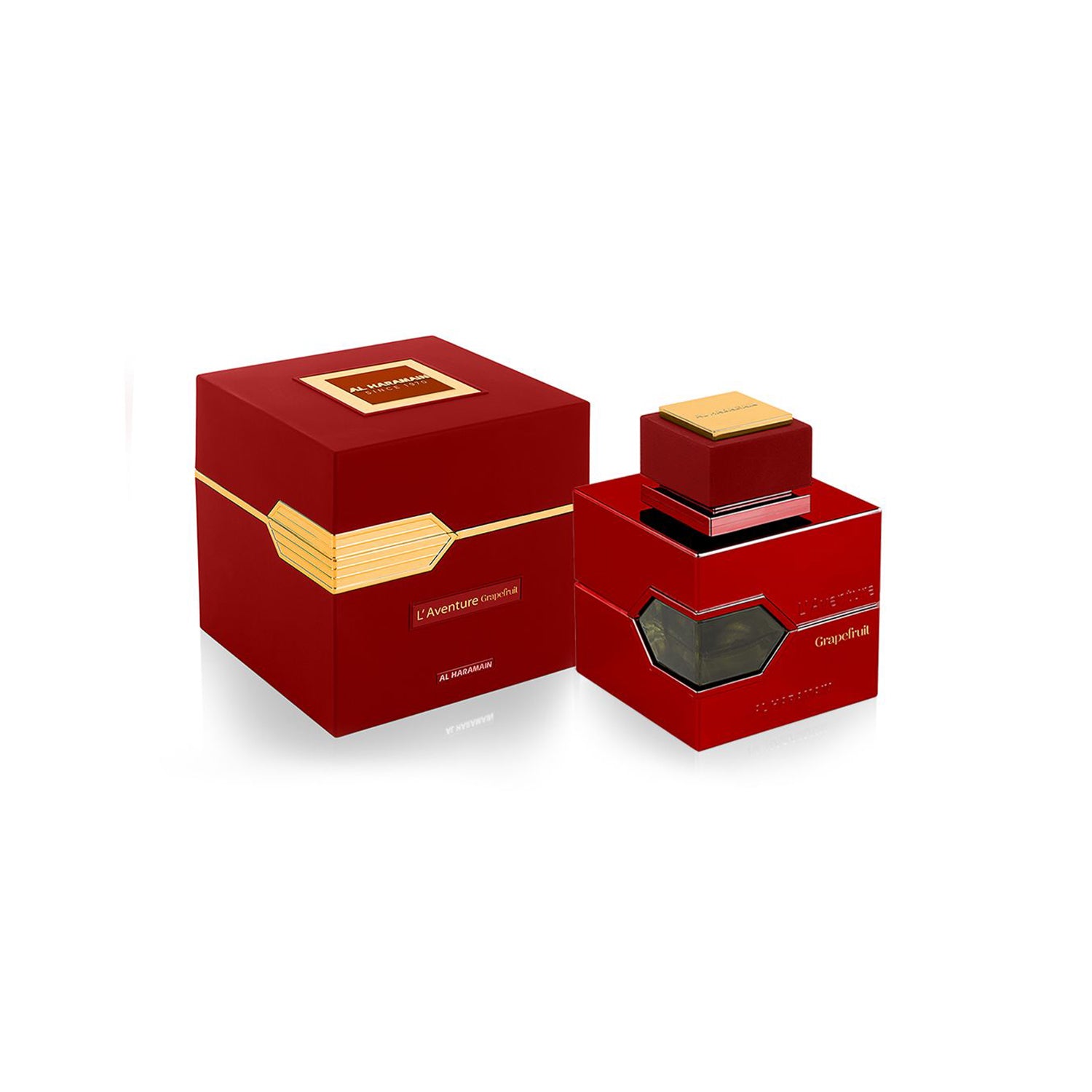 Haramain L'Aventure Grapefruit is your passport to a world of unmatched charm, a fragrant masterpiece that weaves the vibrancy of sun-kissed grapefruits into an aromatic masterpiece. The initial burst is a juicy symphony of grapefruit with red berries. black currant, and litchi, an exhilarating dance on your skin that captivates the senses. It is a journey of elegance as Melon. Almond Blossom. Iris. Freesia. Magnolia. Jasmine. Rose. and Lily of the Valley join the celebration. it is adding a touch of sophistication. But it doesn't stop there the lingering base notes of caramel. vanilla. patchouli, benzoin. sandalwood. musk and vetiver under- tones ensure that this enchantment endures. it is creating an aura of irresistible charm throughout the day. Embrace the extraordinary, let each note be a celebration. and make every moment an adventure in elegance and spirit.