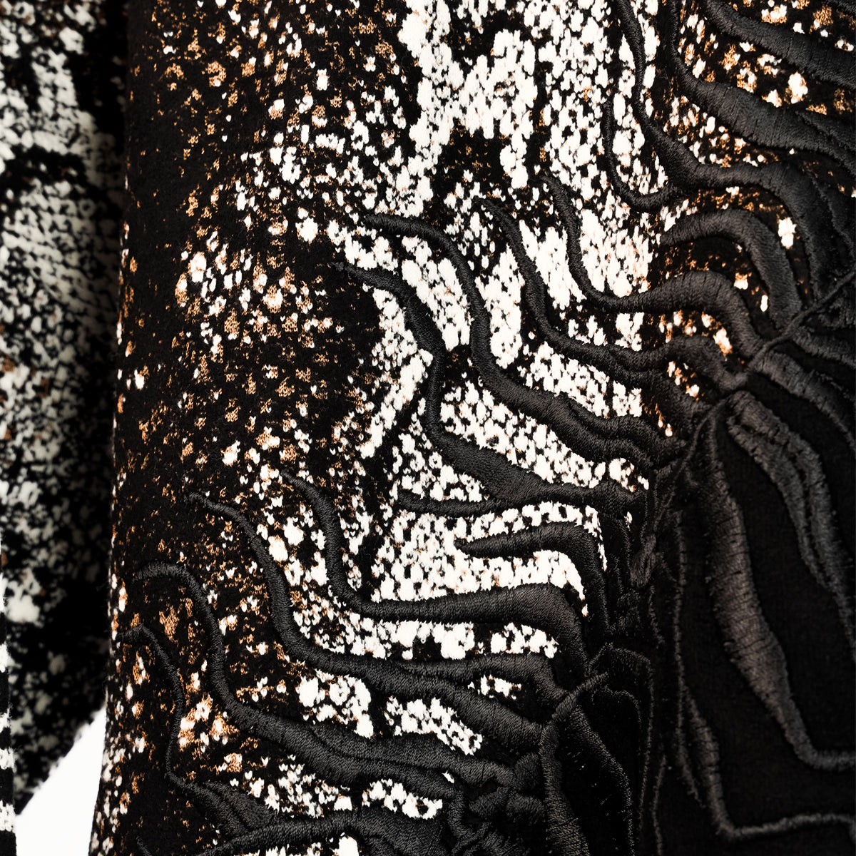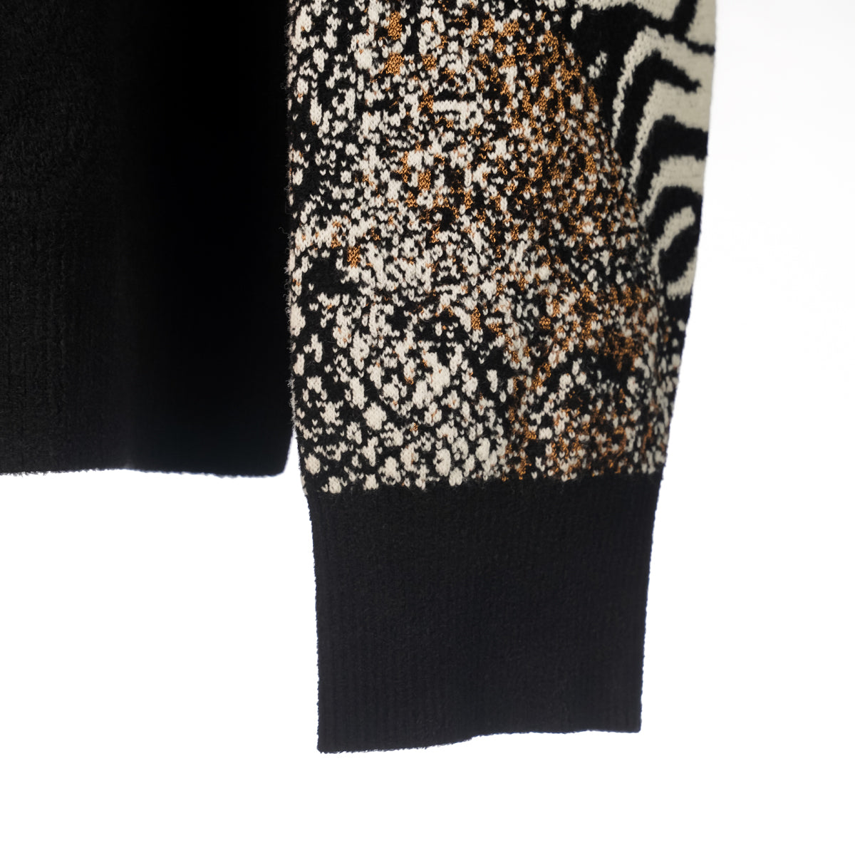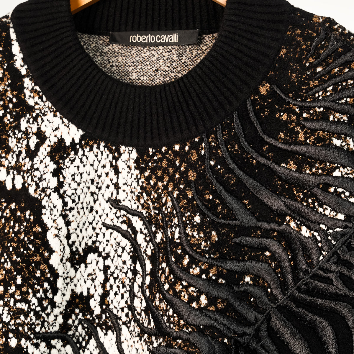 This wool-blend sweater puts Cavallis animalier themes proudly on display: its jacquard-woven with python scales and zebra stripes and embroidered with branching lines across the front. Solid black jersey panels and ribbed-knit trims offset the clash of patterns.