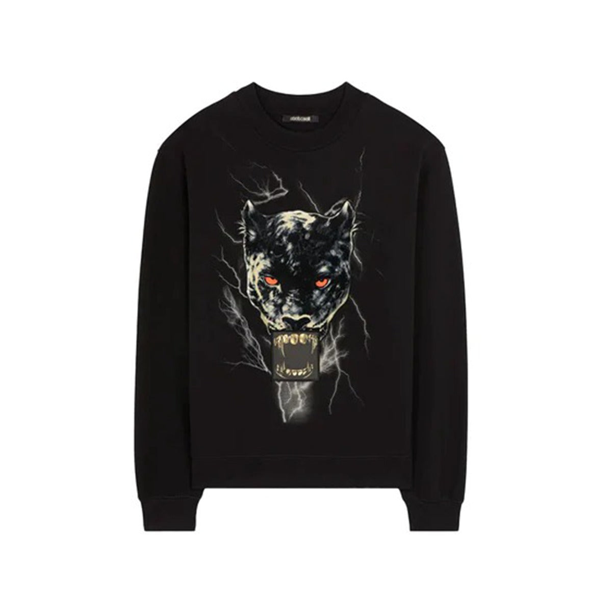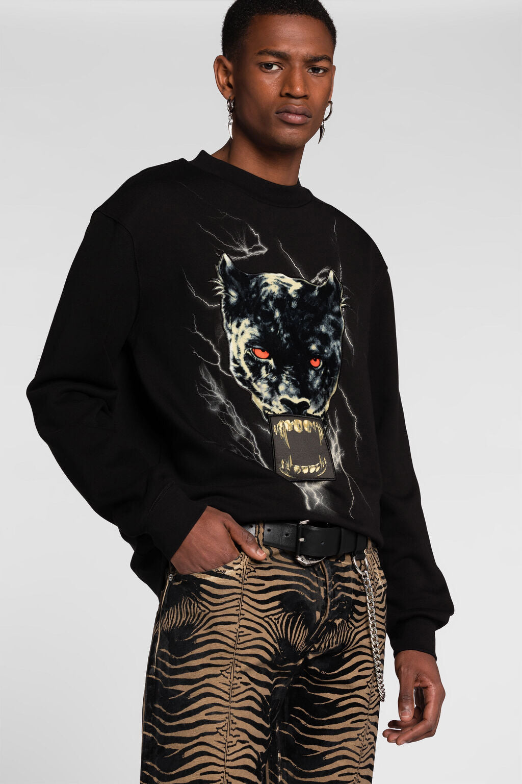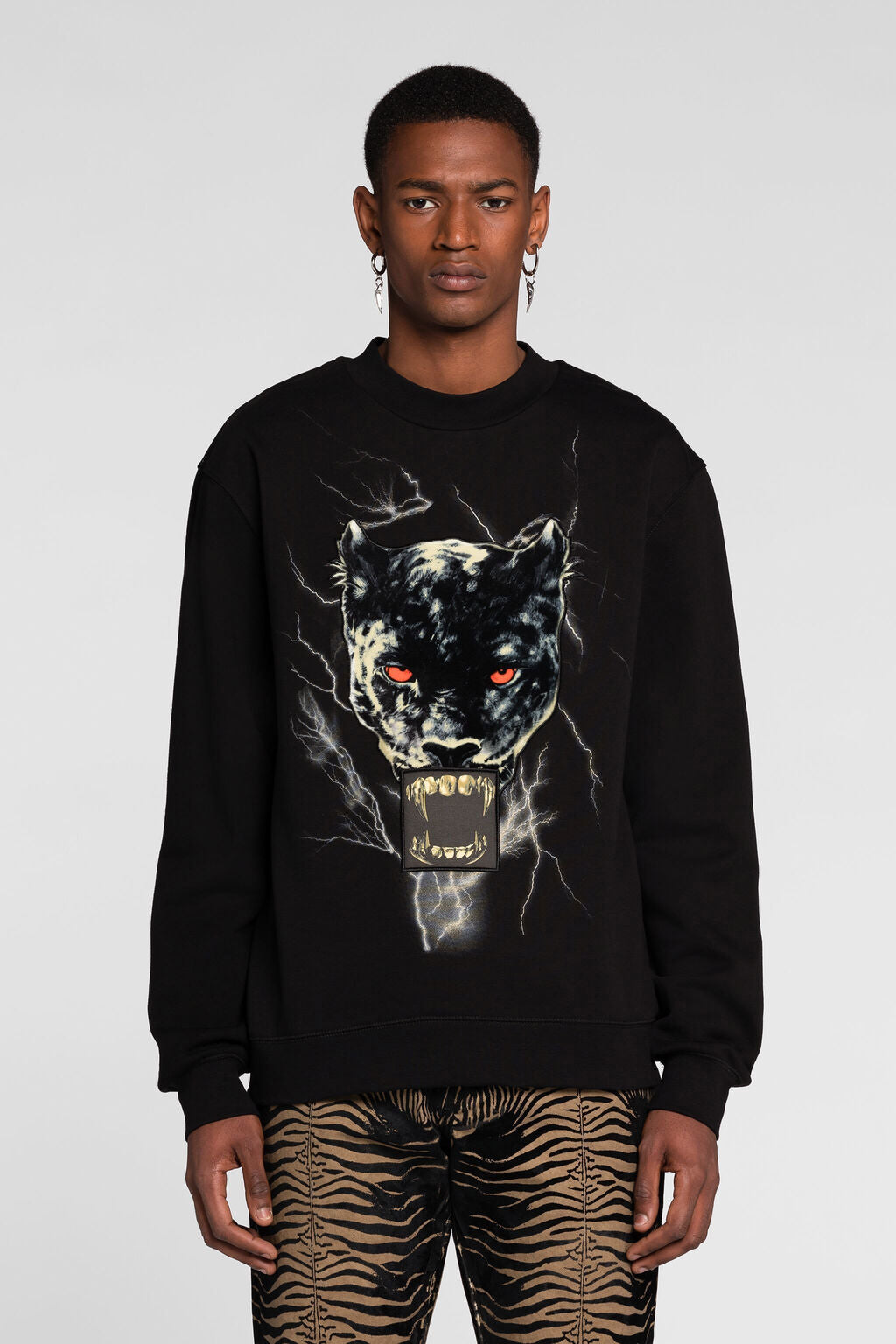A medley of bold graphics melds across the front of this black cotton sweatshirt  a red-eyed panther emerges from a frenzy of lightning bolts, its fangs replaced by a Teeth-print.