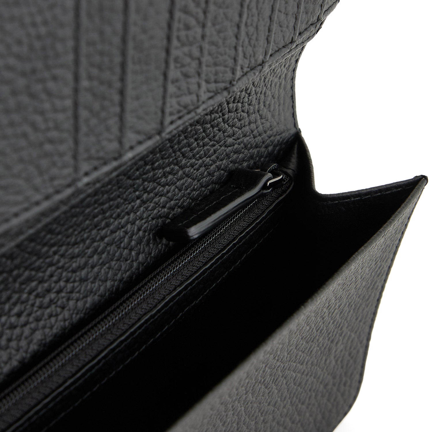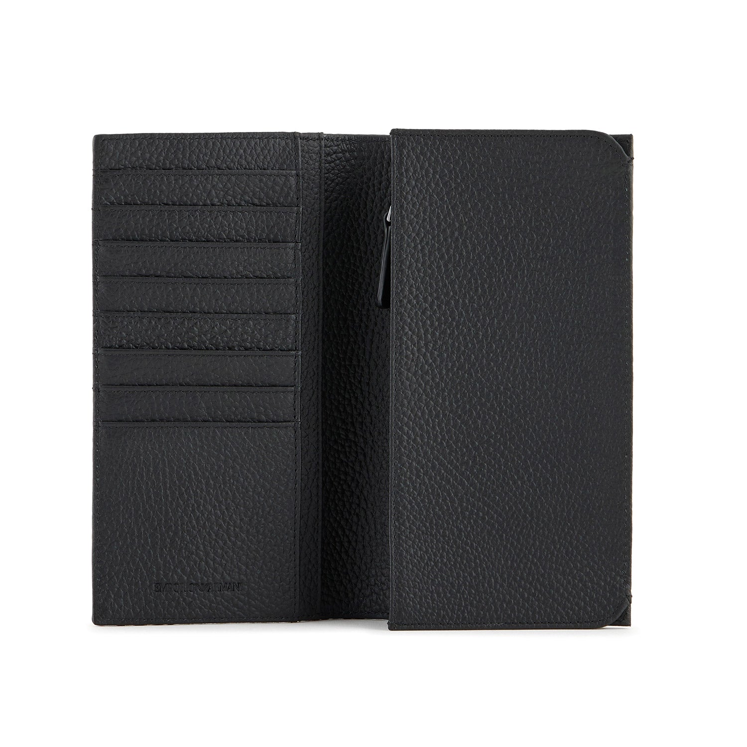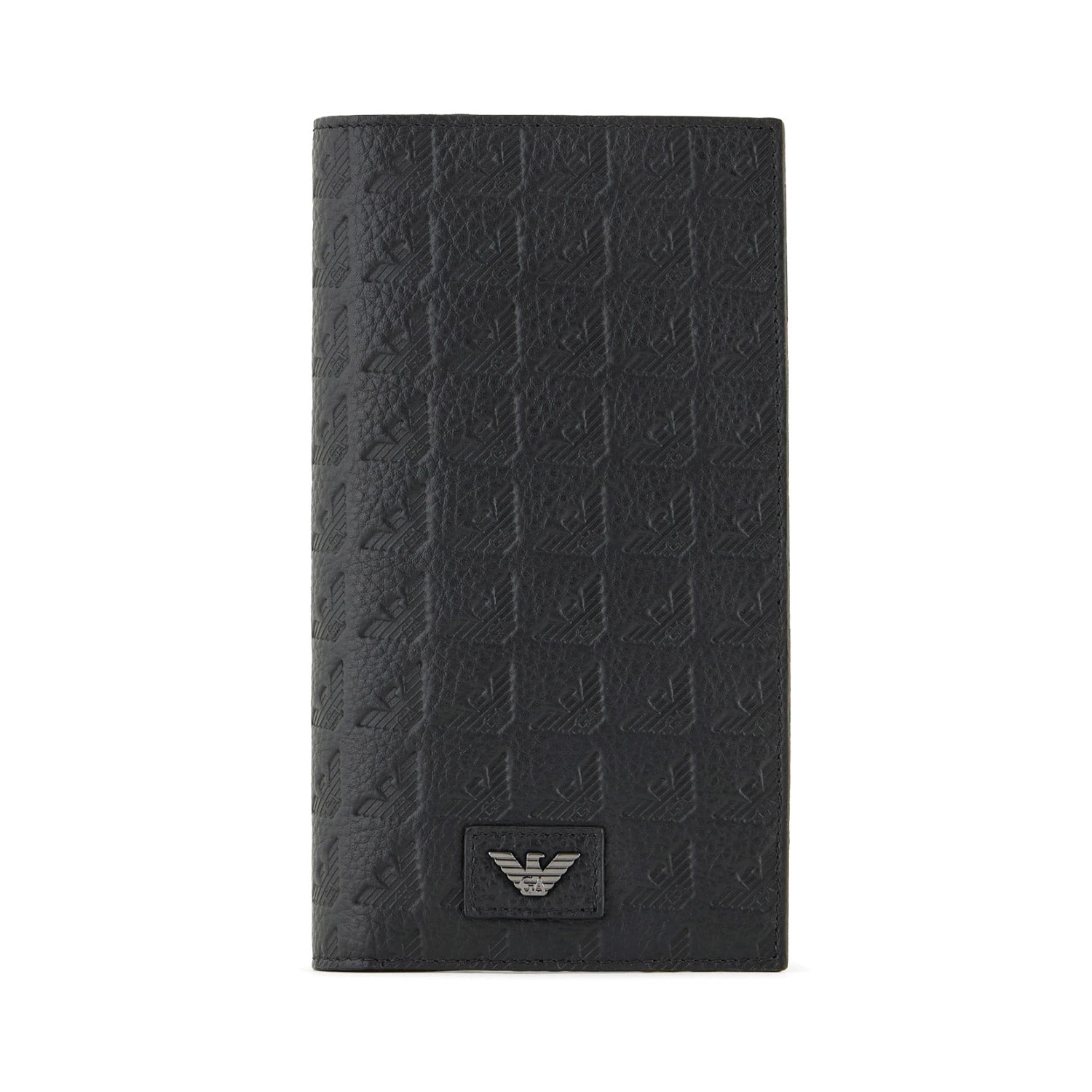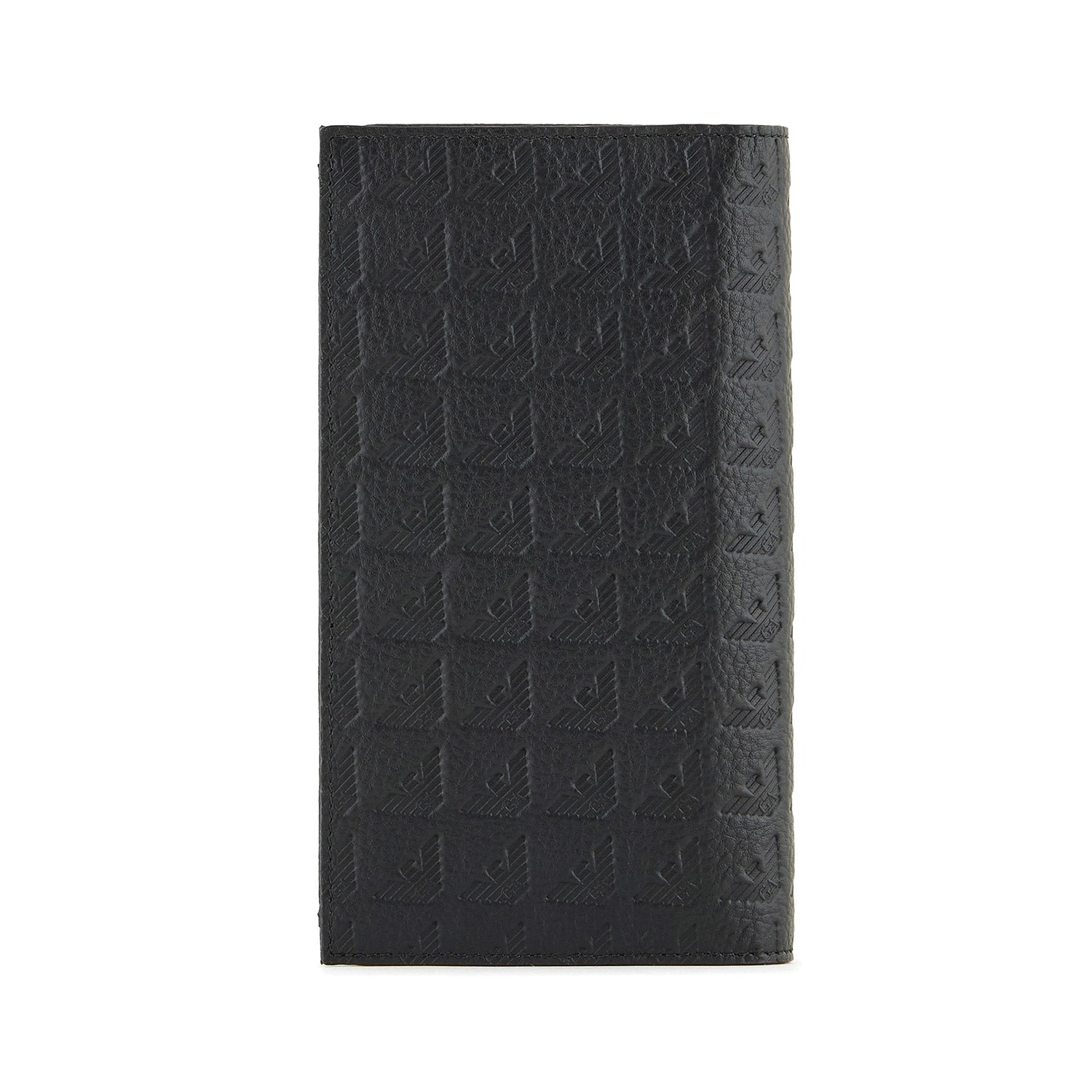 Large currency holder in logo cowhide, a must-have for those who love the traditional vertical shape of this characteristic accessory. This practical, sophisticated item features several card slots and banknote compartments. A strong, bold image characterised by the all-black pebbled leather featuring a heat-stamped all-over eagle and iconic metal eagle applied on a leather patch.
