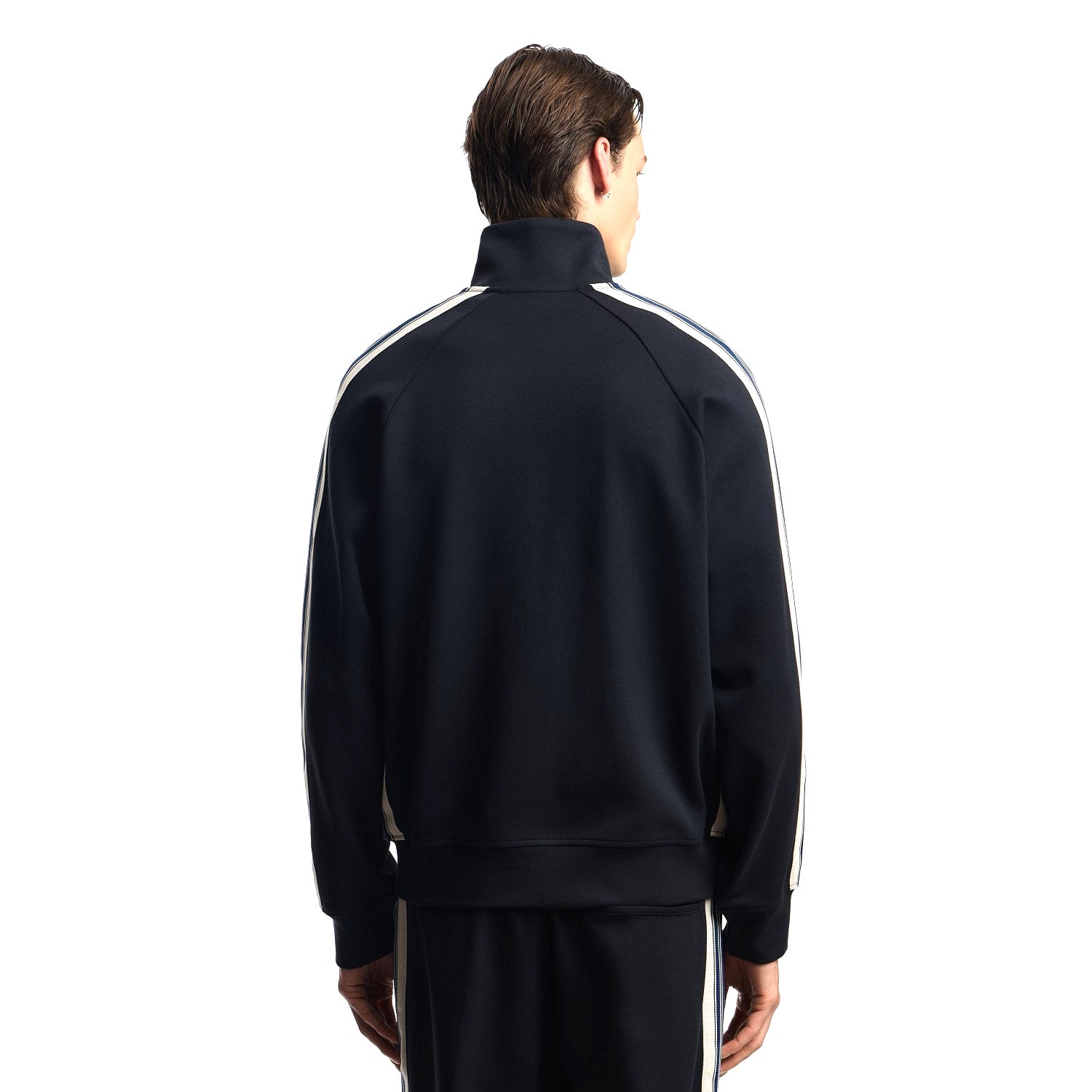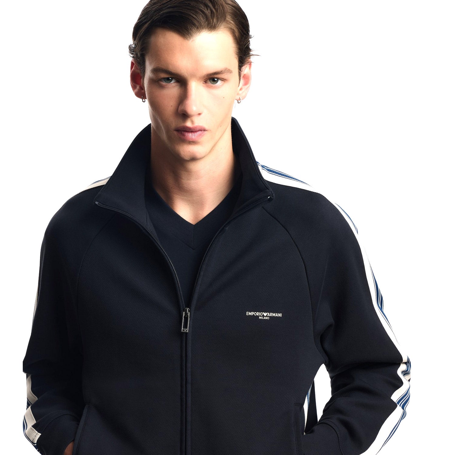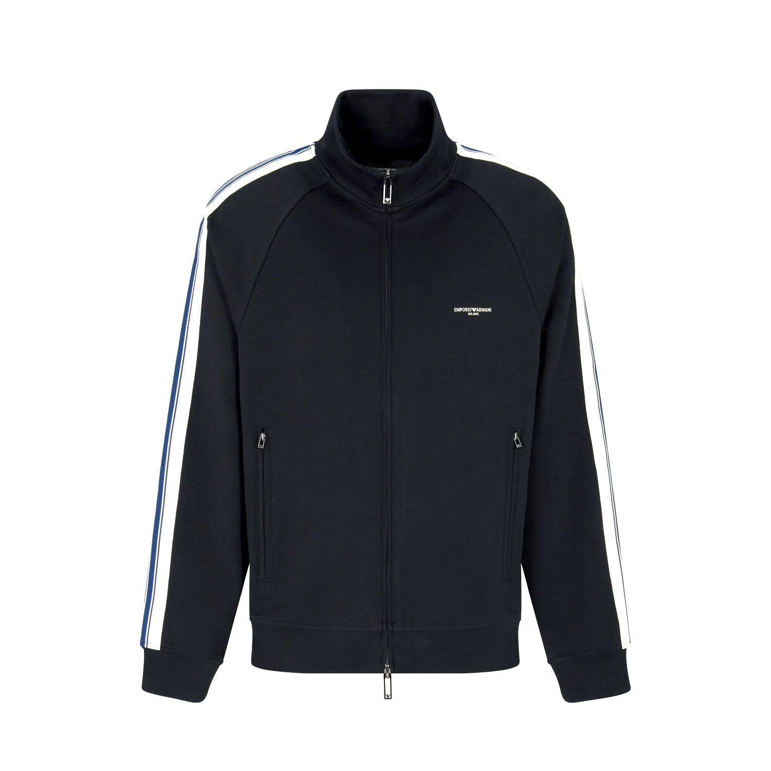 Sweatshirt with full zip, made of jersey in a cotton and modal blend. The garment is distinguished by contrasting bands applied on the sleeves, and the Emporio Armani Milano logo on the chest.