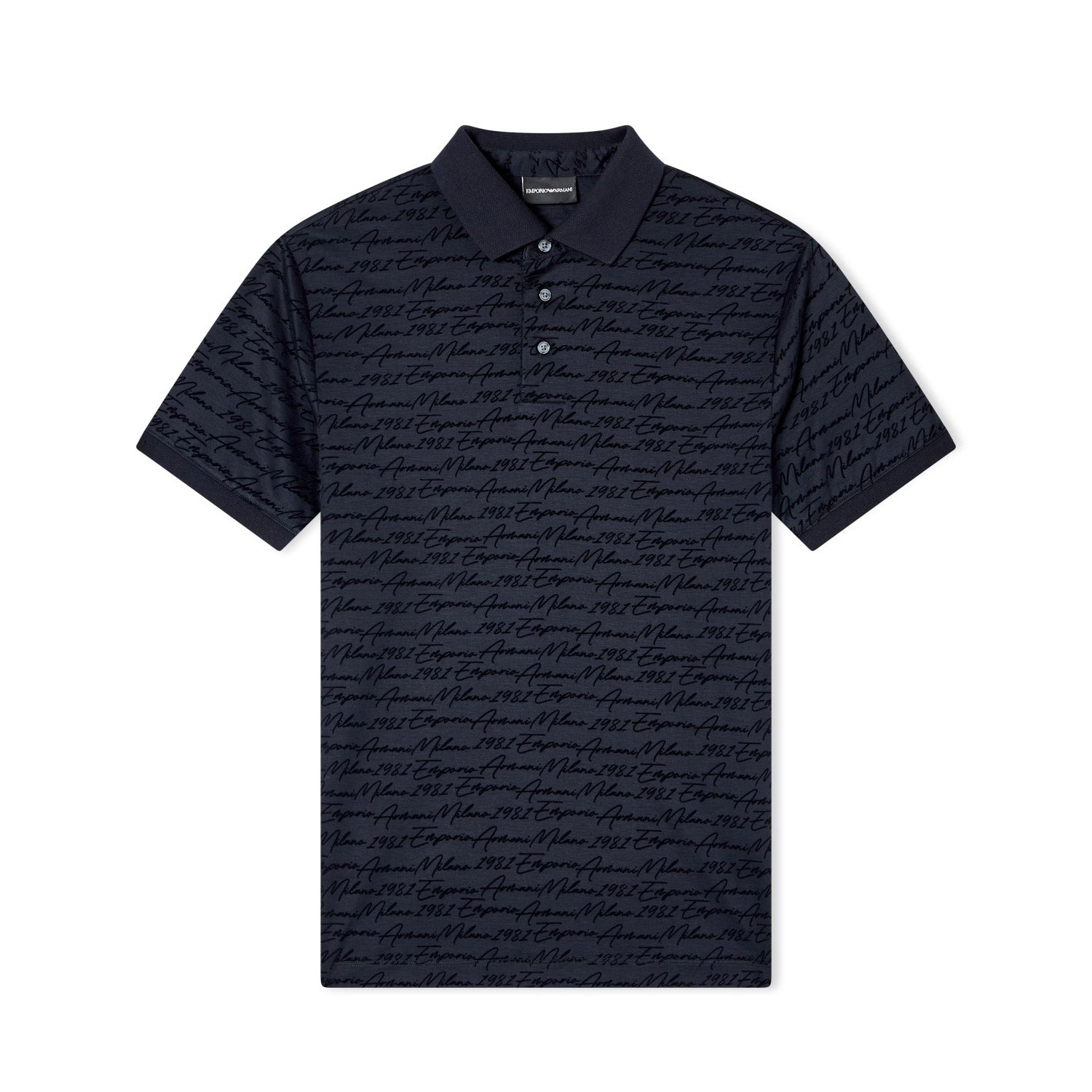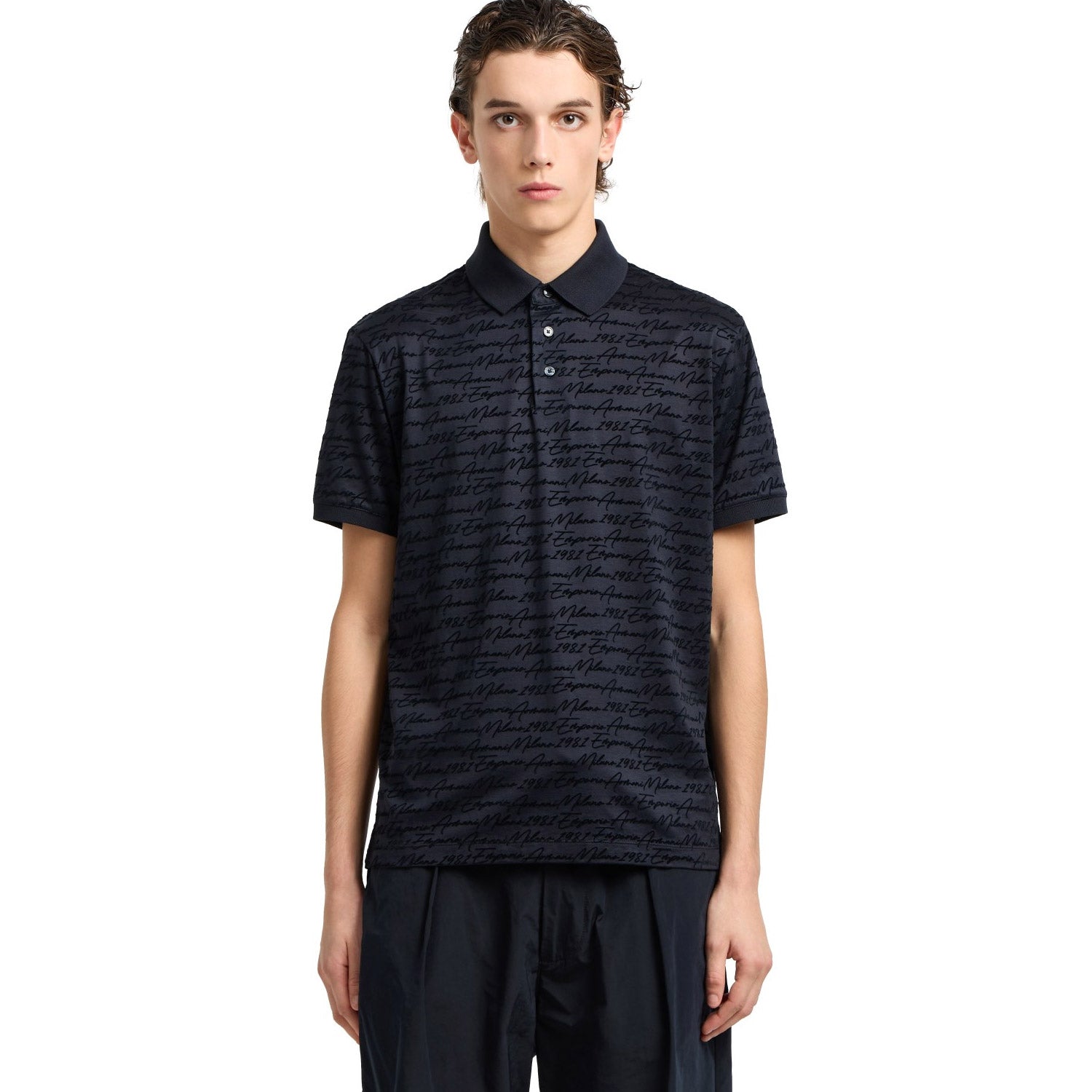Cotton blend jersey and Lyocell polo shirt with an all-over very dense flocked print with logo lettering, a technique that provides a unique, velvety, embossed feel.