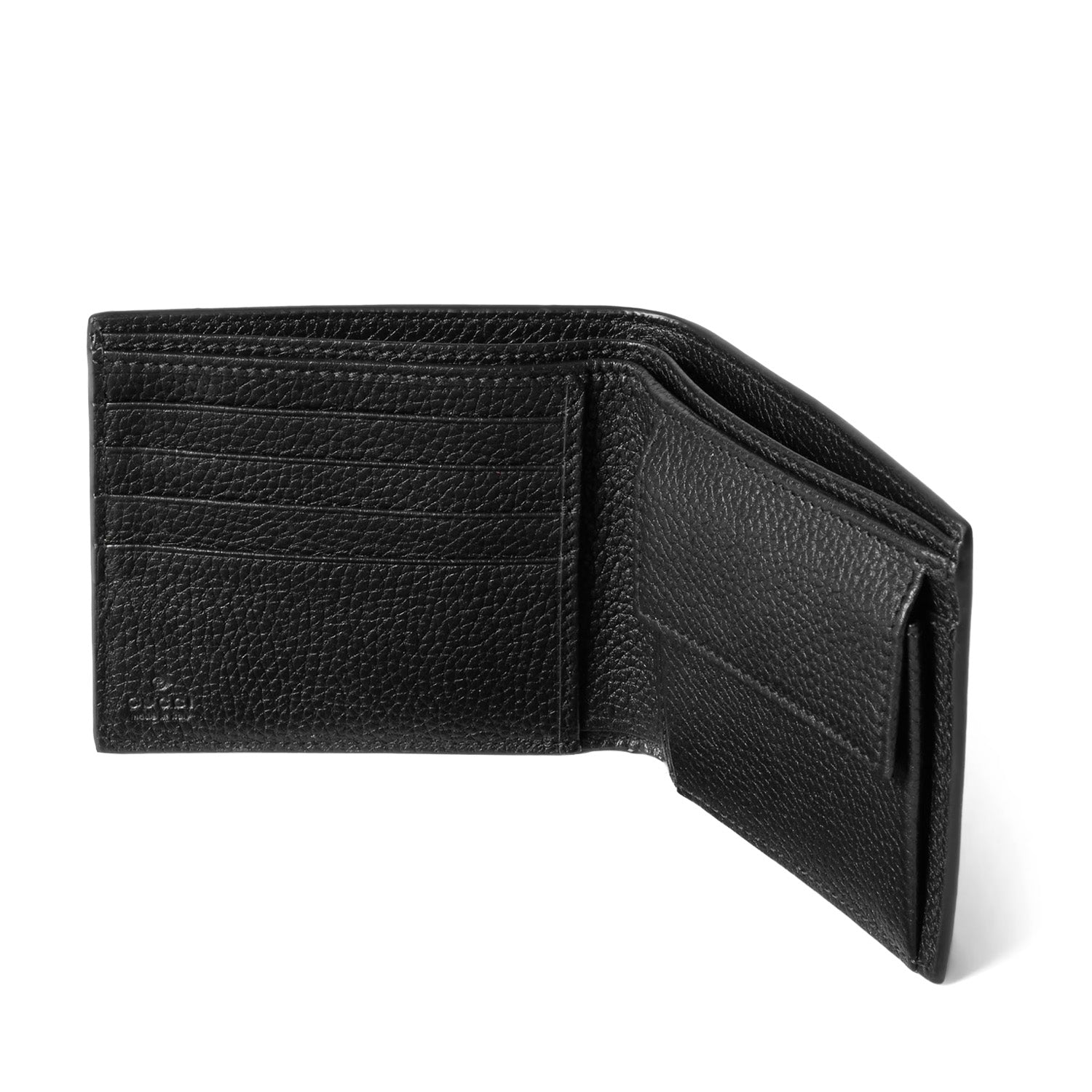 The small leather goods, embossed with the GUCCI logo, are reintroduced in the latest collection: this coin wallet is crafted from black grained leather and features multiple interior compartments.