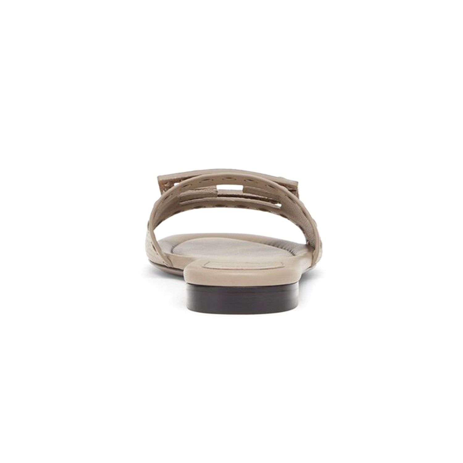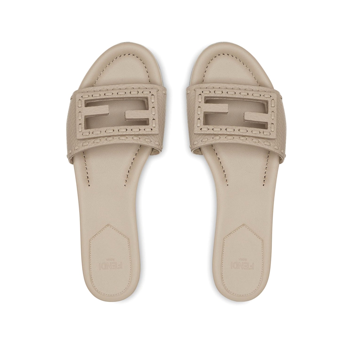 Wide-band slides. Made of dove grey tumbled leather and embellished with hand-sewn tone-on-tone macro Selleria topstitches, an emblem of the iconic Selleria stitching handed down through generations of Fendi artisans since 1925. Tone-on-tone FF Baguette motif.