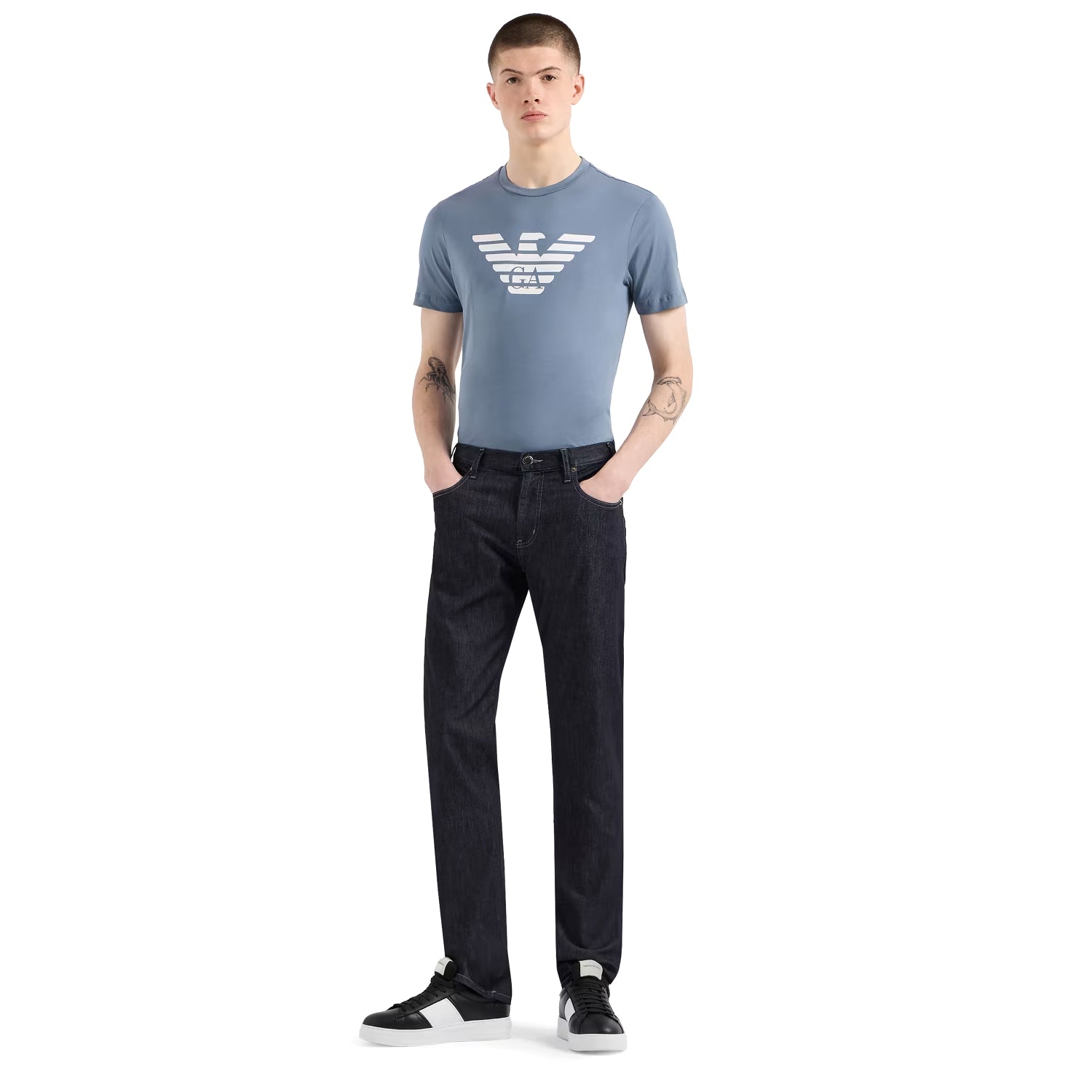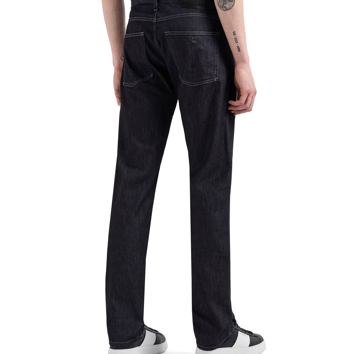 This jeans style features a regular waist and leg on a fabric with a worn-effect wash. Zip closure. Regular fit. This item belongs to the Essentials clothing selection, the Emporio Armani capsule collection that is an evergreen statement of style: an ongoing collection with clean, well-designed shapes for a wardrobe that meets the demands of any season. These essentials, versatile pieces are a must-have for the male wardrobe.