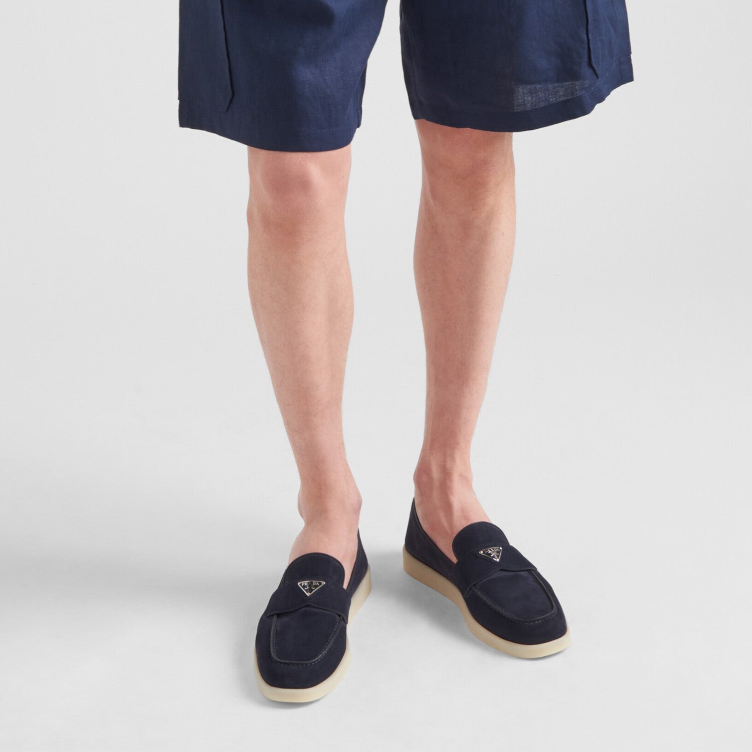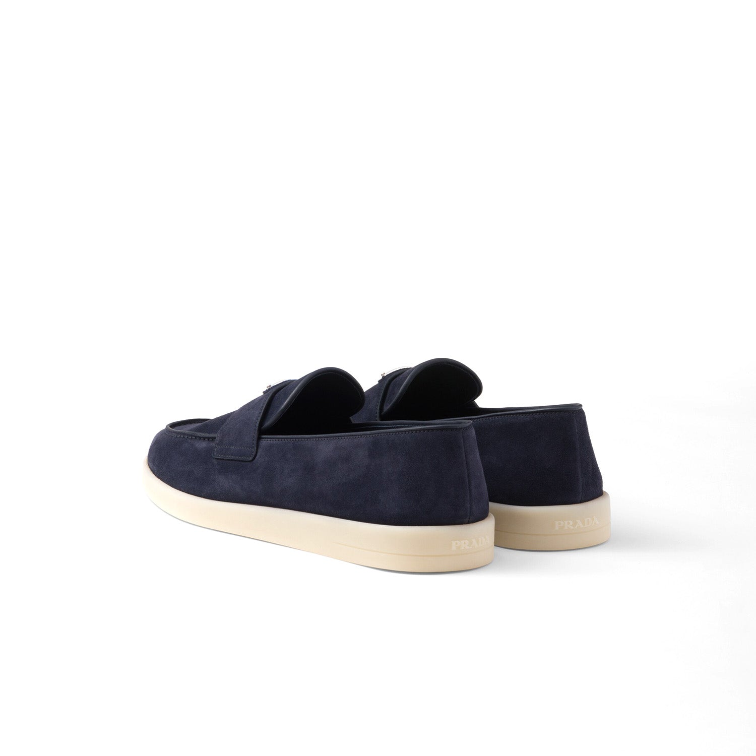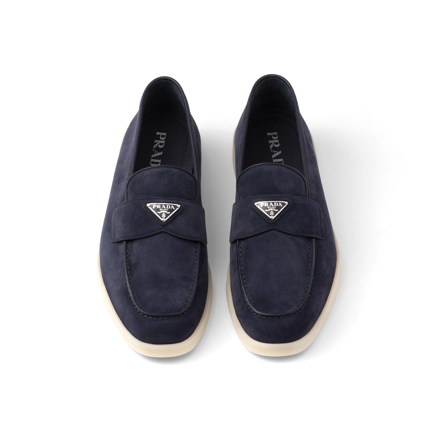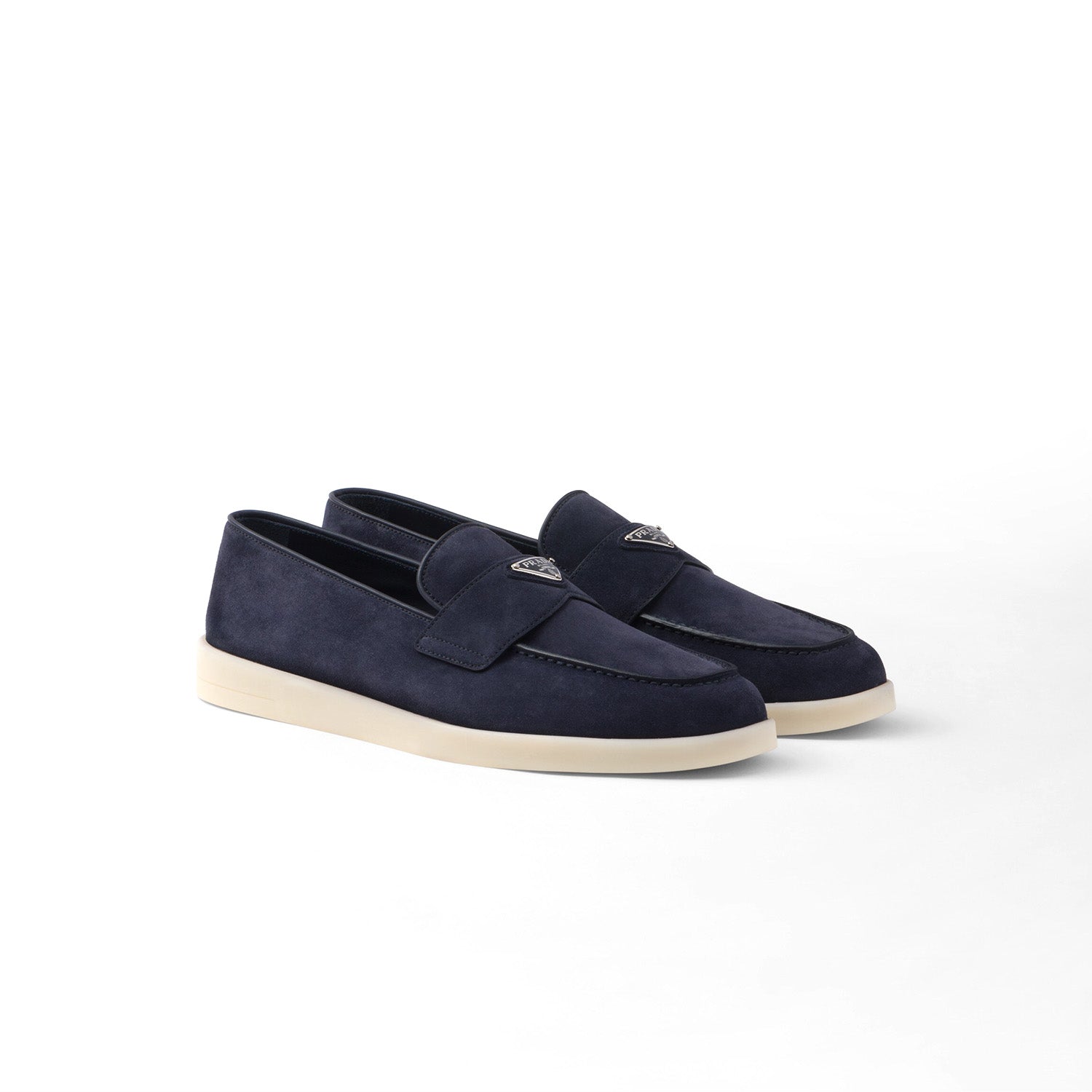 These soft suede loafers with a leather lining have a modern silhouette. The enameled metal triangle logo stands out on the front.