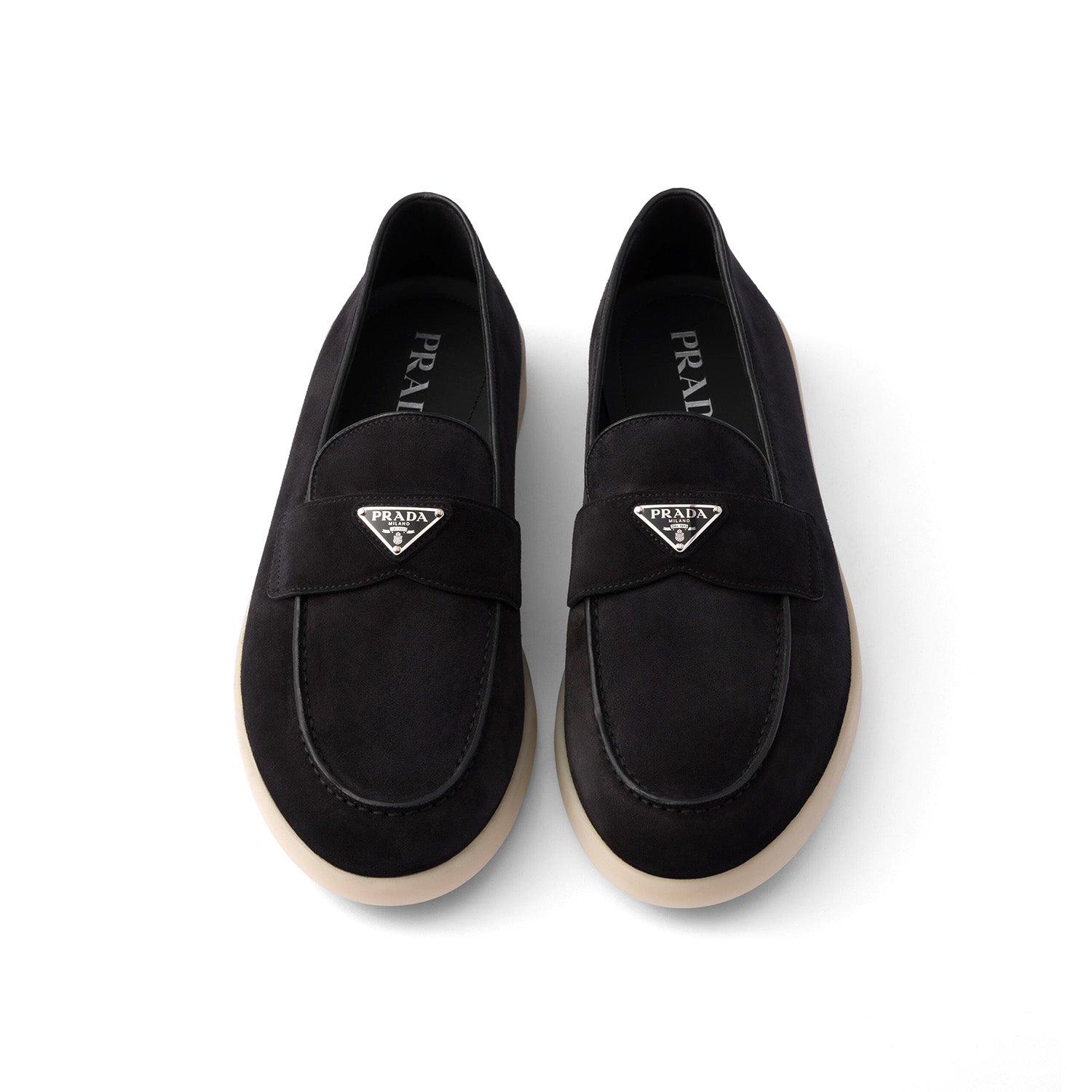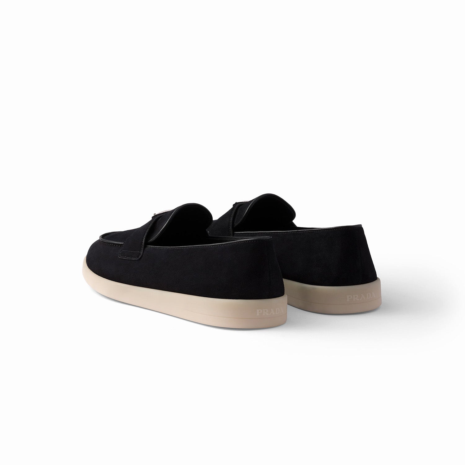 These soft suede loafers with a leather lining have a modern silhouette. The enameled metal triangle logo stands out on the front.