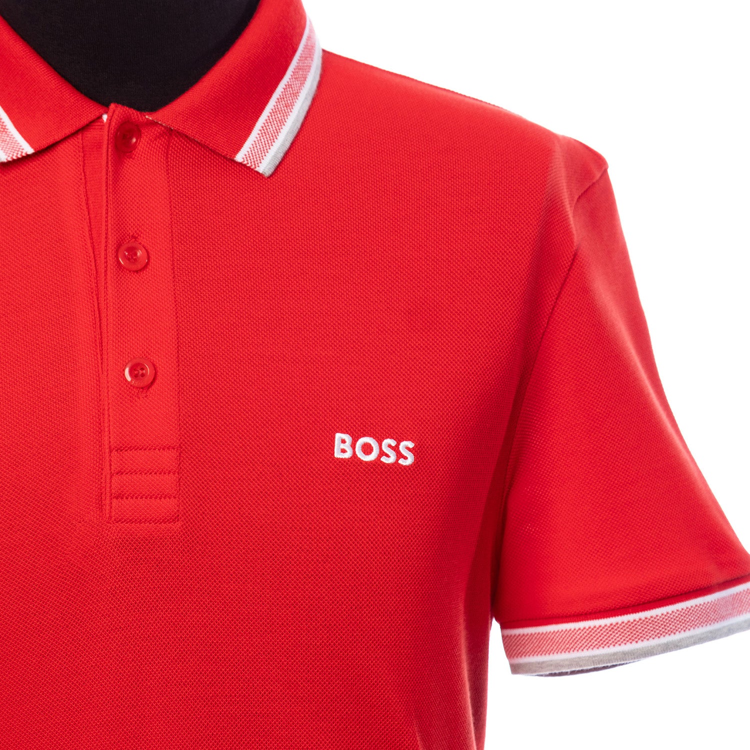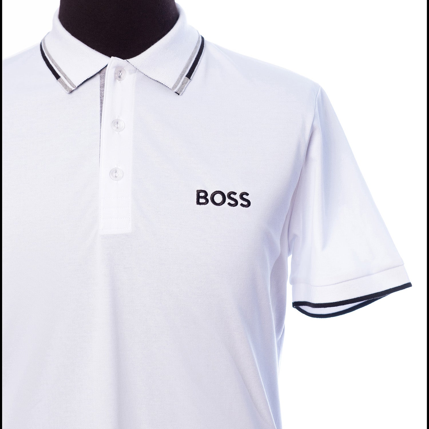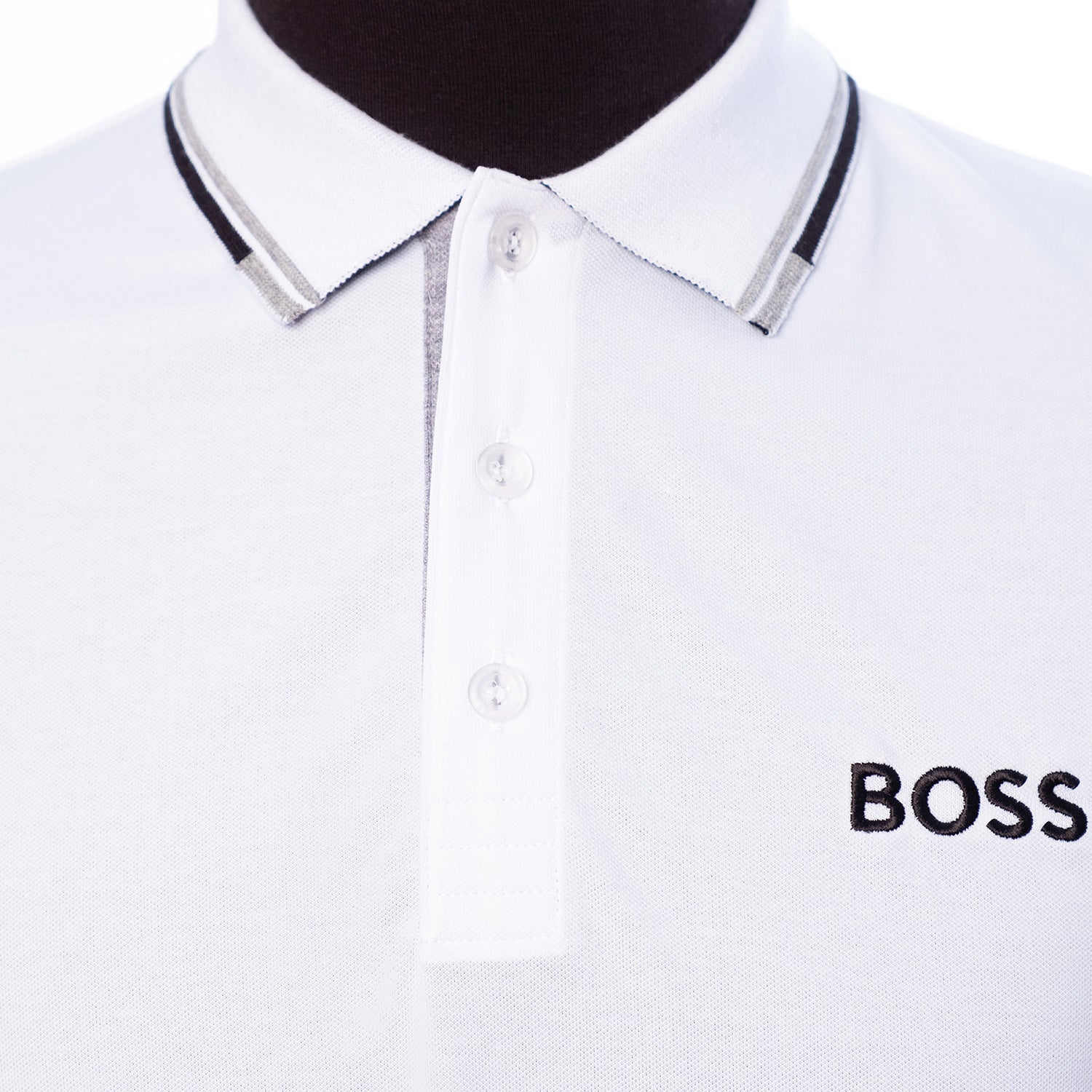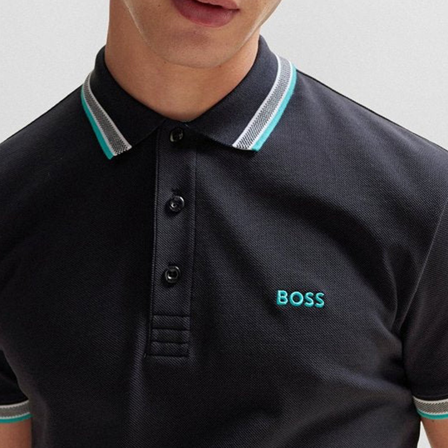 Turn up the collar on this regular-fit polo shirt by BOSS Menswear to reveal logo details. Breathable cotton piqua. Sporty stripes and contrast branding.