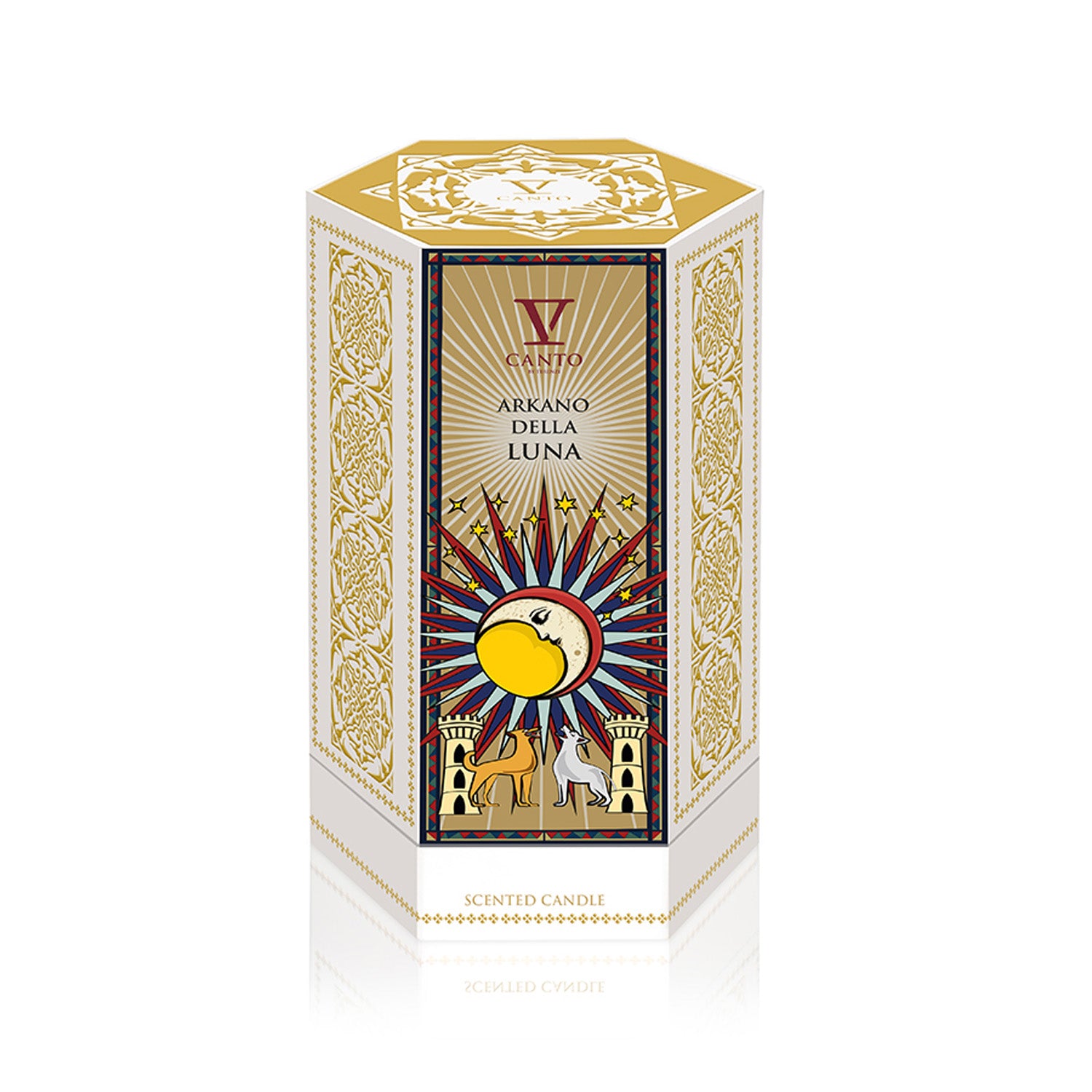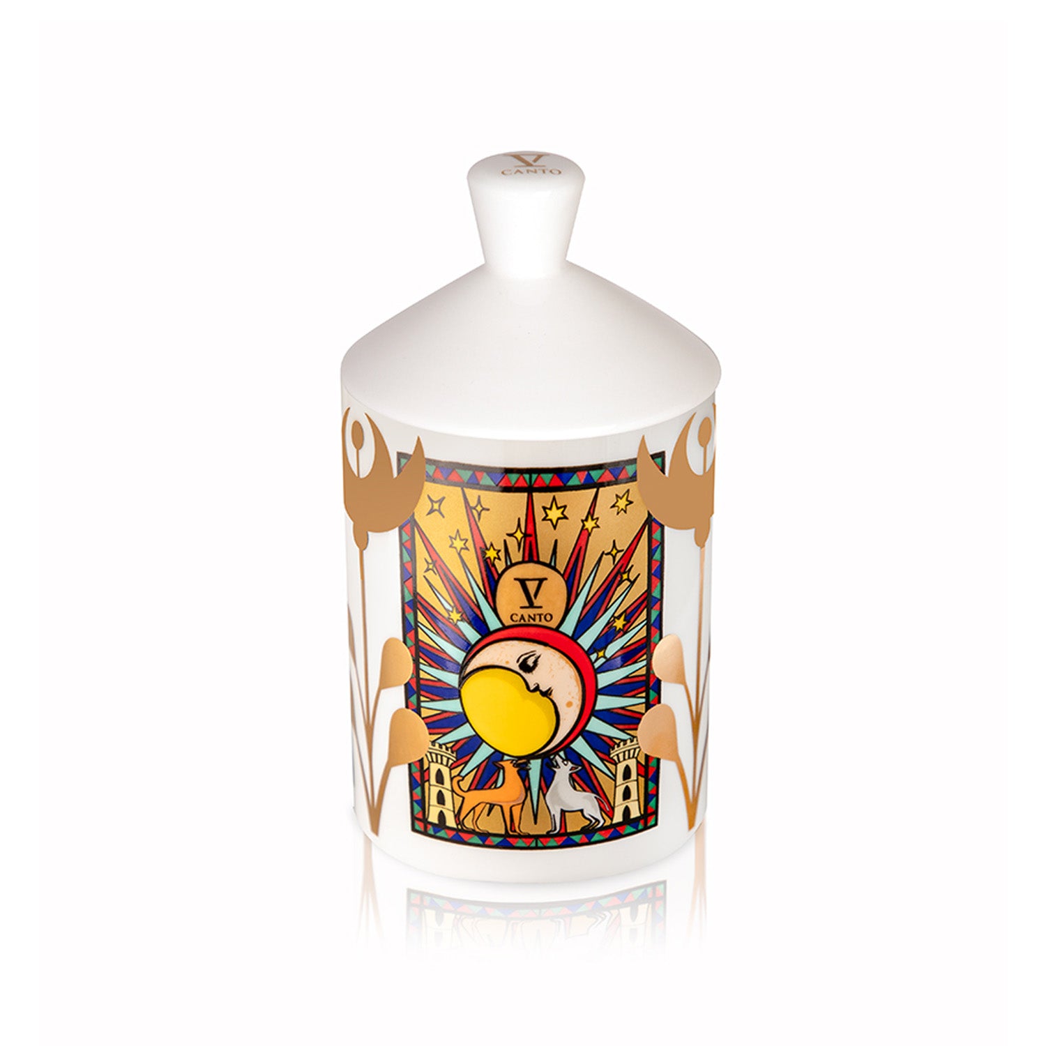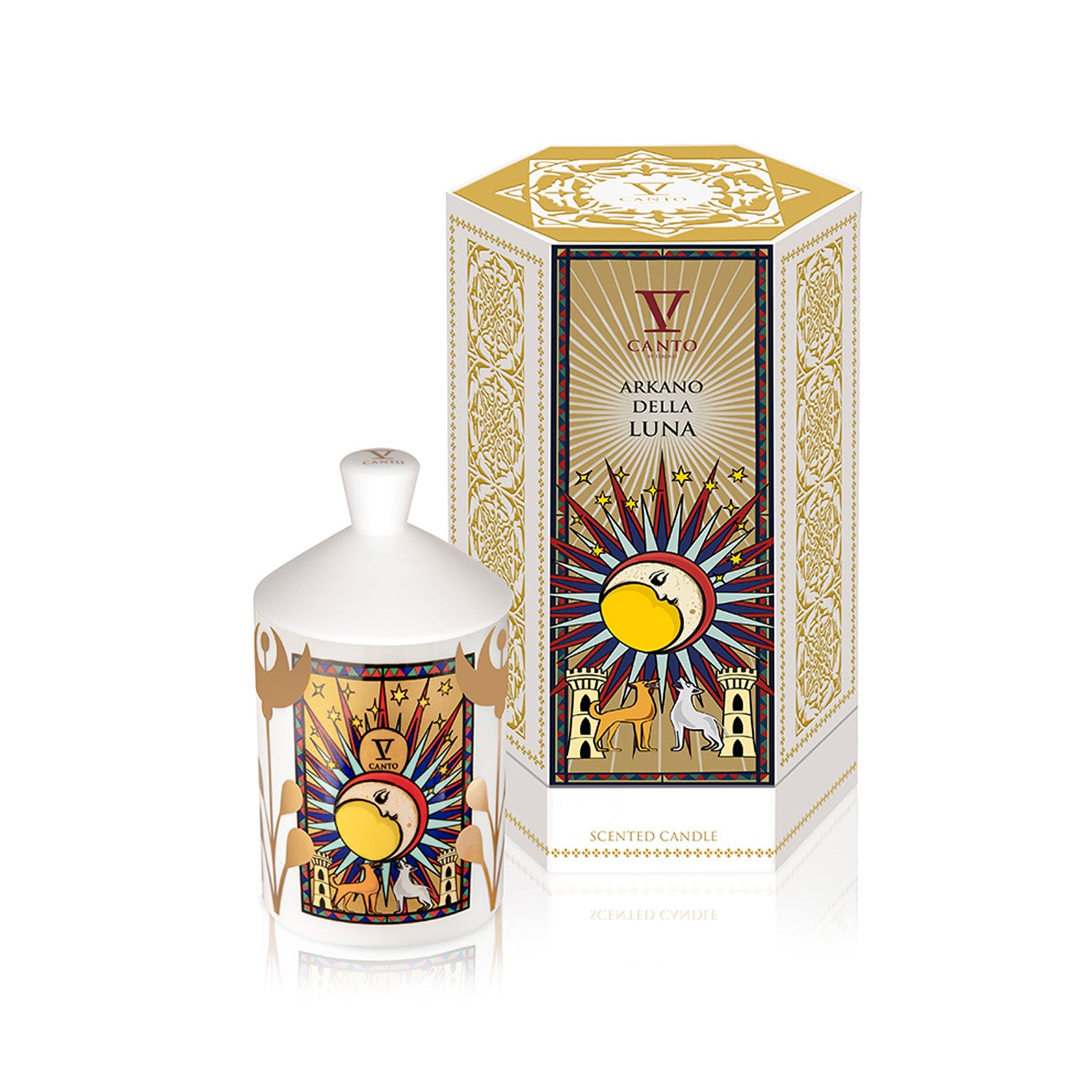 The V Canto Arkano Della Luna perfumed candle is an elegant, niche home fragrance in a white ceramic vessel, featuring scent notes of flowers, fruits, and sweet elements. The fragrance is inspired by the nocturnal side of the moon and the mystery of the tarot's moon card, serving as a "talisman" for self-discovery.