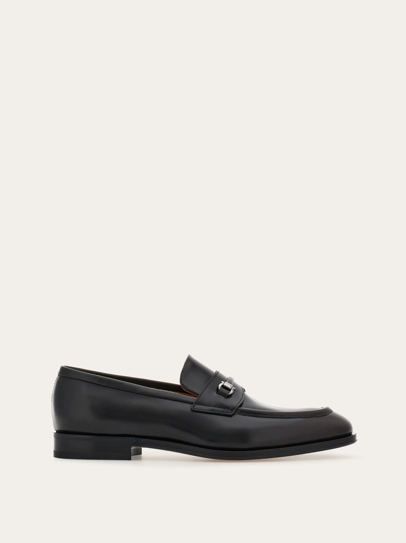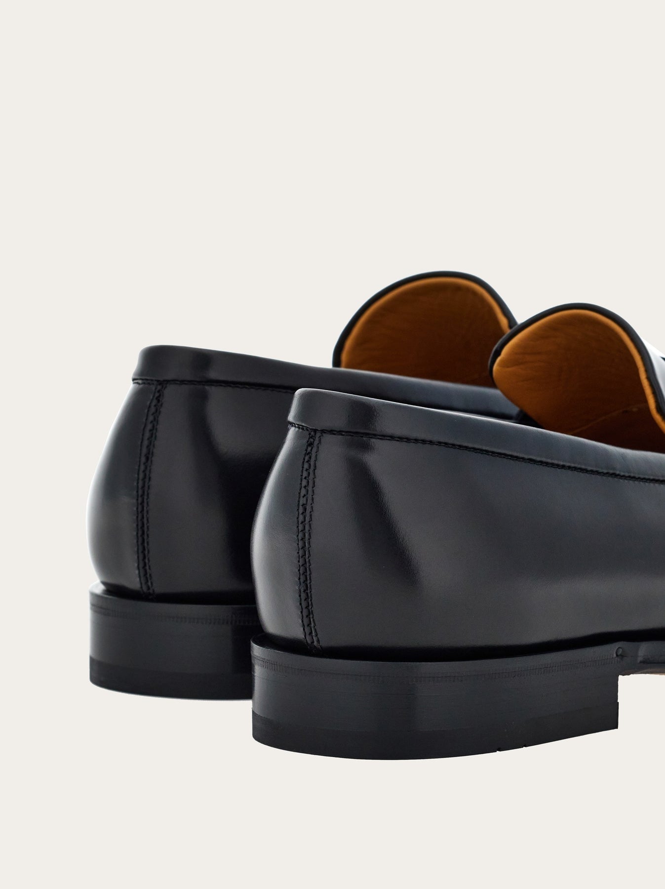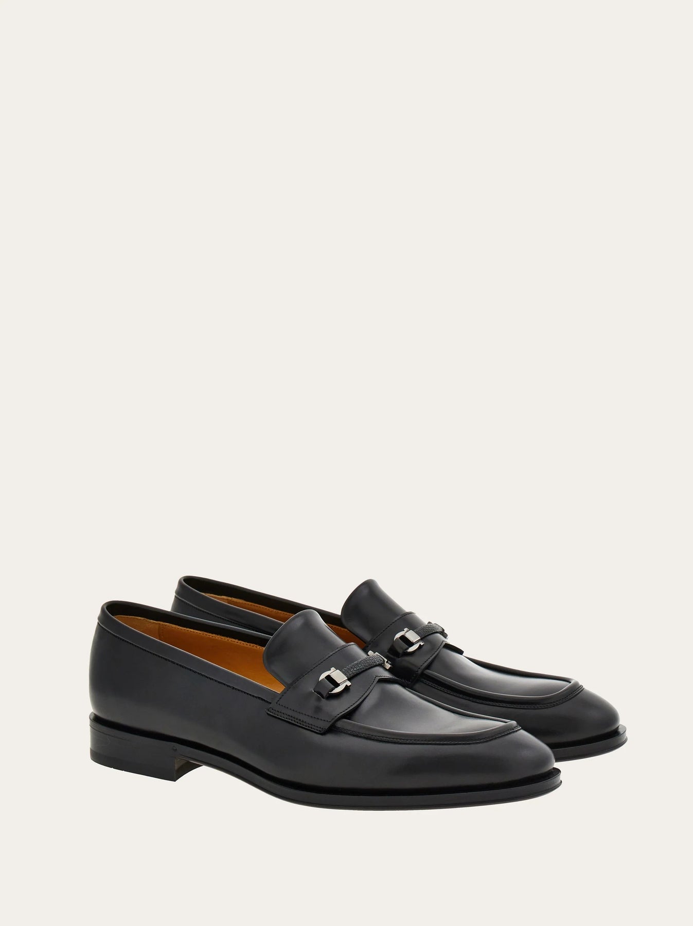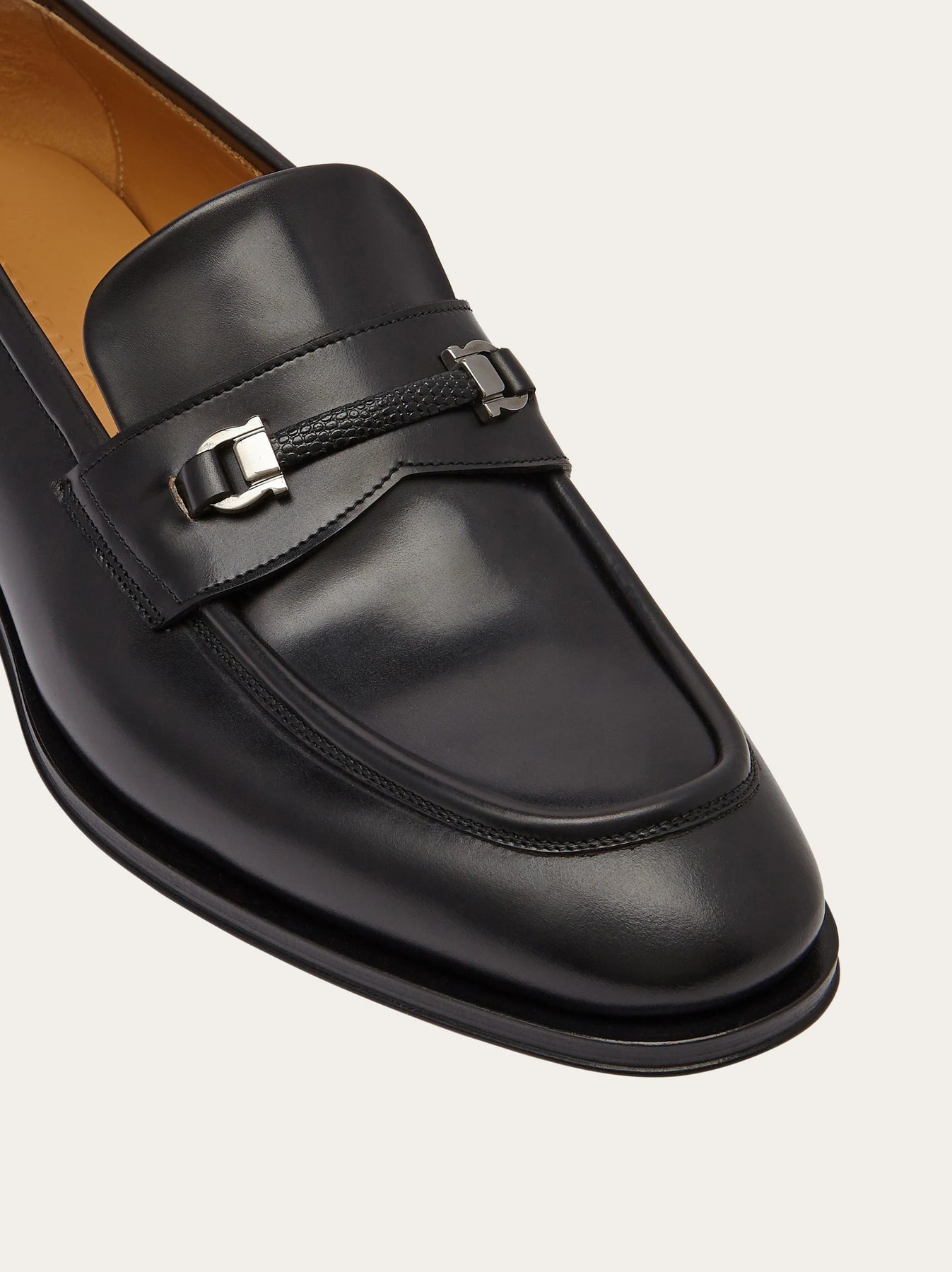 With an elegant and rich feel, this new look Ferragamo loafer is cut from the softest calfskin. The almond shaped tip is emphasized by visible stitching around the vamp, and the two mini Gancio bits that hold a lizard print strip across the instep. The sole is attached almost entirely by hand by skilled artisans to ensure the finest quality workmanship.
