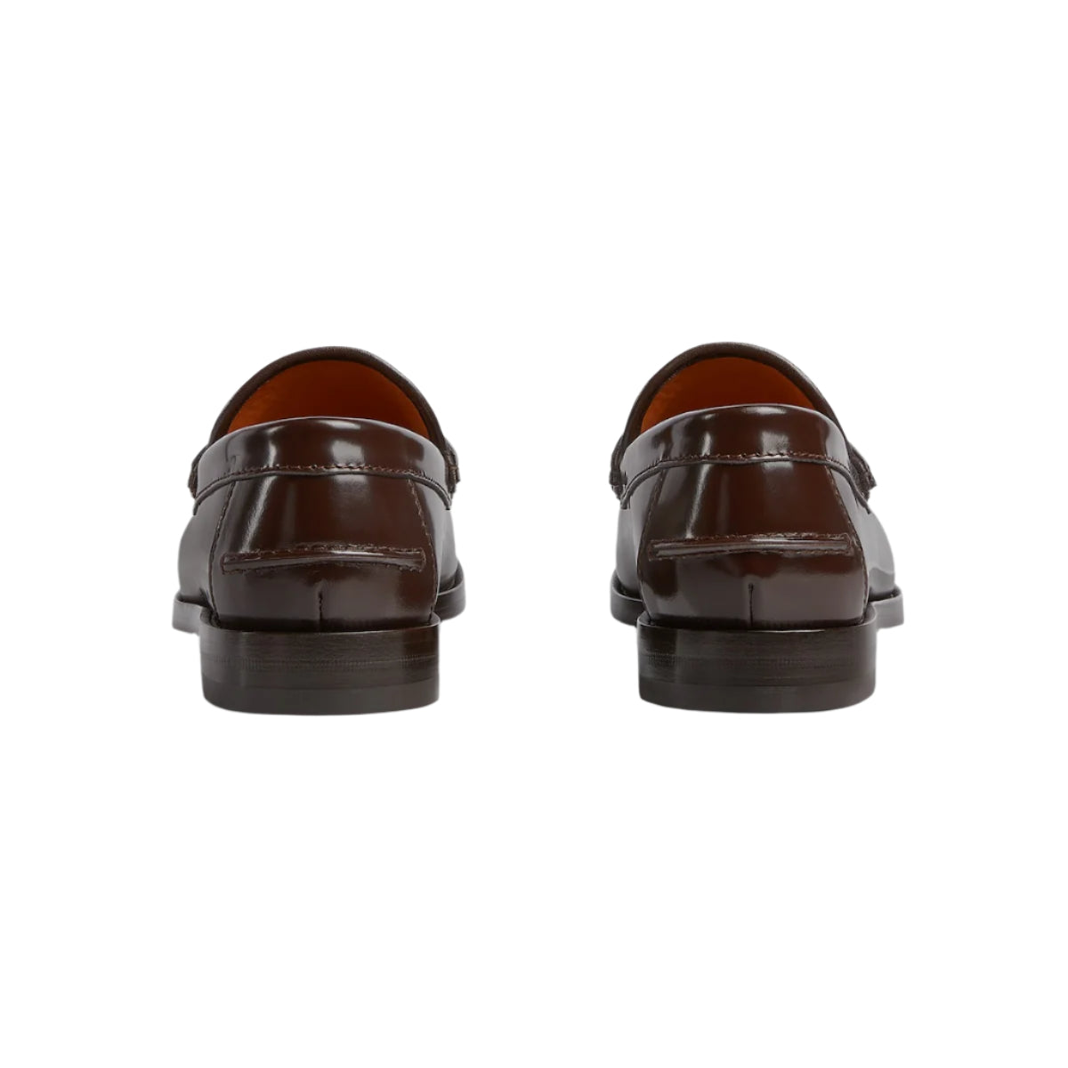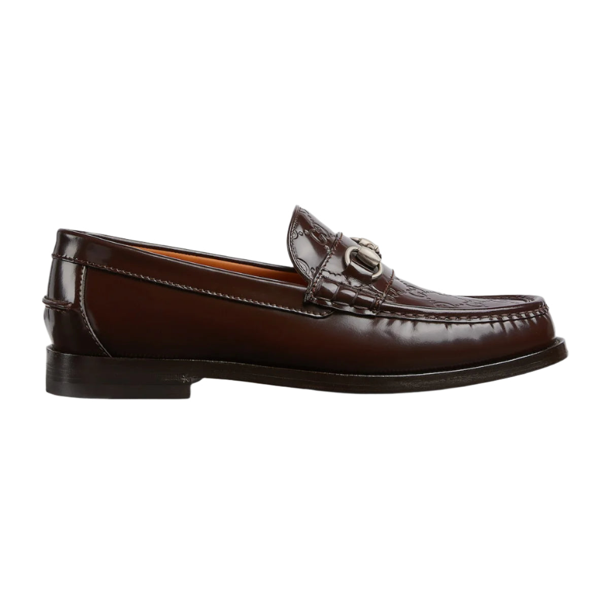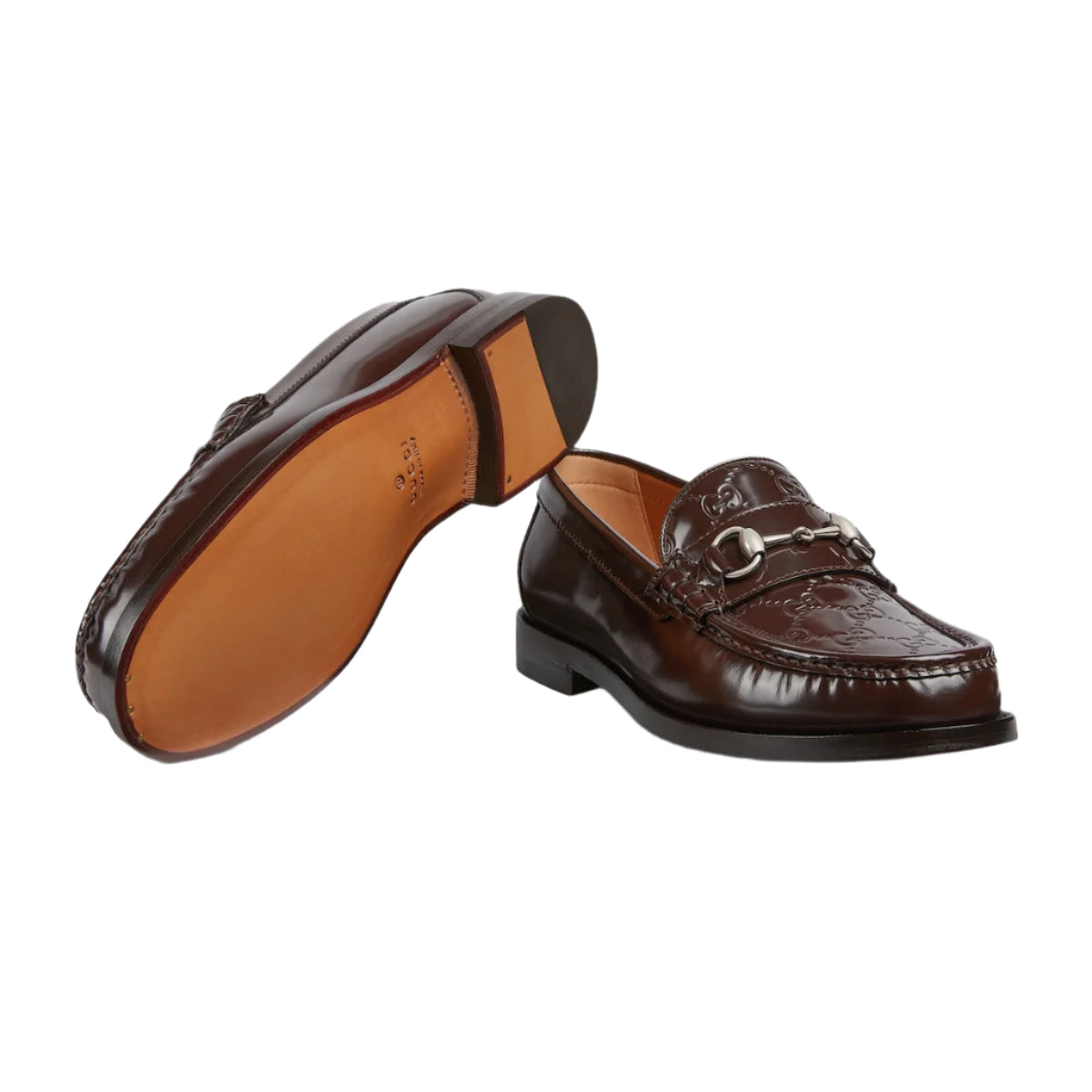 The Pre-Fall selections spotlight essential silhouettes with emblematic details. This slip-on style for men is crafted from brown debossed GG leather, with the House's signature, highlighting the Horsebit hardware.