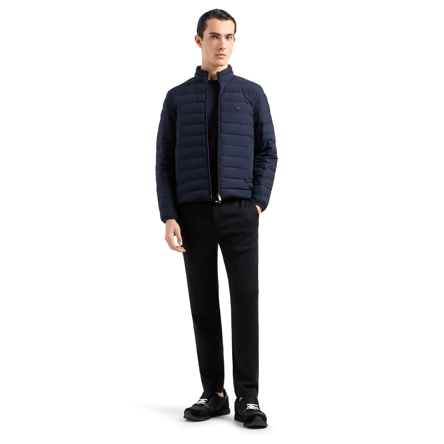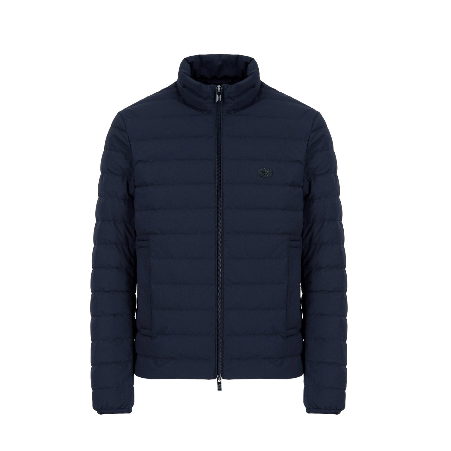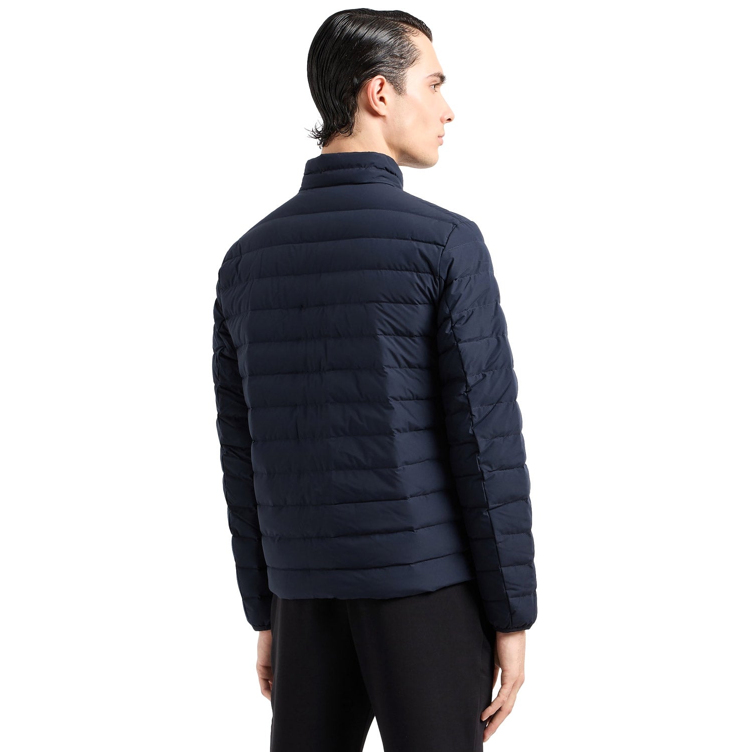 Nylon down jacket with full-zip fastening and eagle patch on the chest. The simple, modern nature of this men’s down jacket is enhanced by genuine feather padding and a matelassé effect. The perfect item for urban day wear. This item belongs to the Essentials clothing selection, the Emporio Armani capsule collection that is an evergreen statement of style: an ongoing collection with clean, well-designed shapes for a wardrobe that meets the demands of any season. These “essential”, versatile pieces are a must-have for the male wardrobe.