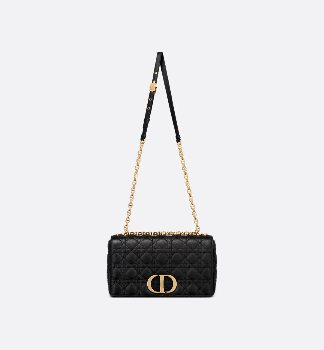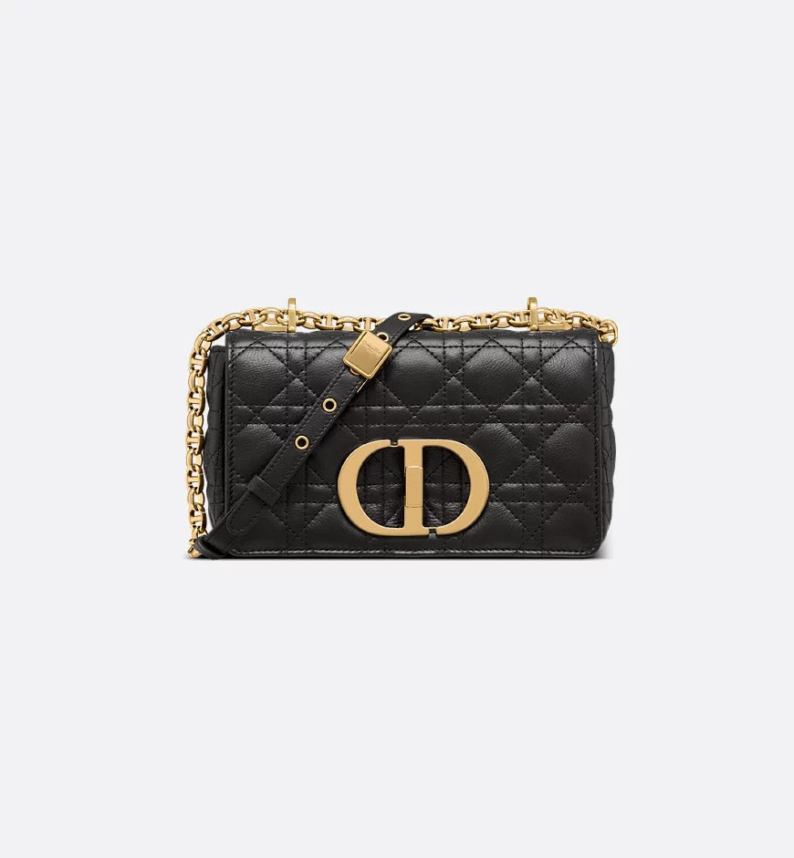 The Dior Caro bag combines modernity with timeless elegance. The style is crafted in black supple calfskin with Cannage stitching. The bag showcases a flap adorned with an antique gold-finish metal CD twist clasp, inspired by the seal of a Christian Dior perfume bottle. The detachable chain shoulder strap with CD signature links allows the small bag to be carried by hand, worn over the shoulder or crossbody, and may be replaced by one of the House's wide embroidered straps for day or evening attire.