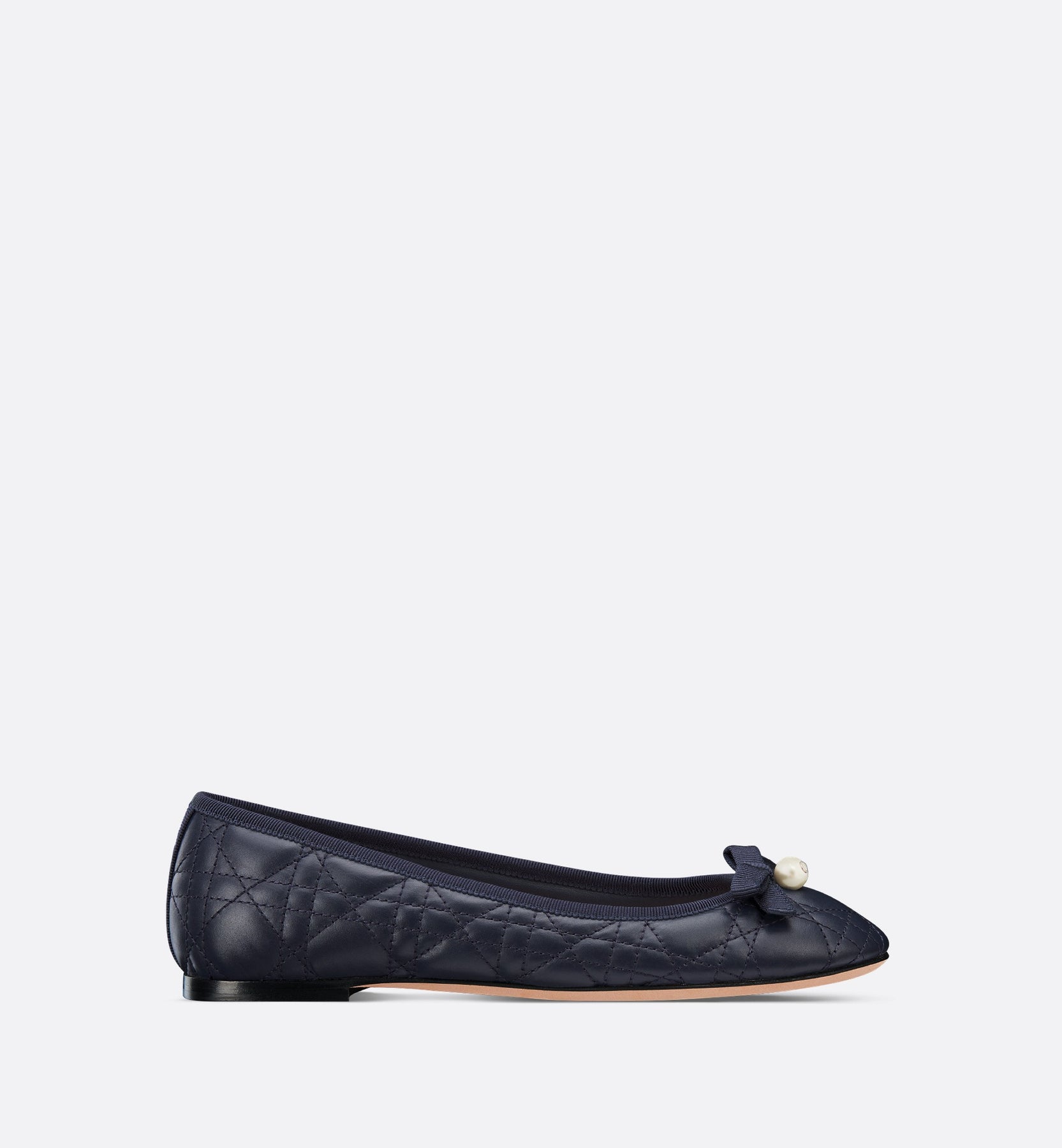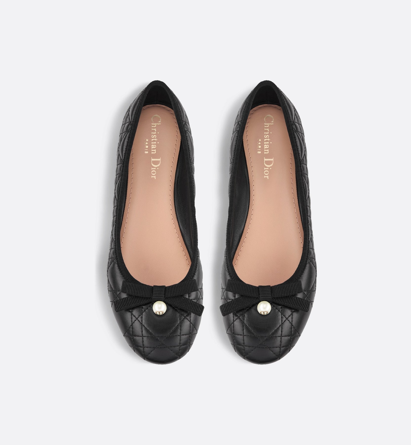 Ballerina shoes made of quilted calfskin with a cannage motif. A delicate grosgrain bow on the front gives the shoes a unique design. Resin pearls inspired by the iconic Dior Tribales earrings add elegance. The outsole features a star, Dior's symbol of good luck. The padded leather insole provides a supple and comfortable fit. This is a masterpiece that can be worn casually with jeans or for dressy occasions with a dress.