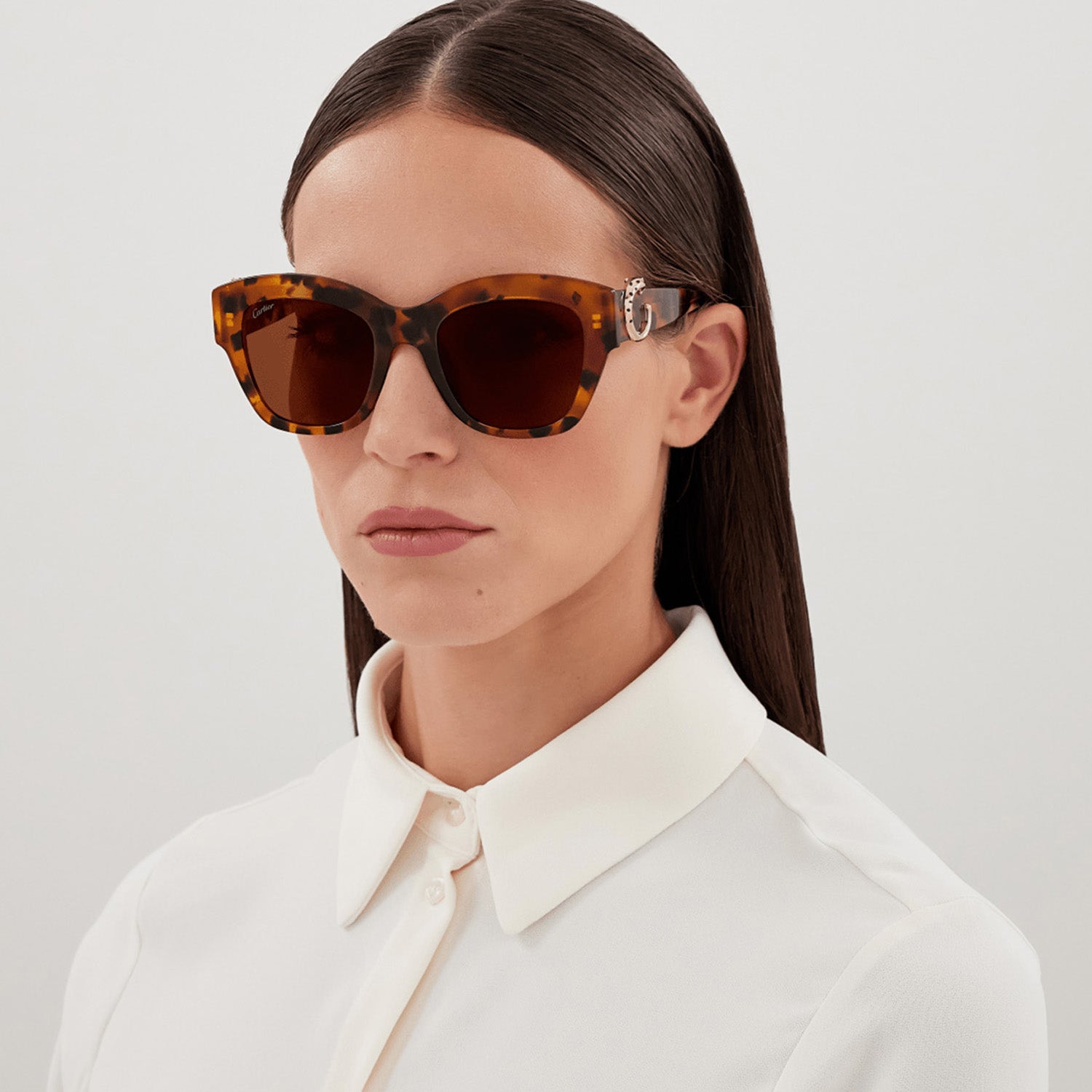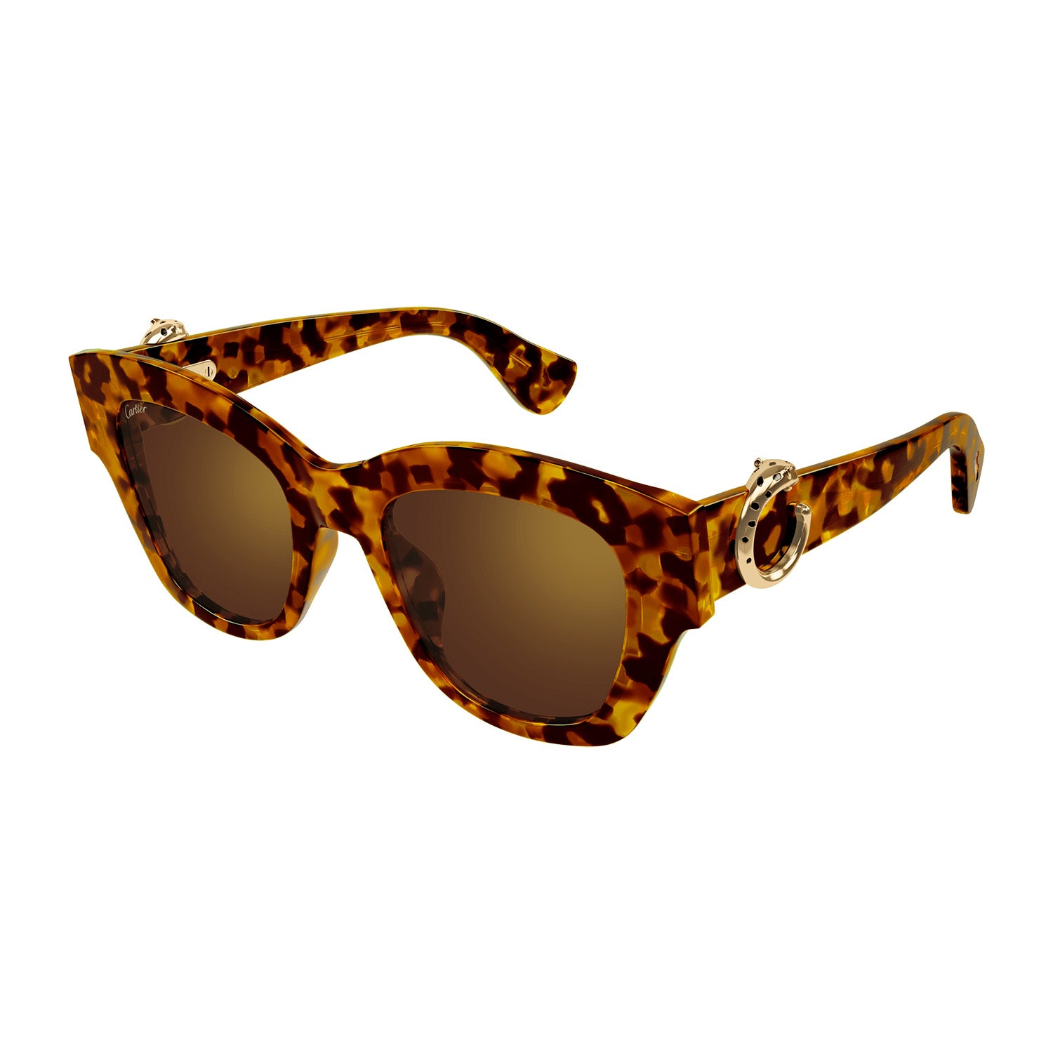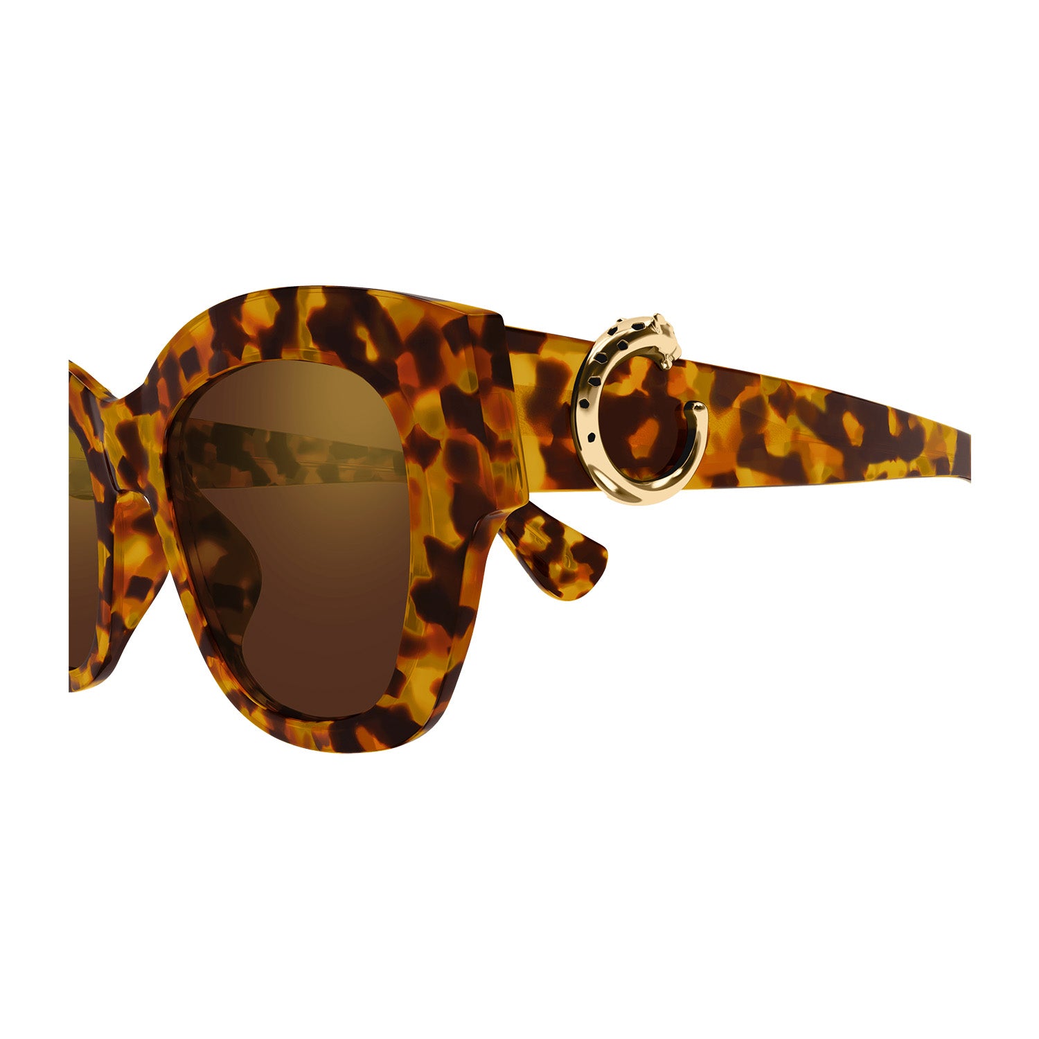 New lighter version of the existing Panthère C aesthetic characterized by thinner acetate profiles and harmonious proportions. Classic soft cat eye shape perfect for a feminine and sophisticated look. Iconic three-dimensional Panthère C detail decorated with hand-made enamel spots played as a jewelry signature on the temples. Precious finish in gold and platinum paired with new havana shades on some SKUs.