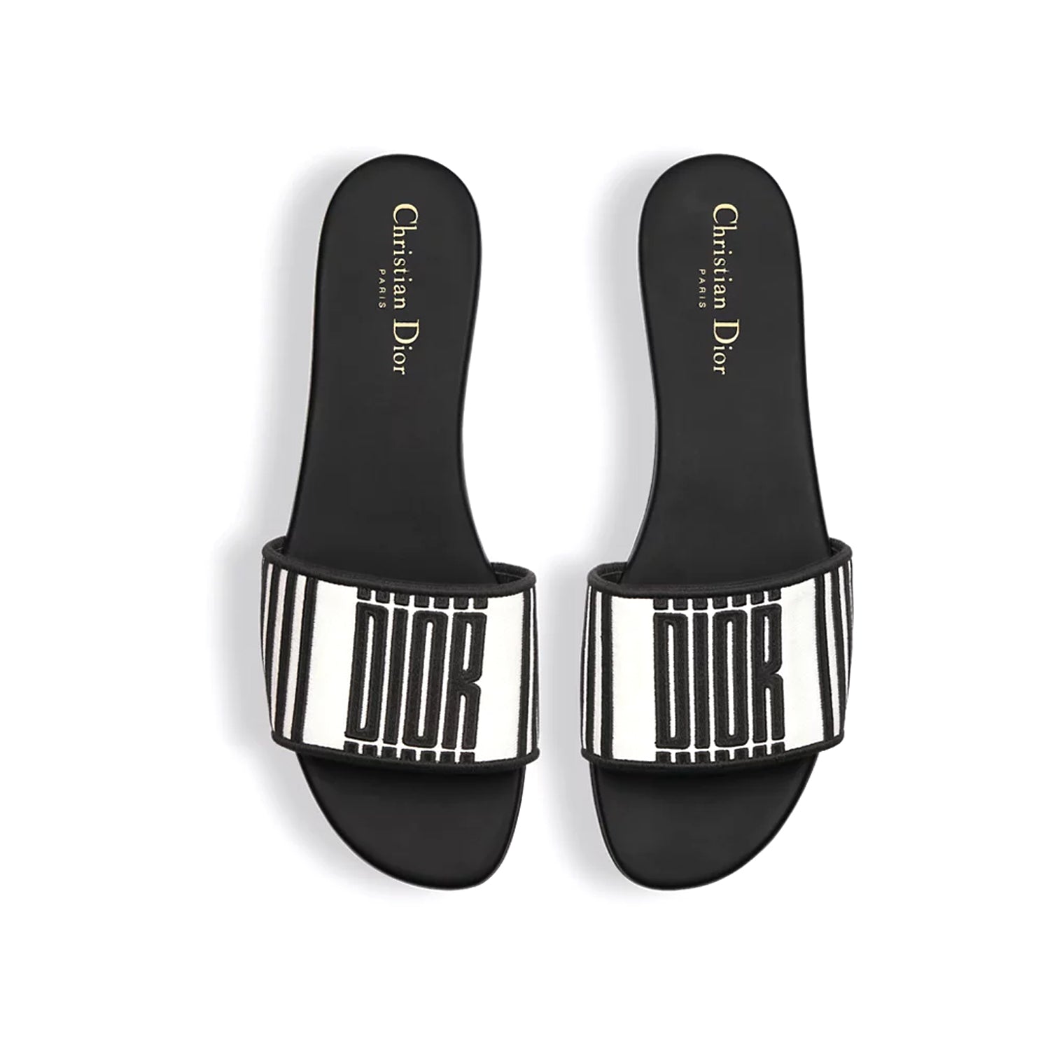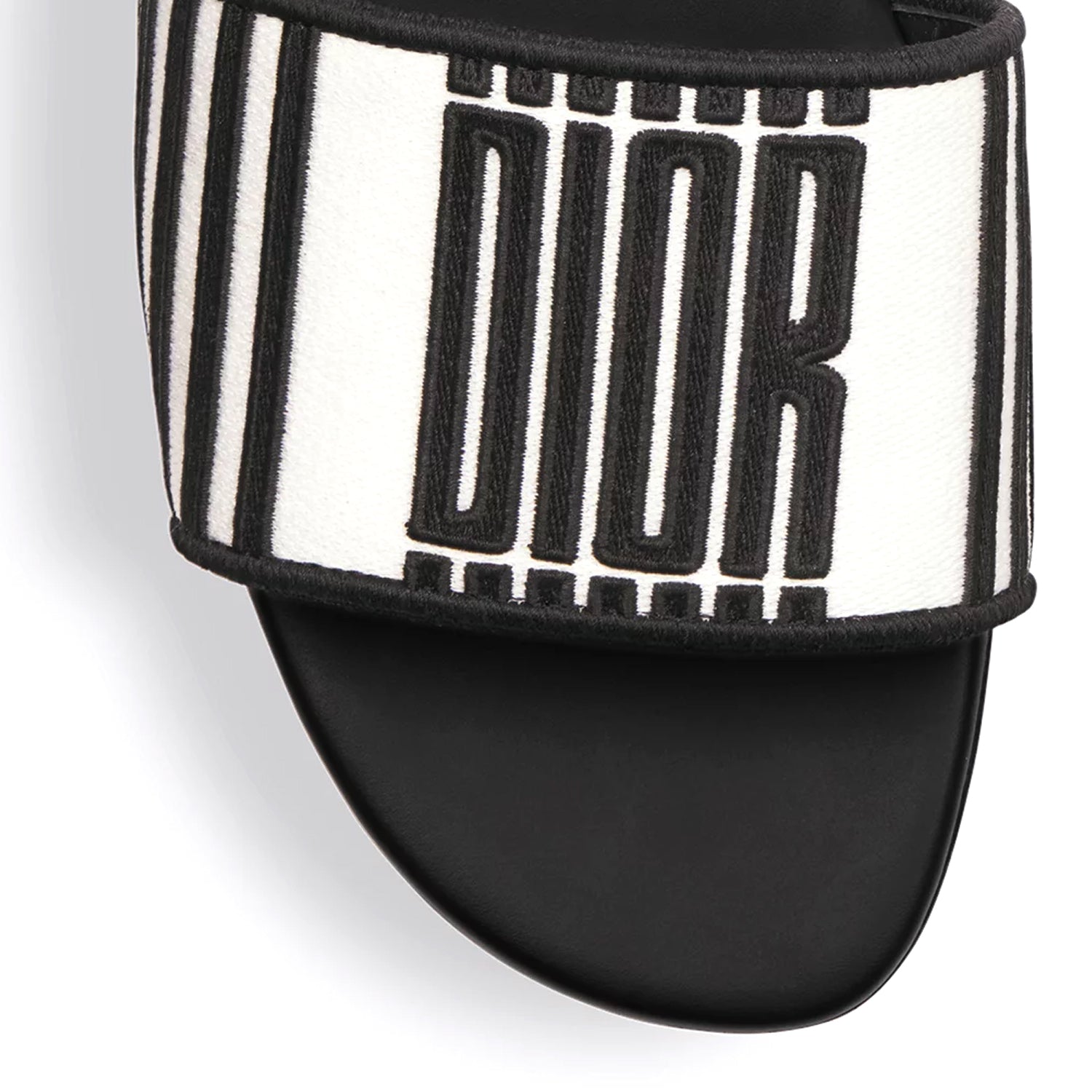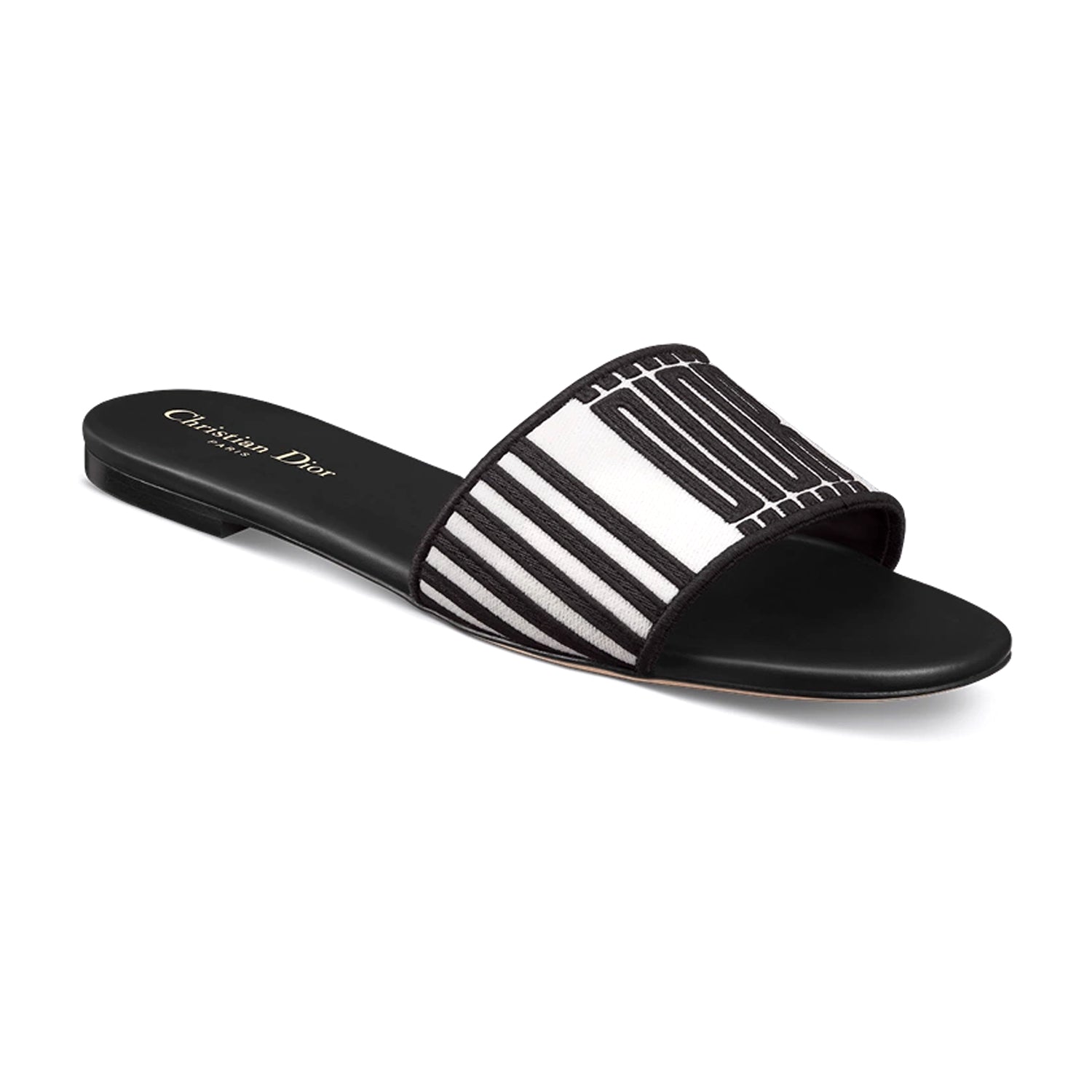 The Dway slide is iconic and timeless. The black and white embroidered cotton upper features the Dior Graphique motif, drawn from House archives and created by Marc Bohan in 1971. Its streamlined design makes it easy to slip on and coordinate with other Dior Graphique pieces from the collection.
