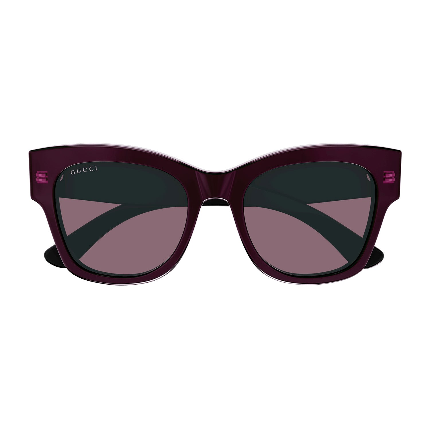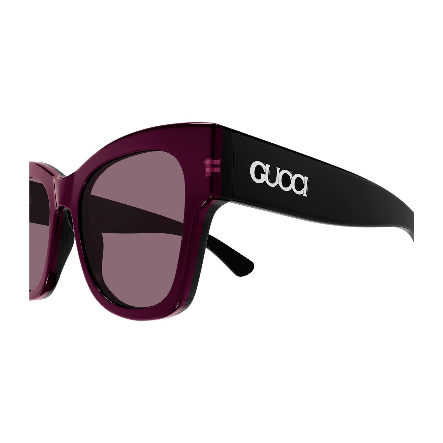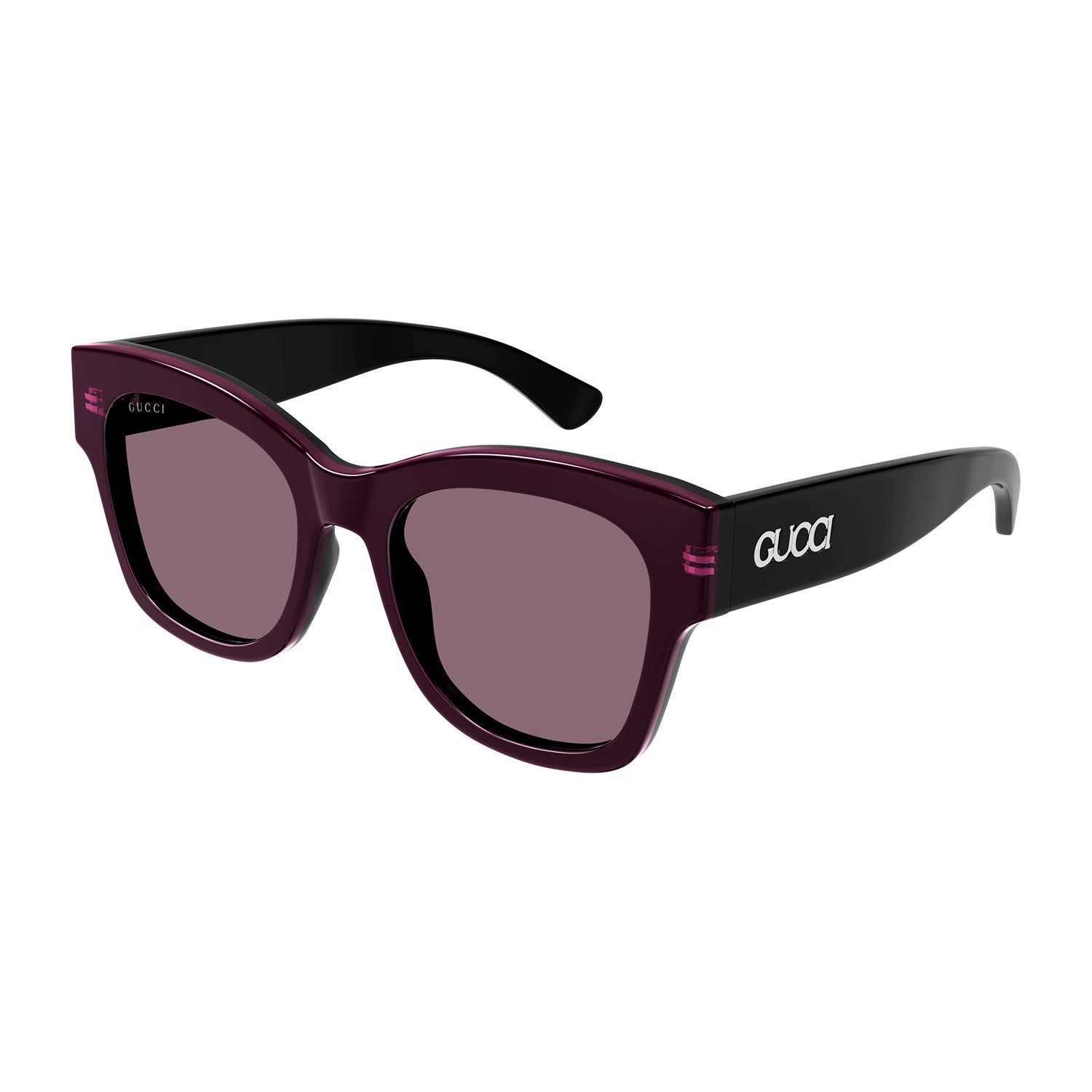 Acetate styles with a bi layered color effect which guarantee a cool look and feel. Oversize squared cat-eye. Gucci lettering logo placed under the laque of the construction. Commercial yet cool color palette featuring at least two color combinations.