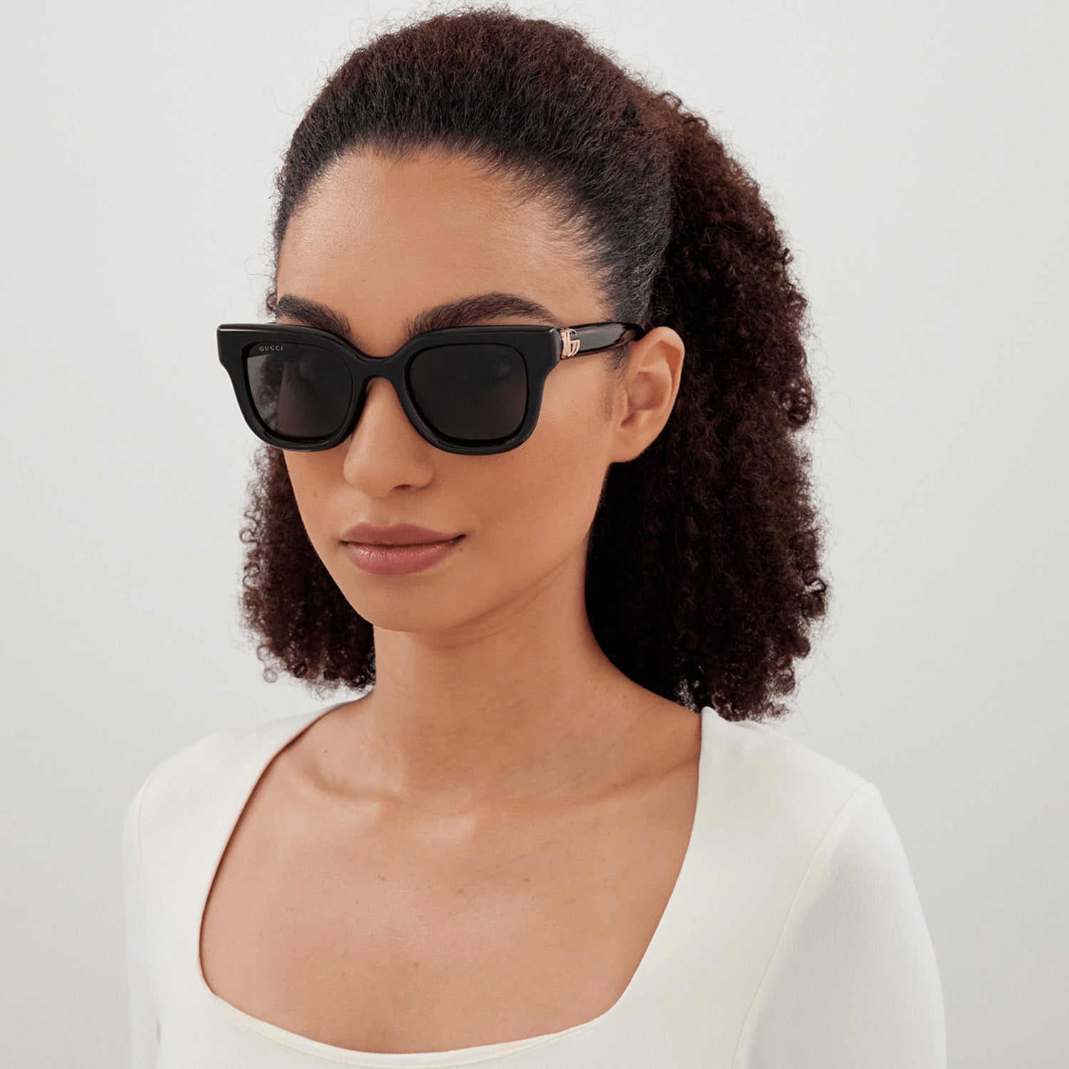 Sabato De Sarno's debut bag inspired, with a reference to the GG running logo embracing the curve of the bag. Squared cat-eye shape. Metal GG running logo embracing the curve of the temple. Commercial yet elegant femenine color palette.