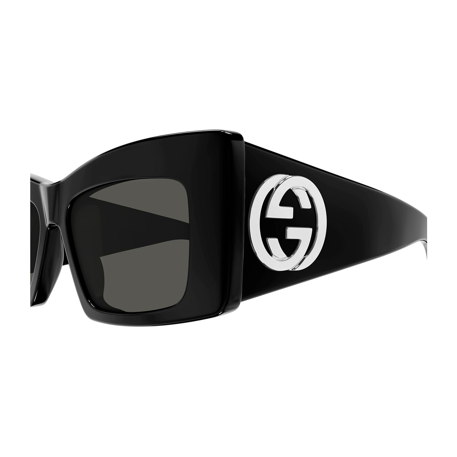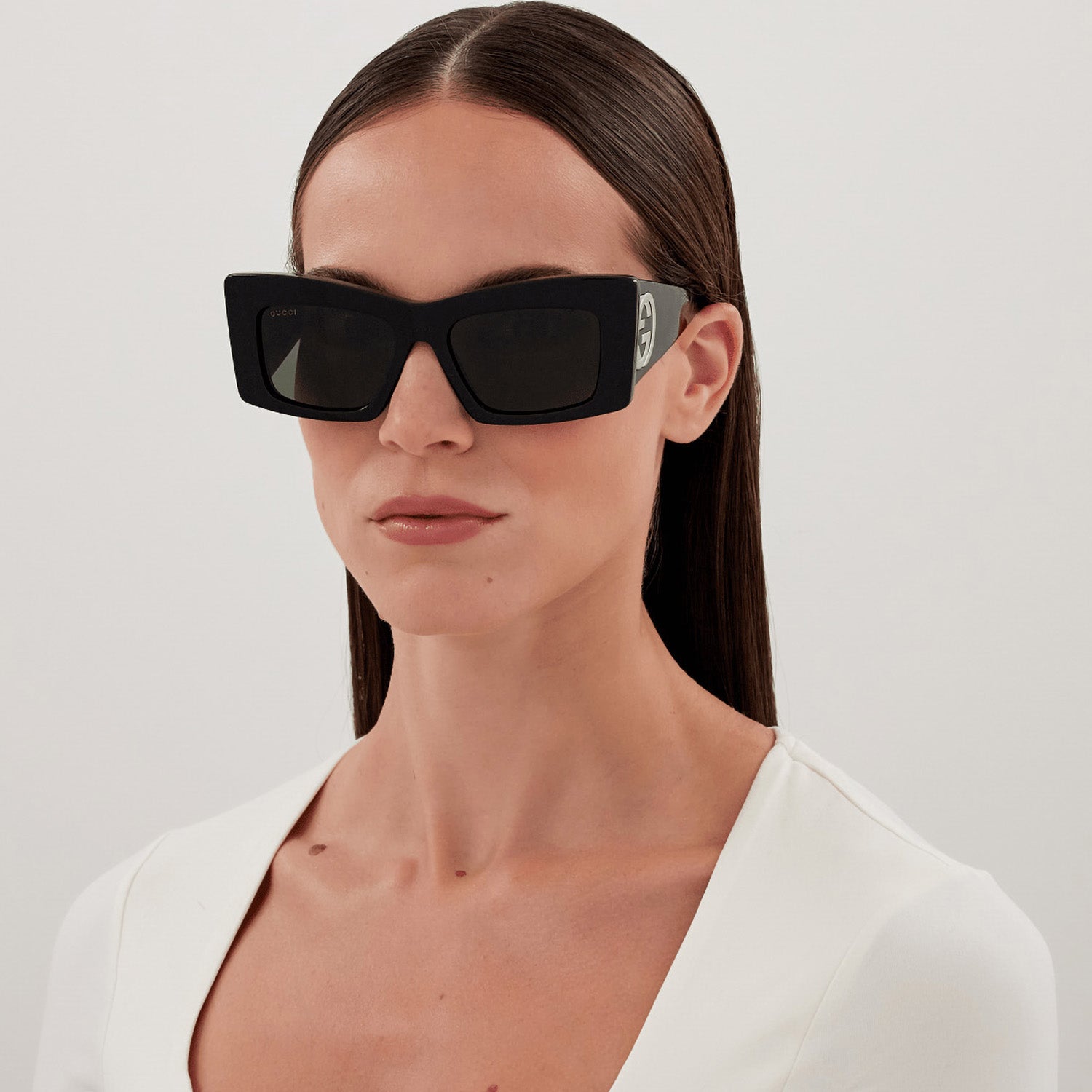 Oversized acetate styles embellished by thick and geometric constructions. Bold geometric cat-eye with a big temple. Flat GG interlocking logo on temple. Commercialyet cool color palette featuring at least two color combinations.