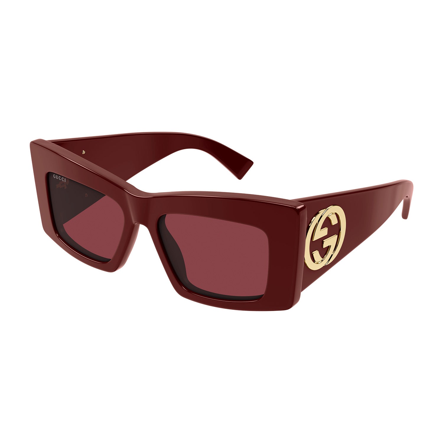 Oversized acetate styles embellished by thick and geometric constructions. Bold geometric cat-eye with a big temple. Flat GG interlocking logo on temple. Commercialyet cool color palette featuring at least two color combinations.