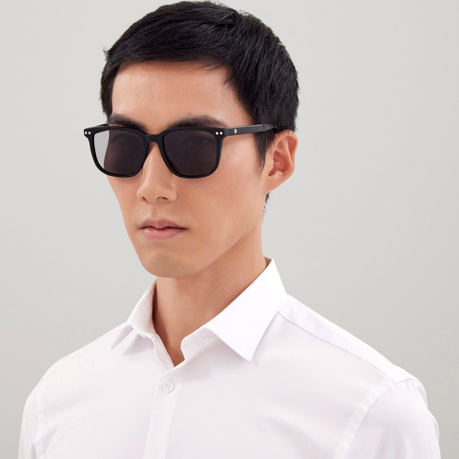 Sunglasses style inspired by the new creative aesthetic and aimed at glorifying the Snowcap icon. It features a wide squared shape and smooth acetate surfaces. New distinctive branding elements include the dedicated Snowcap metal rivets on front, the real Snowcap emblem on both temples (in small size) sorrounded by a metal ring, and dedicated wire core with Extreme 3.0 pattern. The style features a small height temple to further improve comfort and wearability. The color palette is timeless and masculine. It mixes classic black and havana with both dark and light grey hues.