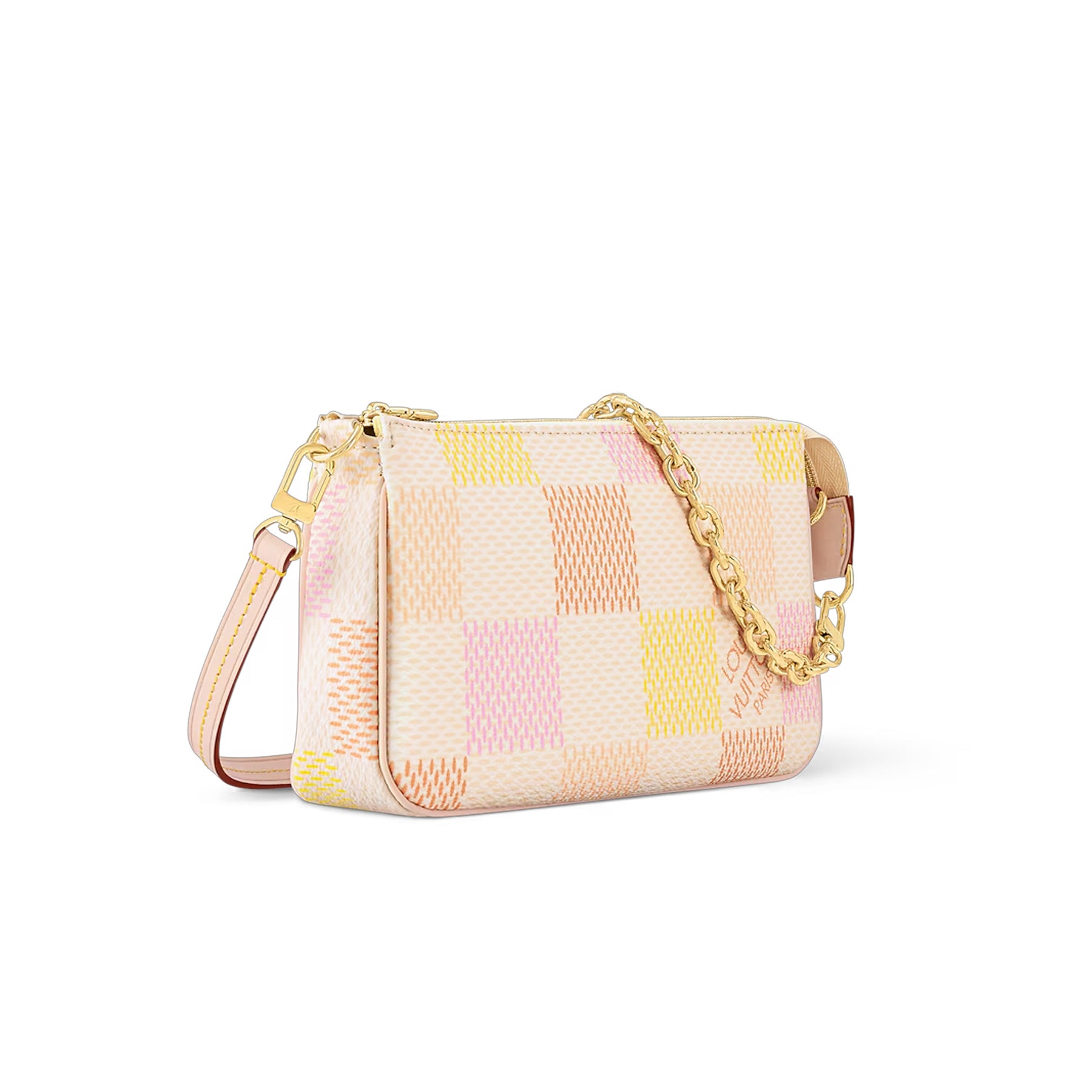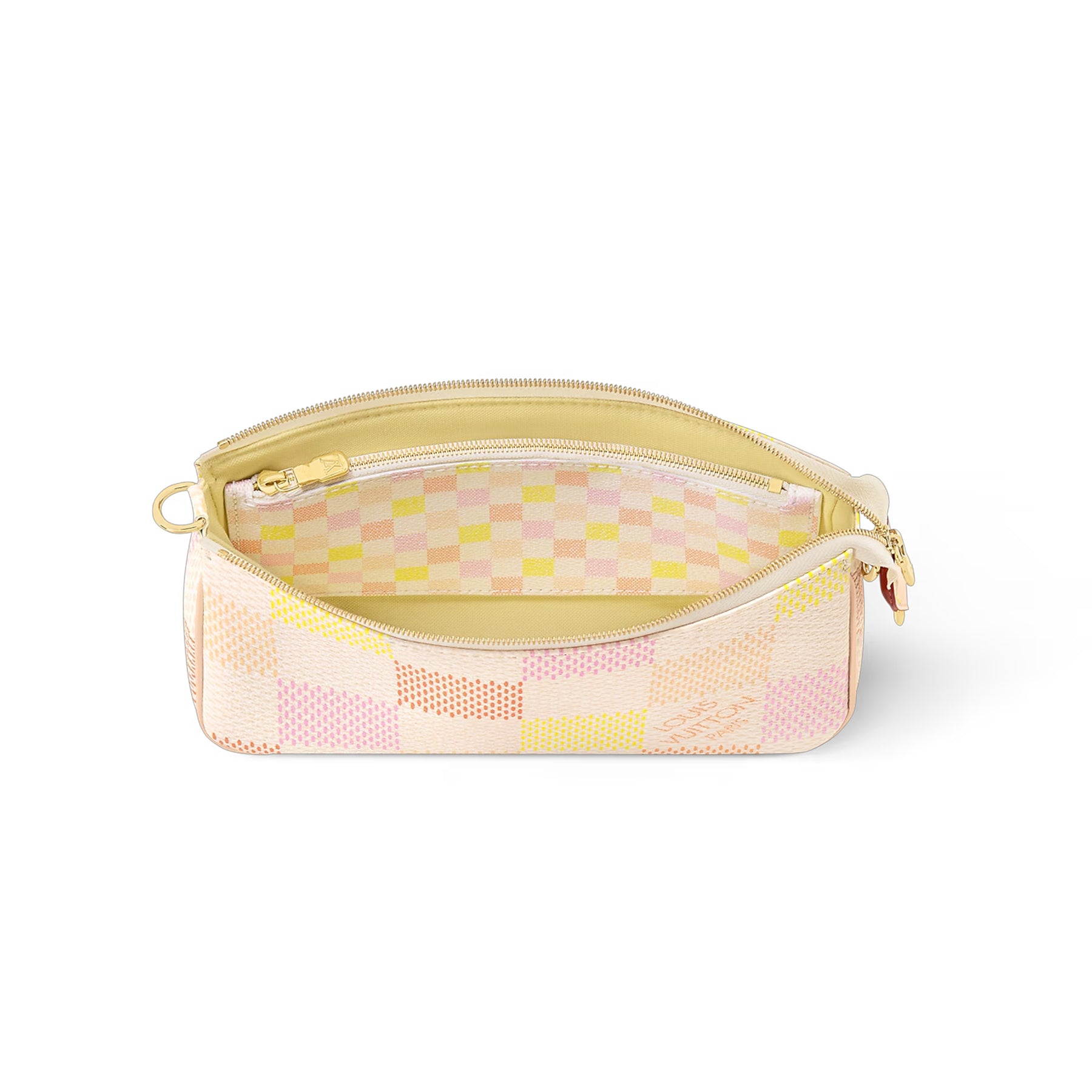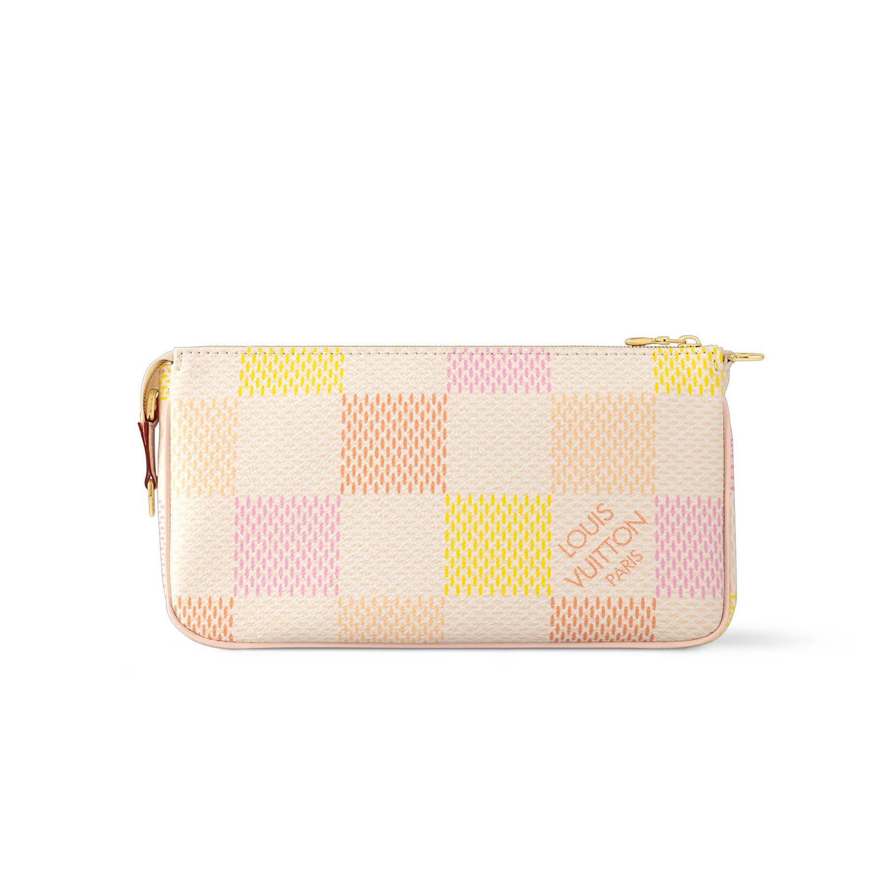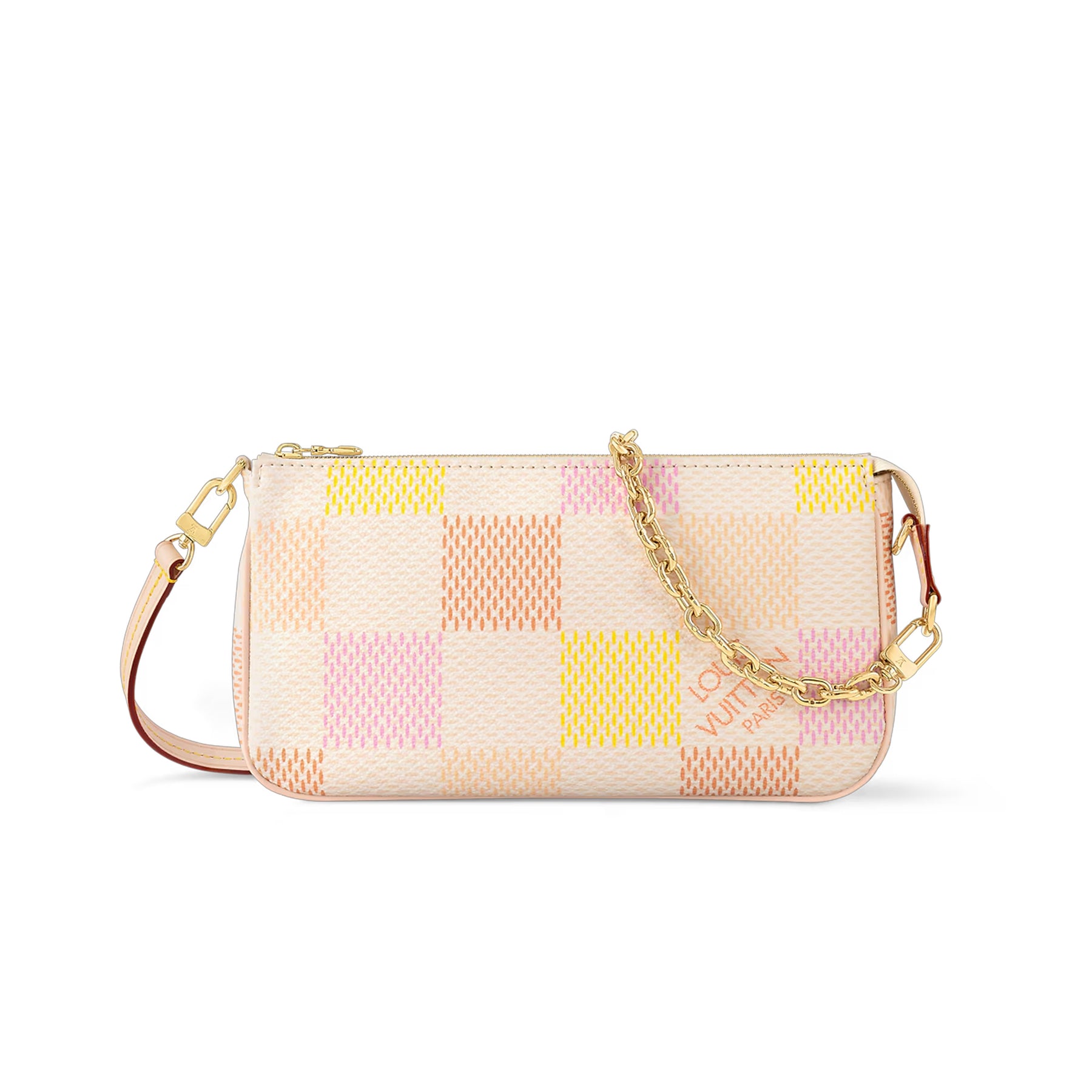 For the Damierlicious collection, the Pochette Accessoires comes in Damier canvas, which is reinterpreted in soft pastel shades and trimmed with Louis Vuitton's emblematic natural leather. This chic, feminine pouch unzips to reveal a large compartment with three pockets and two card slots. Its removable leather strap and gold-tone chain offer different looks and carry options.