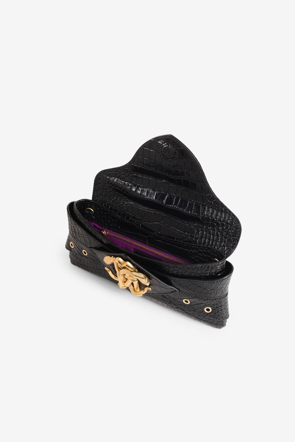 Made from black croc-embossed leather, this shoulder bag has a wraparound panel with gold-tone metal eyelets to match the Mirror Snake hardware that sits at the front flap.