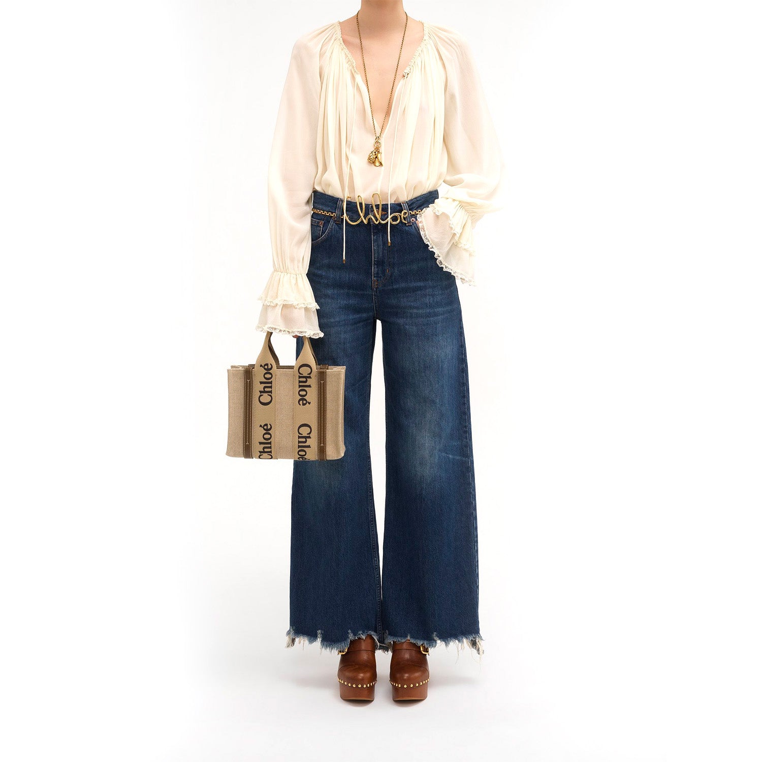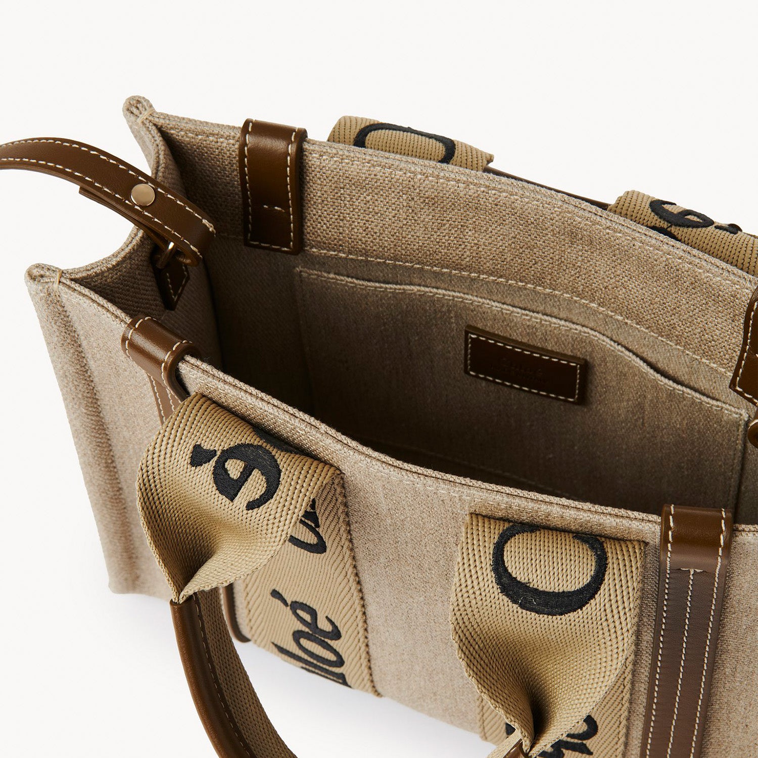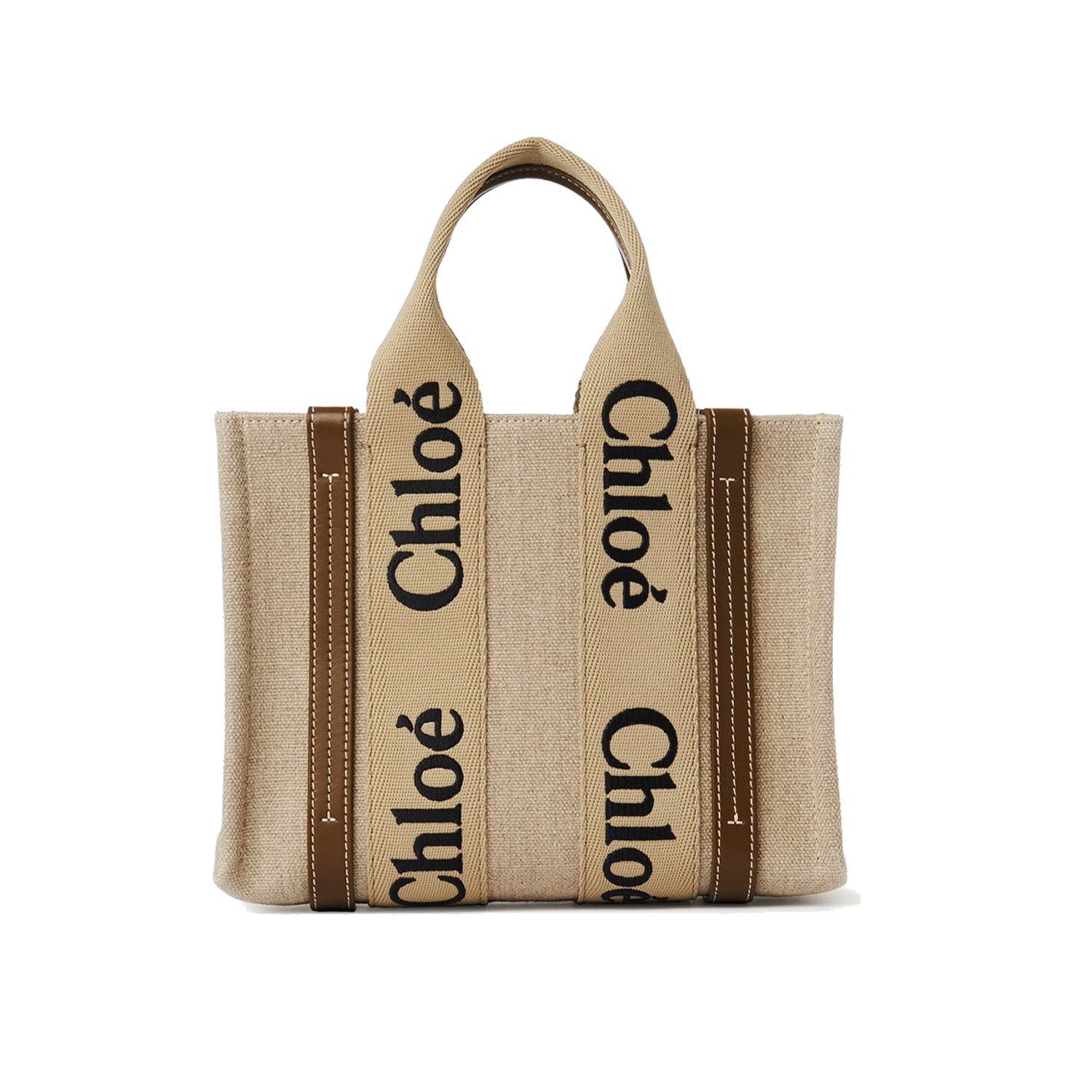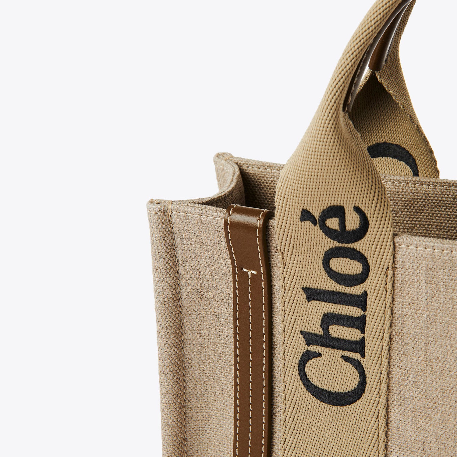 This small Woody tote bag is crafted from linen canvas, elevated by contrasting vertical strips in shiny calfskin and signature canvas ribbons embroidered with the Chloé logo.