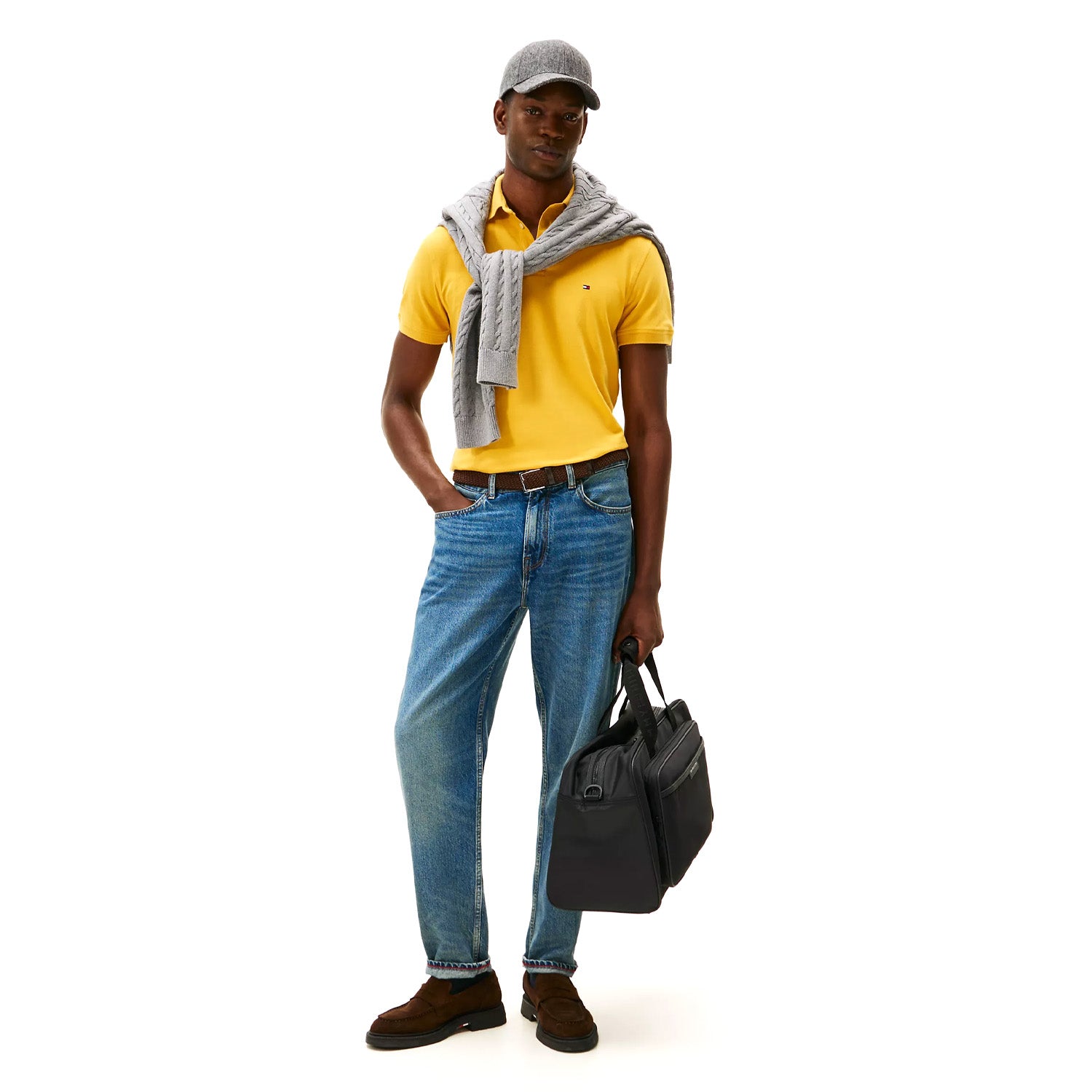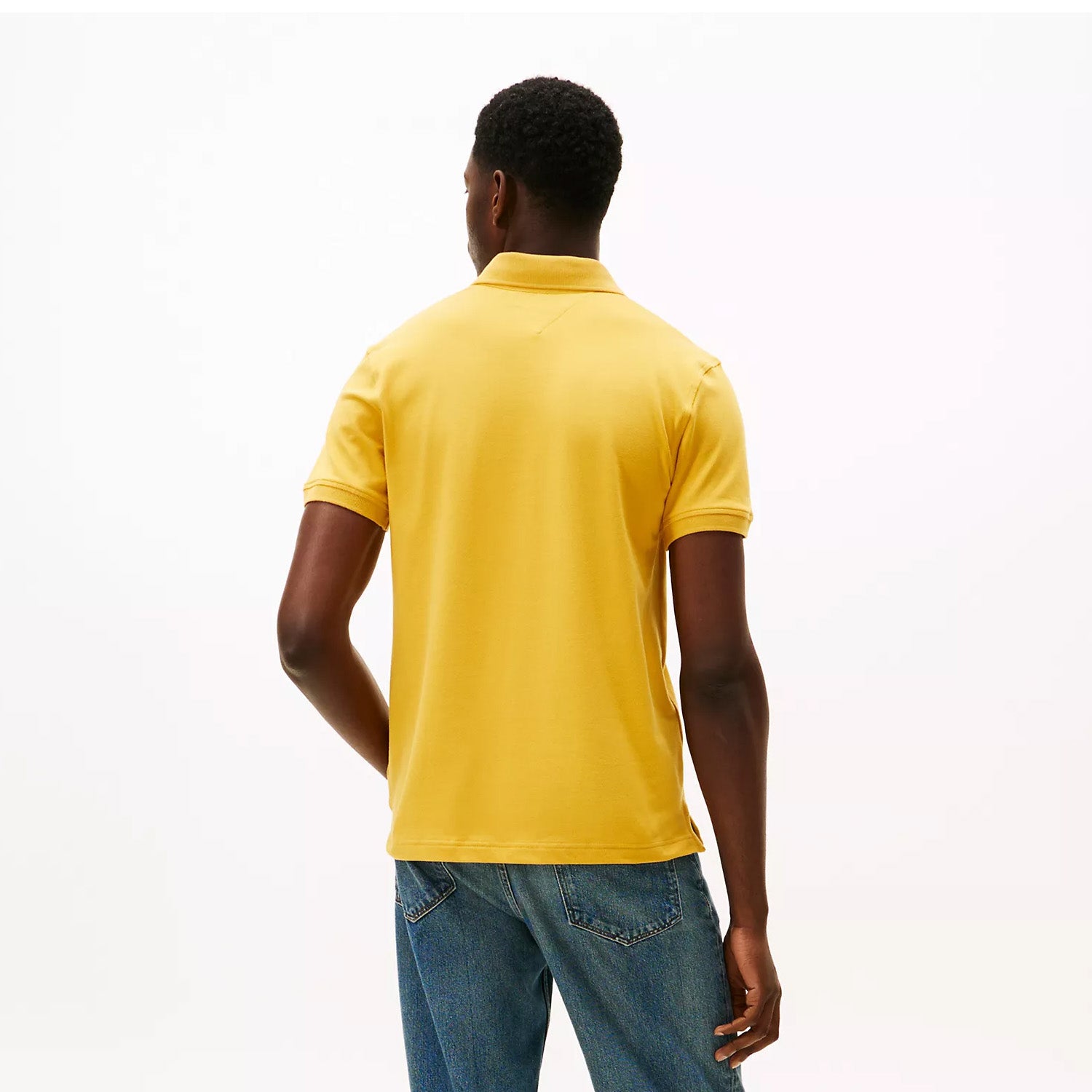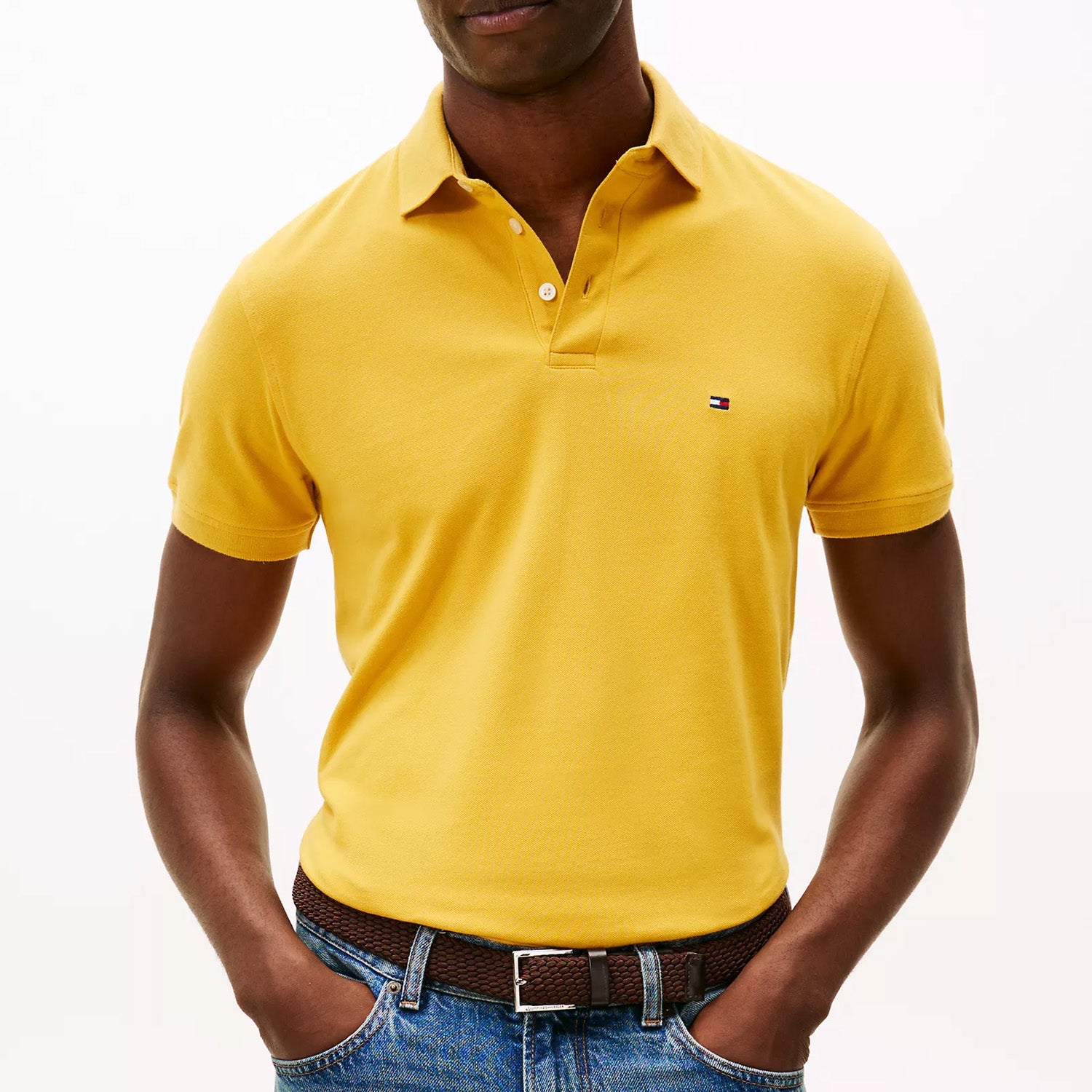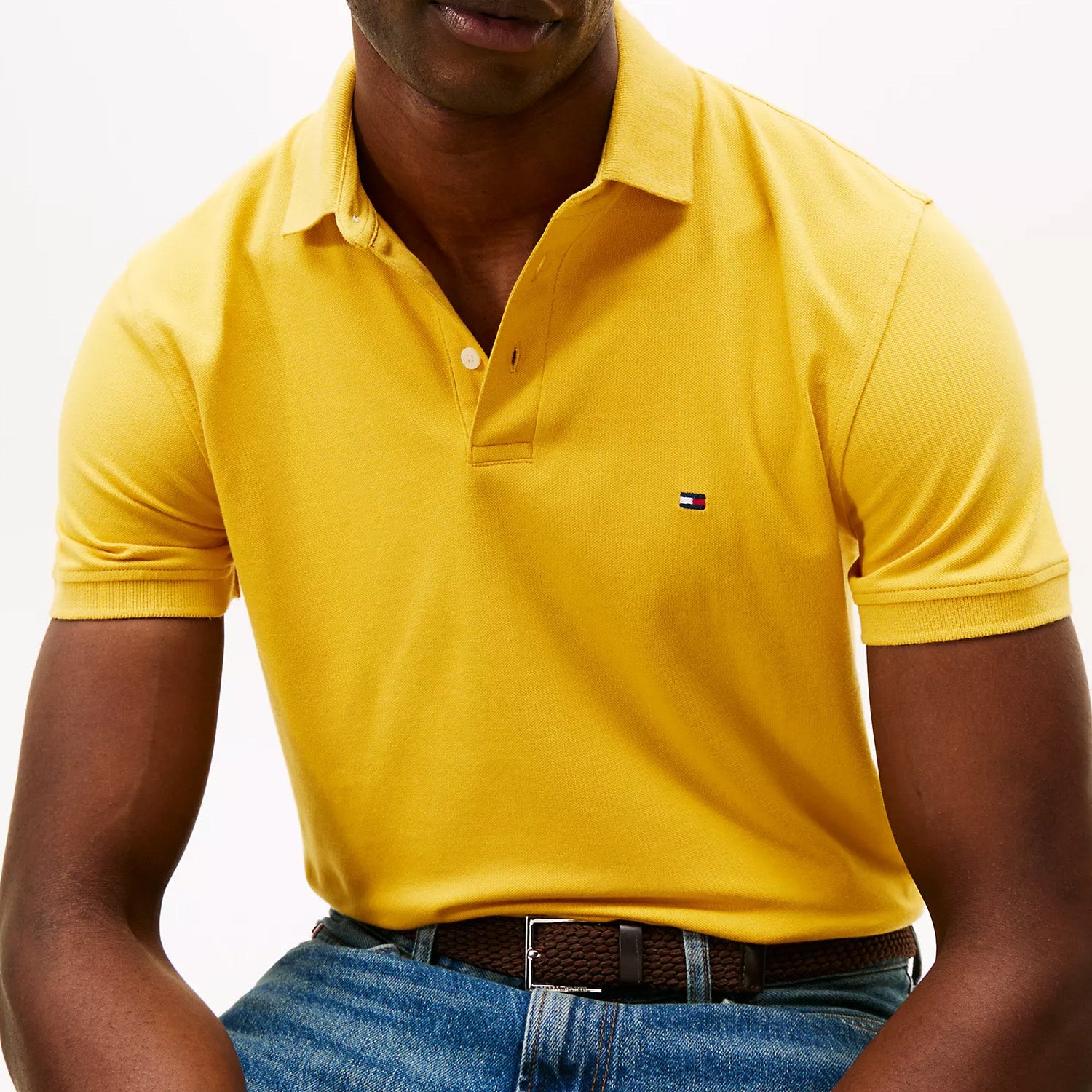Tommy Hilfiger men's polo. What we do best. Our slim-fit polo is made from premium cotton in a pique weave, known for its subtle, textured finish that adds dimension and breathability. The medium-weight stretch fabric strikes the ideal balance of structure and softness, offering long-lasting comfort.